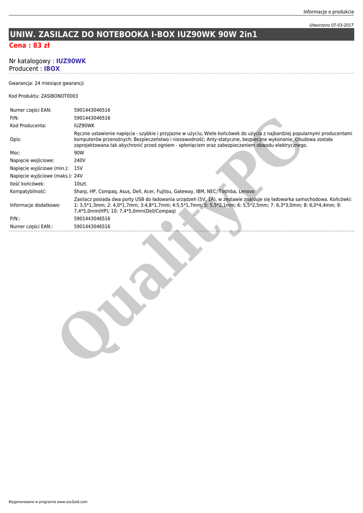 Informacje o produkcie Utworzono 07-03-2017 UNIW. ZASILACZ DO NOTEBOOKA I-BOX IUZ90WK 90W 2in1 Cena : 83 zł Nr katalogowy : IUZ90WK Producent : IBOX Gwarancja: 24 miesiące gwarancji Kod Produktu: ZASIBONOT0003 5901443046516 P/N: 5901443046516 Kod Producenta: IUZ90WK Opis: Ręczne ustawienie napięcia - szybkie i przyjazne w użyciu; Wiele końcówek do użycia z najbardziej popularnymi producentami komputerów przenośnych; Bezpieczeństwo i niezawodność; Anty-statyczne, bezpieczne wykonanie; Obudowa została zaprojektowana tak abychronić przed ogniem - spłonięciem oraz zabezpieczeniem obwodu elektrycznego. Moc: 90W Napięcie wejściowe: 240V Napięcie wyjściowe (min.): 15V yP Napięcie wyjściowe (maks.): 24V C Numer części EAN: 10szt. Kompatybilność: Sharp, HP, Compaq, Asus, Dell, Acer, Fujitsu, Gateway, IBM, NEC, Toshiba, Lenovo Informacje dodatkowe: Zasilacz posiada dwa porty USB do ładowania urządzeń (5V, 1A), w zestawie znajduje się ładowarka samochodowa. Końcówki: 1: 3,5*1,3mm; 2: 4,0*1,7mm; 3:4,8*1,7mm; 4:5,5*1,7mm; 5: 5,5*2,1mm; 6: 5,5*2,5mm; 7: 6,3*3,0mm; 8: 6,0*4,4mm; 9: 7,4*5,0mm(HP); 10: 7,4*5,0mm(Dell/Compaq) P/N:: 5901443046516 Numer części EAN:: 5901443046516 Q ua lit Ilość końcówek: Wygenerowano w programie www.oscGold.com