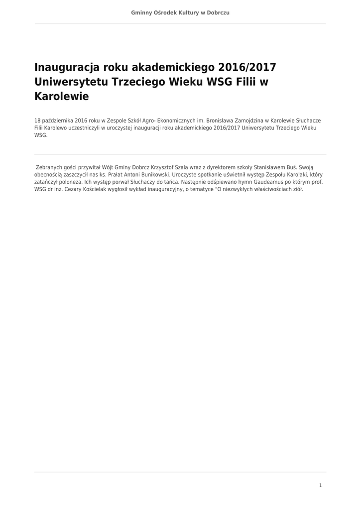 Gminny Ośrodek Kultury w Dobrczu Inauguracja roku akademickiego 2016/2017 Uniwersytetu Trzeciego Wieku WSG Filii w Karolewie 18 października 2016 roku w Zespole Szkół Agro- Ekonomicznych im. Bronisława Zamojdzina w Karolewie Słuchacze Filii Karolewo uczestniczyli w uroczystej inauguracji roku akademickiego 2016/2017 Uniwersytetu Trzeciego Wieku WSG. Zebranych gości przywitał Wójt Gminy Dobrcz Krzysztof Szala wraz z dyrektorem szkoły Stanisławem Buś. Swoją obecnością zaszczycił nas ks. Prałat Antoni Bunikowski. Uroczyste spotkanie uświetnił występ Zespołu Karolaki, który zatańczył poloneza. Ich występ porwał Słuchaczy do tańca. Następnie odśpiewano hymn Gaudeamus po którym prof. WSG dr inż. Cezary Kościelak wygłosił wykład inauguracyjny, o tematyce "O niezwykłych właściwościach ziół. 1