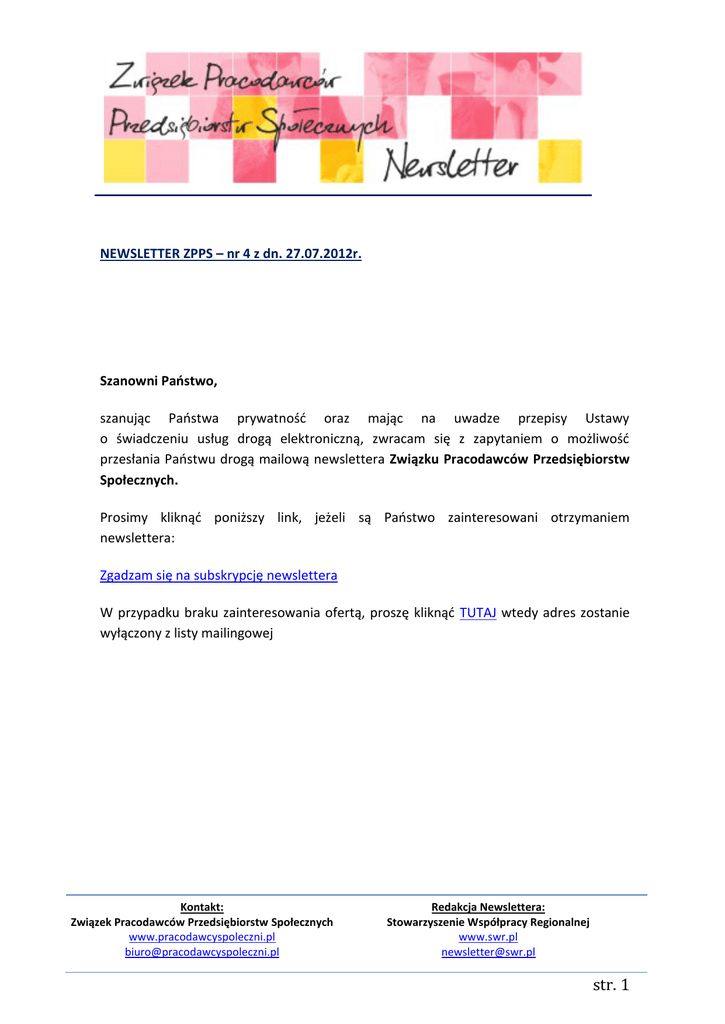 NEWSLETTER ZPPS – nr 4 z dn. 27.07.2012r. Szanowni Państwo, szanując Państwa prywatność oraz mając na uwadze przepisy Ustawy o świadczeniu usług drogą elektroniczną, zwracam się z zapytaniem o możliwość przesłania Państwu drogą mailową newslettera Związku Pracodawców Przedsiębiorstw Społecznych. Prosimy kliknąć poniższy link, jeżeli są Państwo zainteresowani otrzymaniem newslettera: Zgadzam się na subskrypcję newslettera W przypadku braku zainteresowania ofertą, proszę kliknąć TUTAJ wtedy adres zostanie wyłączony z listy mailingowej Kontakt: Związek Pracodawców Przedsiębiorstw Społecznych www.pracodawcyspoleczni.pl [email protected] Redakcja Newslettera: Stowarzyszenie Współpracy Regionalnej www.swr.pl [email protected] str. 1 Serdecznie zapraszamy do udziału w II Europejskim Kongresie Małych i Średnich Przedsiębiorstw, który odbędzie się w dniach 24-27 września 2012 r., gdzie w dniu 26 września odbędzie się m.in. panel organizowany przez Związek Pracodawców Przedsiębiorstw Społecznych i Stowarzyszenie Współpracy Regionalnej pt.: "MŚP a przedsiębiorstwo społeczne - konkurencja czy współpraca". Będzie to wyjątkowe spotkanie biznesowe skupiające przedstawicieli sektora MŚP i dużych firm, świata nauki, otoczenia biznesu, samorządów oraz administracji publicznej. W ciągu trzech dni Katowice przerodzą się w stolicę małej i średniej przedsiębiorczości, stając się płaszczyzną wielu debat i dyskusji nad obecnym stanem sektora MŚP w Polsce, wytyczeniem kierunków jego rozwoju oraz szansami, które stoją przed polską przedsiębiorczością. Hasłem przewodnim Kongresu jest „Nowoczesne zarządzanie w mikro, małej i średniej firmie”. Patronat Honorowy nad II Europejskim Kongresem Małych i Średnich Przedsiębiorstw objęli: Prezydent RP - Bronisław Komorowski Przewodniczący Komisji Europejskiej - José Manuel Barroso Przewodniczący Parlamentu Europejskiego - Martin Schulz Inauguracja Kongresu – 24 września 2012 rok Akademia Muzyczna w Katowicach. Sesje tematyczne - 25-27 września 2012 rok – Centrum Kongresowe na Uniwersytecie Śląskim w Katowicach. Udział w Kongresie jest bezpłatny. Oficjalna strona Kongresu: www.kongresmsp.eu Kontakt: Związek Pracodawców Przedsiębiorstw Społecznych www.pracodawcyspoleczni.pl [email protected] Redakcja Newslettera: Stowarzyszenie Współpracy Regionalnej www.swr.pl [email protected] str. 2 „BETTER FUTURE FOR SOCIAL ECONOMY” Odbyło spotkanie w Ministerstwie Rozwoju Regionalnego dotyczące projektu europejskiej sieci współpracy „Better future for social economy” („Lepsza przyszłość ekonomii społecznej”), realizowanego na mocy umowy pomiędzy Ministerstwem Rozwoju Regionalnego i Komisją Europejską (Dyrekcją Generalną ds. Zatrudnienia, Spraw Społecznych i Integracji Społecznej). ZPPS zgłosił swój akces jako partner w dalszych działaniach. W spotkaniu wzięli udział dwaj przedstawiciele Związku Pracodawców Przedsiębiorstw Społecznych. PROJEKT PI-PWP REPLIKATOR Jest nam miło poinformować, iż projekt pt: „PI-PWP REPLIKATOR” przygotowany przez Stowarzyszenie Współpracy Regionalnej został oceniony pozytywnie i rekomendowany do dofinansowania. Projekt będzie realizowany w ramach konkursu nr 1/POKL/7.2.1/IN/2011 dla Priorytetu VII Promocja integracji społecznej Programu Operacyjnego Kapitał Ludzki w województwie śląskim. Projekt ma na celu wdrożenie mechanizmu replikacji przedsiębiorstw społecznych z wykorzystaniem franczyzy społecznej i innych metod. Przewidywany czas rozpoczęcia realizacji projektu to październik 2012r. SPOTKANIE Z EKONOMIĄ W URZĘDZIE MARSZAŁKOWSKIM Jak prowadzić biznes w spółdzielniach socjalnych i na co zwracać uwagę je prowadząc? Na te oraz wiele innych pytań można było poznać odpowiedzi we wtorek w Podkarpackim Urzędzie Marszałkowskim. Kontakt: Związek Pracodawców Przedsiębiorstw Społecznych www.pracodawcyspoleczni.pl [email protected] Redakcja Newslettera: Stowarzyszenie Współpracy Regionalnej www.swr.pl [email protected] str. 3 Podczas spotkania z cyklu Spółdzielcze Spotkania z Ekonomią Społeczną, uczestnicy dowiedzieli się jakie szanse i zagrożenia wynikają dla naszego regionu w związku z nową perspektywą finansową na lata 2014-2020. Wykład w tym zakresie wygłosił Cezary Miżejewski, Prezes Ogólnopolskiego Związku Rewizyjnego Spółdzielni Socjalnych. Interesujące było również spotkanie z Barbarą Pawlak z TV Rzeszów, która wyjaśniała dla czego wizerunek w mediach jest tak ważne oraz jak o niego dbać. Warto również wspomnieć o ciekawym wykładzie Kamila Zielińskiego – Prezesa Spółdzielni KGB dotyczącym prowadzenia działalności gospodarczej i sprzedaży. Z kolei Bartosz Kostecki - Kierownik Wydziału Rozwoju Integracji Społecznej Wojewódzkiego Urzędu Pracy mówił o obszarach działań i ilości spółdzielni socjalnych na Podkarpaciu. Poza wykładami można było podyskutować ze specjalistami w dziedzinie ekonomii społecznej i spółdzielni socjalnych. Goście podkreślali serdeczną atmosferę spotkania i wysoki poziom merytoryczny. Oprócz Rzeszowa Spółdzielcze Spotkania z Ekonomią Społeczną odbyły się także w Leżajsku i Tarnobrzegu. Organizatorem była Spółdzielnia socjalna Dębianka, a partnerami Wojewódzki Urząd Pracy i Program Narodów Zjednoczonych ds. Rozwoju. Kontakt: Związek Pracodawców Przedsiębiorstw Społecznych www.pracodawcyspoleczni.pl [email protected] Redakcja Newslettera: Stowarzyszenie Współpracy Regionalnej www.swr.pl [email protected] str. 4 Informacje z Unii Europejskiej Zaproszenie do składania wniosków(VP/2012/001) Relacje przemysłowe i Dialog Społeczny– Ostateczny termin składania to 04 września 2012 dla akcji rozpoczynających się 4 Listopada 2012 i nie później 21 Grudnia 2012. Źródło: http://ec.europa.eu/social/main.jsp?catId=630&langId=en&callId=334&furtherCall s=