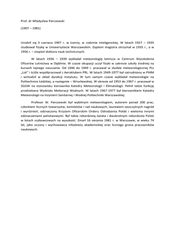 Prof. dr Władysław Parczewski (1907 – 1981) Urodził się 3 czerwca 1907 r. w Łomży, w rodzinie inteligenckiej. W latach 1927 – 1935 studiował fizykę w Uniwersytecie Warszawskim. Dyplom magistra otrzymał w 1935 r., a w 1956 r. – stopieo doktora nauk technicznych. W latach 1936 – 1939 wykładał meteorologię lotnicza w Centrum Wyszkolenia Oficerów Lotnictwa w Dęblinie. W czasie okupacji uczył fizyki w zakresie szkoły średniej na kursach tajnego nauczania. Od 1946 do 1949 r. pracował w służbie meteorologicznej PLL „Lot” i ściśle współpracował z Aeroklubem PRL. W latach 1949-1977 był zatrudniony w PIHM i wchodził w skład dyrekcji Instytutu. W tym samym czasie wykładał meteorologie na Politechnice Łódzkiej, a następnie – Wrocławskiej. W okresie od 1953 do 1967 r. pracował w SGGW na stanowisku kierownika Katedry Meteorologii i Klimatologii. Pełnił także funkcję prodziekana Wydziału Melioracji Wodnych. W latach 1967-1977 był kierownikiem Katedry Meteorologii na Inżynierii Sanitarnej i Wodnej Politechniki Warszawskiej. Profesor W. Parczewski był wybitnym meteorologiem, autorem ponad 200 prac, członkiem licznych towarzystw, komitetów i rad naukowych, laureatem zaszczytnych nagród i wyróżnieo, odznaczony Krzyżem Oficerskim Orderu Odrodzenia Polski i wieloma innymi odznaczeniami paostwowymi. Był także rekordzistą świata i dwukrotnym rekordzista Polski w lotach szybowcowych na wysokośd. Zmarł 16 sierpnia 1981 r. w Warszawie, w wieku 74 lat, jako uczony i wychowawca młodzieży akademickiej oraz licznego grona pracowników naukowych.