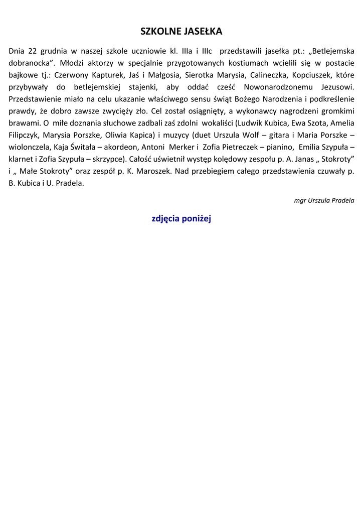 SZKOLNE JASEŁKA Dnia 22 grudnia w naszej szkole uczniowie kl. IIIa i IIIc przedstawili jasełka pt.: „Betlejemska dobranocka”. Młodzi aktorzy w specjalnie przygotowanych kostiumach wcielili się w postacie bajkowe tj.: Czerwony Kapturek, Jaś i Małgosia, Sierotka Marysia, Calineczka, Kopciuszek, które przybywały do betlejemskiej stajenki, aby oddać cześć Nowonarodzonemu Jezusowi. Przedstawienie miało na celu ukazanie właściwego sensu świąt Bożego Narodzenia i podkreślenie prawdy, że dobro zawsze zwycięży zło. Cel został osiągnięty, a wykonawcy nagrodzeni gromkimi brawami. O miłe doznania słuchowe zadbali zaś zdolni wokaliści (Ludwik Kubica, Ewa Szota, Amelia Filipczyk, Marysia Porszke, Oliwia Kapica) i muzycy (duet Urszula Wolf – gitara i Maria Porszke – wiolonczela, Kaja Świtała – akordeon, Antoni Merker i Zofia Pietreczek – pianino, Emilia Szypuła – klarnet i Zofia Szypuła – skrzypce). Całość uświetnił występ kolędowy zespołu p. A. Janas „ Stokroty” i „ Małe Stokroty” oraz zespół p. K. Maroszek. Nad przebiegiem całego przedstawienia czuwały p. B. Kubica i U. Pradela. mgr Urszula Pradela zdjęcia poniżej