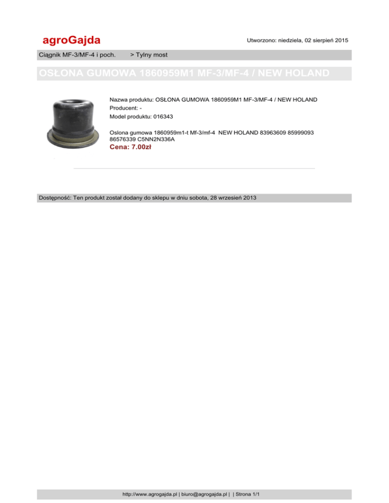 agroGajda Utworzono: niedziela, 02 sierpień 2015 Ciągnik MF-3/MF-4 i poch. > Tylny most OSŁONA GUMOWA 1860959M1 MF-3/MF-4 / NEW HOLAND Nazwa produktu: OSŁONA GUMOWA 1860959M1 MF-3/MF-4 / NEW HOLAND Producent: Model produktu: 016343 Oslona gumowa 1860959m1-t Mf-3/mf-4 NEW HOLAND 83963609 85999093 86576339 C5NN2N336A Cena: 7.00zł Dostępność: Ten produkt został dodany do sklepu w dniu sobota, 28 wrzesień 2013 http://www.agrogajda.pl | [email protected] | | Strona 1/1