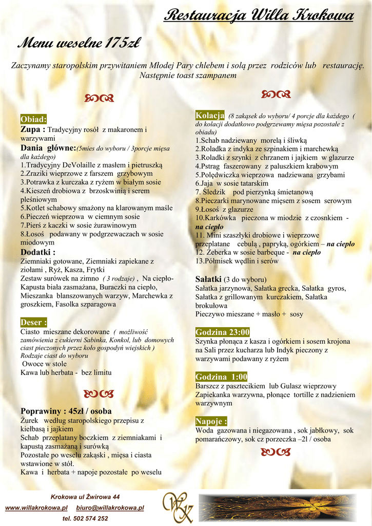 Restauracja Willa Krokowa Menu weselne 175zł Zaczynamy staropolskim przywitaniem Młodej Pary chlebem i solą przez rodziców lub restaurację. Następnie toast szampanem Obiad: Zupa : Tradycyjny rosół z makaronem i warzywami Dania główne:(5mies do wyboru / 3porcje mięsa dla każdego) 1.Tradycyjny DeVolaille z masłem i pietruszką 2.Zraziki wieprzowe z farszem grzybowym 3.Potrawka z kurczaka z ryżem w białym sosie 4.Kieszeń drobiowa z brzoskwinią i serem pleśniowym 5.Kotlet schabowy smażony na klarowanym maśle 6.Pieczeń wieprzowa w ciemnym sosie 7.Pierś z kaczki w sosie żurawinowym 8.Łosoś podawany w podgrzewaczach w sosie miodowym Dodatki : Ziemniaki gotowane, Ziemniaki zapiekane z ziołami , Ryż, Kasza, Frytki Zestaw surówek na zimno ( 3 rodzaje) , Na ciepłoKapusta biała zasmażana, Buraczki na ciepło, Mieszanka blanszowanych warzyw, Marchewka z groszkiem, Fasolka szparagowa (8 zakąsek do wyboru/ 4 porcje dla każdego ( do kolacji dodatkowo podgrzewamy mięsa pozostałe z obiadu) Kolacja 1.Schab nadziewany morelą i śliwką 2.Roladka z indyka ze szpinakiem i marchewką 3.Roladki z szynki z chrzanem i jajkiem w glazurze 4.Pstrag faszerowany z paluszkiem krabowym 5.Polędwiczka wieprzowa nadziewana grzybami 6.Jaja w sosie tatarskim 7. Śledzik pod pierzynką śmietanową 8.Pieczarki marynowane mięsem z sosem serowym 9.Łosoś z glazurze 10.Karkówka pieczona w miodzie z czosnkiem na ciepło 11. Mini szaszłyki drobiowe i wieprzowe przeplatane cebulą , papryką, ogórkiem – na ciepło 12. Żeberka w sosie barbeque - na ciepło 13.Półmisek wędlin i serów Sałatki (3 do wyboru) Sałatka jarzynowa, Sałatka grecka, Sałatka gyros, Sałatka z grillowanym kurczakiem, Sałatka brokułowa Pieczywo mieszane + masło + sosy Deser : Ciasto mieszane dekorowane ( możliwość zamówienia z cukierni Sabinka, Konkol, lub domowych ciast pieczonych przez koło gospodyń wiejskich ) Rodzaje ciast do wyboru Owoce w stole Kawa lub herbata - bez limitu Poprawiny : 45zł / osoba Żurek według staropolskiego przepisu z kiełbasą i jajkiem Schab przeplatany boczkiem z ziemniakami i kapustą zasmażaną i surówką Pozostałe po weselu zakąski , mięsa i ciasta wstawione w stół. Kawa i herbata + napoje pozostałe po weselu . Krokowa ul Żwirowa 44 www.willakrokowa.pl [email protected] tel. 502 574 252 Godzina 23:00 Szynka płonąca z kasza i ogórkiem i sosem krojona na Sali przez kucharza lub Indyk pieczony z warzywami podawany z ryżem Godzina 1:00 Barszcz z pasztecikiem lub Gulasz wieprzowy Zapiekanka warzywna, płonące tortille z nadzieniem warzywnym Napoje : Woda gazowana i niegazowana , sok jabłkowy, sok pomarańczowy, sok cz porzeczka –2l / osoba