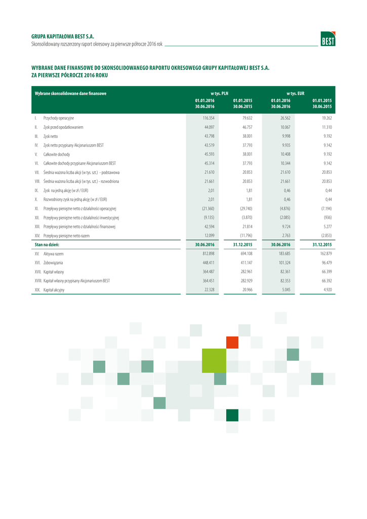 GRUPA KAPITAŁOWA BEST S.A. Skonsolidowany rozszerzony raport okresowy za pierwsze półrocze 2016 rok WYBRANE DANE FINANSOWE DO SKONSOLIDOWANEGO RAPORTU OKRESOWEGO GRUPY KAPITAŁOWEJ BEST S.A. ZA PIERWSZE PÓŁROCZE 2016 ROKU Wybrane skonsolidowane dane finansowe w tys. PLN 01.01.2016 30.06.2016 01.01.2015 30.06.2015 w tys. EUR 01.01.2016 30.06.2016 01.01.2015 30.06.2015 116.354 79.632 26.562 19.262 II. Zysk przed opodatkowaniem 44.097 46.757 10.067 11.310 III.Zysk netto 43.798 38.001 9.998 9.192 IV. Zysk netto przypisany Akcjonariuszom BEST 43.519 37.793 9.935 9.142 V. Całkowite dochody 45.593 38.001 10.408 9.192 VI.Całkowite dochody przypisane Akcjonariuszom BEST 45.314 37.793 10.344 9.142 VII.Średnia ważona liczba akcji (w tys. szt.) - podstawowa 21.610 20.853 21.610 20.853 VIII.Średnia ważona liczba akcji (w tys. szt.) - rozwodniona I. Przychody operacyjne 21.661 20.853 21.661 20.853 IX.Zysk na jedną akcję (w zł / EUR) 2,01 1,81 0,46 0,44 X. Rozwodniony zysk na jedną akcję (w zł / EUR) 2,01 1,81 0,46 0,44 XI.Przepływy pieniężne netto z działalności operacyjnej (21.360) (29.740) (4.876) (7.194) XII.Przepływy pieniężne netto z działalności inwestycyjnej (9.135) (3.870) (2.085) (936) XIII.Przepływy pieniężne netto z działalności finansowej 42.594 21.814 9.724 5.277 12.099 (11.796) 2.763 (2.853) 30.06.2016 31.12.2015 30.06.2016 31.12.2015 XV.Aktywa razem 812.898 694.108 183.685 162.879 XVI.Zobowiązania 448.411 411.147 101.324 96.479 XVII. Kapitał własny 364.487 282.961 82.361 66.399 XVIII. Kapitał własny przypisany Akcjonariuszom BEST 364.451 282.929 82.353 66.392 22.328 20.966 5.045 4.920 XIV.Przepływy pieniężne netto razem Stan na dzień: XIX.Kapitał akcyjny GRUPA KAPITAŁOWA BEST S.A. Skonsolidowany rozszerzony raport okresowy za pierwsze półrocze 2016 rok Wybrane jednostkowe dane finansowe w tys. PLN 01.01.2016 30.06.2016 01.01.2015 30.06.2015 w tys. EUR 01.01.2016 30.06.2016 01.01.2015 30.06.2015 I. Przychody operacyjne 48.464 100.720 11.064 24.363 II. Zysk (strata) przed opodatkowaniem (5.279) 81.072 (1.205) 19.611 III.Zysk (strata) netto (6.492) 66.179 (1.482) 16.008 IV. Całkowite dochody (6.492) 3.690 (1.482) 893 V. Średnia ważona liczba akcji (w tys. szt.) - podstawowa 21.610 20.853 21.610 20.853 VI.Średnia ważona liczba akcji (w tys. szt.) - rozwodniona 21.661 20.853 21.661 20.853 VII.Zysk (strata) na jedną akcję (w zł / EUR) (0,30) 3,17 (0,07) 0,77 VIII.Rozwodniony zysk (strata) na jedną akcję (w zł / EUR) (0,30) 3,17 (0,07) 0,77 (43.106) 9.235 (9.840) 2.234 IX.Przepływy pieniężne netto z działalności operacyjnej X. Przepływy pieniężne netto z działalności inwestycyjnej XI.Przepływy pieniężne netto z działalności finansowej XII.Przepływy pieniężne netto razem Stan na dzień: 2.753 (32.877) 628 (7.953) 48.386 23.026 11.046 5.570 8.033 (616) 1.834 (149) 30.06.2016 31.12.2015 30.06.2016 31.12.2015 XIII.Aktywa razem 623.033 570.812 140.783 133.946 XIV.Zobowiązania 389.949 367.752 88.114 86.296 XV.Kapitał własny 233.084 203.060 52.668 47.650 XVI.Kapitał akcyjny 22.328 20.966 5.045 4.920 Kursy wymiany złotego, w okresach objętych sprawozdaniem finansowym i danymi finansowymi porównawczymi a) kursy średnie Euro wg NBP w 2016 roku kurs na dzień 30.06.2016 roku średni kurs za I półrocze 2016 roku Kursy średnie Euro zastosowane do przeliczenia wybranych danych finansowych: 4,4255 PLN/EUR 4,3805 PLN/EUR b)kursy średnie Euro wg NBP w 2015 roku kurs na dzień 31.12.2015 roku średni kurs za I półrocze 2015 roku 4,2615 PLN/EUR 4,1341 PLN/EUR pozycje aktywów i pasywów zostały przeliczone wg średnich kursów NBP ustalonych na dany dzień bilansowy, pozycje sprawozdania z pełnego dochodu oraz sprawozdania z przepływów pieniężnych zostały przeliczone wg kursu będącego średnią arytmetyczną średnich kursów NBP obowiązujących na koniec każdego miesiąca prezentowanego okresu sprawozdawczego.