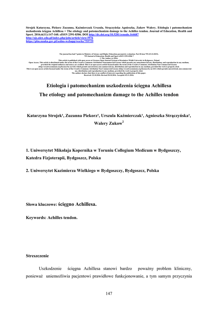 Strojek Katarzyna, Piekorz Zuzanna, Kaźmierczak Urszula, Strączyńska Agnieszka, Zukow Walery. Etiologia i patomechanizm uszkodzenia ścięgna Achillesa = The etiology and patomechanizm damage to the Achilles tendon. Journal of Education, Health and Sport. 2016;6(11):147-160. eISSN 2391-8306. DOI http://dx.doi.org/10.5281/zenodo.164687 http://ojs.ukw.edu.pl/index.php/johs/article/view/3976 https://pbn.nauka.gov.pl/sedno-webapp/works/755729 The journal has had 7 points in Ministry of Science and Higher Education parametric evaluation. Part B item 755 (23.12.2015). 755 Journal of Education, Health and Sport eISSN 2391-8306 7 © The Author (s) 2016; This article is published with open access at Licensee Open Journal Systems of Kazimierz Wielki University in Bydgoszcz, Poland Open Access. This article is distributed under the terms of the Creative Commons Attribution Noncommercial License which permits any noncommercial use, distribution, and reproduction in any medium, provided the original author(s) and source are credited. This is an open access article licensed under the terms of the Creative Commons Attribution Non Commercial License (http://creativecommons.org/licenses/by-nc/4.0/) which permits unrestricted, non commercial use, distribution and reproduction in any medium, provided the work is properly cited. This is an open access article licensed under the terms of the Creative Commons Attribution Non Commercial License (http://creativecommons.org/licenses/by-nc/4.0/) which permits unrestricted, non commercial use, distribution and reproduction in any medium, provided the work is properly cited. The authors declare that there is no conflict of interests regarding the publication of this paper. Received: 22.10.2016. Revised 30.10.2016. Accepted: 03.11.2016. Etiologia i patomechanizm uszkodzenia ścięgna Achillesa The etiology and patomechanizm damage to the Achilles tendon Katarzyna Strojek¹, Zuzanna Piekorz¹, Urszula Kaźmierczak¹, Agnieszka Strączyńska¹, Walery Zukow2 1. Uniwersytet Mikołaja Kopernika w Toruniu Collegium Medicum w Bydgoszczy, Katedra Fizjoterapii, Bydgoszcz, Polska 2. Uniwersytet Kazimierza Wielkiego w Bydgoszczy, Bydgoszcz, Polska Słowa kluczowe: ścięgno Achillesa. Keywords: Achilles tendon. Streszczenie Uszkodzenie ścięgna Achillesa stanowi bardzo poważny problem kliniczny, ponieważ uniemożliwia pacjentowi prawidłowe funkcjonowanie, a tym samym przyczynia 147 się do ograniczenia jakości życia. W światowej literaturze zagadnienia związane z leczeniem oraz usprawnianiem pacjentów po przerwaniu ścięgna Achillesa pojawiają się bardzo często. W dzisiejszych czasach nastąpił znaczny wzrost zainteresowania uprawianiem sportu, zwłaszcza w warunkach rekreacyjnych, niestety jest to również związane z różnorodnymi oraz częstszymi urazami w obrębie narządu ruchu. Jednym z nich jest uszkodzenie ścięgna Achillesa, uznawane obecnie za chorobę cywilizacyjną. Summary Damage to the Achilles tendon is a serious clinical problem, because it prevents the proper functioning of the patient, and thus contributes to reducing the quality of life. In the world literature issues associated with treatment and improve patients after cessation of the Achilles tendon appear very often. In modern times there has been a significant increase in the interest in having the sport, especially in terms of recreation, unfortunately it is also associated with various and frequent injuries within the musculoskeletal system. One of them is the damage to the Achilles tendon, now considered the civilization disease. Wstęp Już w czasach antycznych uraz ścięgna Achillesa stanowił poważnym problem, ponieważ powodował niemożność ucieczki - był wyrokiem śmierci [1]. Uszkodzenie ścięgna Achillesa stanowi bardzo poważny problem kliniczny, ponieważ uniemożliwia pacjentowi prawidłowe funkcjonowanie, a tym samym przyczynia się do ograniczenia jakości życia. W światowej literaturze zagadnienia związane z leczeniem oraz usprawnianiem pacjentów po przerwaniu ścięgna Achillesa pojawiają się bardzo często [2-5]. Ścięgno piętowe jest największym i najsilniejszym pod względem mechanicznym ścięgnem całego ustroju. Wytrzymuje obciążenia wahające się nawet do 300 kg, podobne obciążenia wytrzymuje tylko ścięgno właściwe rzepki [1,6]. 148 W dzisiejszych czasach nastąpił znaczny wzrost zainteresowania uprawianiem sportu, zwłaszcza w warunkach rekreacyjnych, niestety jest to również związane z różnorodnymi oraz częstszymi urazami w obrębie narządu ruchu. Jednym z nich jest uszkodzenie ścięgna Achillesa, uznawane obecnie za chorobę cywilizacyjną [1,3,7-11]. Do najważniejszych przyczyn zerwania ścięgna piętowego należą: uraz bezpośredni zamknięty (np. nagłe uderzenie w napięte ścięgno) lub otwarty (np. przecięcie szkłem) oraz uraz pośredni, który jest częstszy i powstaje podczas nagłego i silnego skurczu mięśnia. Urazy pośrednie najczęściej zachodzą na podłożu istniejących wcześniej zmian degeneracyjnych, zapalnych, naczyniowych, związanych z przeciążeniami lub zaburzeniami proprioceptywnymi. Do uszkodzenia ścięgna Achillesa predysponują również choroby ogólnoustrojowe takie jak: cukrzyca, toczeń trzewny, dna moczanowa, nadczynność tarczycy, gruczolaki przysadki mózgowej, RZS oraz kolagenozy [1,8,11-15]. Zdaniem specjalistów trafna diagnoza postawiona na podstawie skrupulatnie zebranego wywiadu oraz szczegółowo przeprowadzonego badania klinicznego, jest podstawą do dalszego postępowania i rokowania [4,16,17]. Dzięki osiągnięciom nauk podstawowych oraz dynamicznemu rozwojowi nowoczesnych metod diagnostycznych, ortopedii, medycyny sportowej i fizjoterapii można dobrać najwłaściwsze metody leczenia urazów ścięgna piętowego, rodzaj terapii usprawniającej, a w przypadku sportowców można określić wytyczne planu treningów. Celem leczenia operacyjnego całkowitego przerwania 