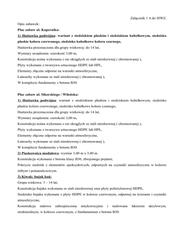 Załącznik 1 A do SIWZ. Opis zabawek: Plac zabaw ul. Kopernika: 1) Huśtawka podwójna: wariant z siedziskiem płaskim i siedziskiem kubełkowym, siedzisko płaskie koloru czerwonego, siedzisko kubełkowe koloru czarnego, Huśtawka przeznaczona dla grupy wiekowej: do 14 lat, Wymiary urządzenia: szerokość 3,00 m, Konstrukcja nośna wykonana z rur okrągłych ze stali nierdzewnej ( chromowanej ), Płyty wykonane z tworzywa sztucznego HDPE lub HPL, Elementy złączne odporne na warunki atmosferyczne, Łańcuchy wykonane ze stali nierdzewnej ( chromowanej ), W komplecie fundamenty z betonu B30. Plac zabaw ul. Sikorskiego / Wileńska: 1) Huśtawka podwójna: wariant z siedziskiem płaskim i siedziskiem kubełkowym, siedzisko płaskie koloru czerwonego, siedzisko kubełkowe koloru czarnego, Huśtawka przeznaczona dla grupy wiekowej: do 14 lat, Wymiary urządzenia: szerokość 3,00 m, Konstrukcja nośna wykonana z rur okrągłych ze stali nierdzewnej ( chromowanej ), Płyty wykonane z tworzywa sztucznego HDPE lub HPL, Elementy złączne odporne na warunki atmosferyczne, Łańcuchy wykonane ze stali nierdzewnej ( chromowanej ), W komplecie fundamenty z betonu B30. 2) Piaskownica modułowa: wymiar 3,40 m x 3,40 m. Konstrukcja wykonana z betonu klasy B30, zbrojonego prętami, Pokrycie siedzisk z elementów epoksydowych, odpornych na czynniki atmosferyczne w kolorze żółtym i pomarańczowym. 3) Kiwak: bujak koń: Grupa wiekowa: 3 – 14 lat, Konstrukcja bujaka wykonana ze stali nierdzewnej oraz płyty polietylenowej HDPE, Siedzisko bujaka wykonane z płyty HDPE w kolorze czerwonym, odpornej na ścieranie i czynniki atmosferyczne, Konstrukcja stalowa zabezpieczona antykorozyjnie i malowana strukturalnym, w kolorze czerwonym, z fundamentem z betonu B30. lakierem akrylowym, Plac zabaw ul. Partyzantów / Legionów: 1) Zestaw zabawowy wielofunkcyjny, składający się z: ścianki wspinaczkowej ( dużej ) z drabinką, ścianki pionowej – przeplotni, dwóch wież z dwoma podestami, z dwoma daszkami, pomostu, ścianki wspinaczkowej małej, zjeżdżalni. Grupa wiekowa: do lat 14. Konstrukcja wykonana ze stali nierdzewnej, liny zbrojonej, płyty HPL i HDPE. Podest wykonany z antypoślizgowej sklejki wodoodpornej. Konstrukcja stalowa zabezpieczona antykorozyjnie oraz malowana lakierem akrylowym strukturalnym. W komplecie z fundamentem z betonu B30. 2) Piaskownica sześciokątna. Konstrukcja wykonana z betonu klasy B30, zbrojonego prętami, Pokrycie siedzisk z elementów epoksydowych, odpornych na czynniki atmosferyczne w kolorze żółtym i pomarańczowym, Szerokość: 3,30 – 3,60 m Plac zabaw ul. Warszawska 1) Łuk linowy. Grupa wiekowa 5 – 14 lat, Konstrukcja nośna wykonana z rur okrągłych ze stali nierdzewnej ( chromowanej ), łączników kulkowych oraz uchwytów z tworzywa sztucznego, Elementy złączne odporne na warunki atmosferyczne, Liny polipropylenowe z rdzeniem stalowym, W komplecie z fundamentem z betonu B30. Plac zabaw ul. Kościelna / Reja: 1) Zestaw zabawowy wielofunkcyjny, składający się z: ścianki wspinaczkowej ( dużej ) z drabinką, ścianki pionowej – przeplotni, dwóch wież z dwoma podestami, z dwoma daszkami, pomostu, ścianki wspinaczkowej małej, zjeżdżalni. Grupa wiekowa: do lat 14, Konstrukcja wykonana ze stali nierdzewnej, liny zbrojonej, płyty HPL i HDPE, Podest wykonany z antypoślizgowej sklejki wodoodpornej, Konstrukcja stalowa zabezpieczona antykorozyjnie oraz malowana lakierem akrylowym strukturalnym, W komplecie z fundamentem z betonu B30. 2) Huśtawka podwójna: wariant z siedziskiem płaskim i siedziskiem kubełkowym, siedzisko płaskie koloru czerwonego, siedzisko kubełkowe koloru czarnego, Huśtawka przeznaczona dla grupy wiekowej: do 14 lat, Wymiary urządzenia: szerokość 3,00 m, Konstrukcja nośna wykonana z rur okrągłych ze stali nierdzewnej ( chromowanej ), Płyty wykonane z tworzywa sztucznego HDPE lub HPL, Elementy złączne odporne na warunki atmosferyczne, Łańcuchy wykonane ze stali nierdzewnej ( chromowanej ), W komplecie fundamenty z betonu B30. Plac zabaw ul. Czwartaków: 1) Zestaw zabawowy wielofunkcyjny, składający się z: ścianki wspinaczkowej małej, przeplotni pochyłej małej, podestu, dwóch wież z dwoma daszkami, 2 zjeżdżalnie, rury polipropylenowej, łączącej 2 wieże, 2 przeplotni pionowych, dużych przeplotni dużej ( okrągły przekrój, kształt walca ) pomostu linowego ze stopniami, łączącego podest z podestem z daszkiem Konstrukcja wykonana ze stali nierdzewnej , lin zbrojonych, rury polipropylenowej, płyty HPL i HDPE. Podest wykonany z antypoślizgowej sklejki wodoodpornej. Konstrukcja stalowa zabezpieczona antykorozyjnie oraz malowana lakierem akrylowym strukturalnym. W komplecie fundamenty z betonu B30. Kolorystyka urządzenia, elementy w kolorach: zielony, czerwony, żółty. 2) Huśtawka ważka. Grupa wiekowa: 3-14 lat, Konstrukcja nośna wykonana z rur okrągłych ze stali nierdzewnej ( chromowanej ), Płyty wykonane z tworzywa sztucznego HDPE lub HPL, Siedzisko w kolorze czerwonym, Elementy złączne odporne na warunki atmosferyczne, Równomierną pracę wahadła zapewniają elementy ślizgowe, W komplecie fundamenty z betonu B30. 3) Zestaw sprawnościowy. Grupa wiekowa do 14 lat, 2 przeplotnie duże, Przeplotnia mała, Liny przeplotni w kolorze czerwonym,niebieskim, żółtym, Mała ścianka wspinaczkowa, 2 podesty z daszkami, Poręcz stalowa do wchodzenia / schodzenia, Konstrukcja wykonana ze stali chromowanej oraz stali zabezpieczonej antykorozyjnie, Podest wykonany z antypoślizgowej sklejki wodoodpornej, Elementy powierzchniowe z płyt HPL Liny polipropylenowe, z rdzeniem stalowym, W komplecie fundamenty z betonu B30. 4) Huśtawka podwójna: wariant z siedziskiem płaskim i siedziskiem kubełkowym, siedzisko płaskie koloru czerwonego, siedzisko kubełkowe koloru czarnego, Huśtawka przeznaczona dla grupy wiekowej: do 14 lat, Wymiary urządzenia: szerokość 3,00 m, Konstrukcja nośna wykona