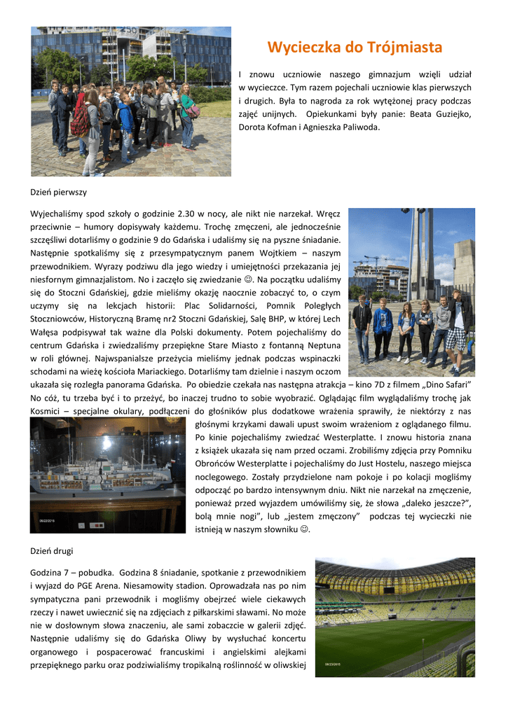 Wycieczka do Trójmiasta I znowu uczniowie naszego gimnazjum wzięli udział w wycieczce. Tym razem pojechali uczniowie klas pierwszych i drugich. Była to nagroda za rok wytężonej pracy podczas zajęć unijnych. Opiekunkami były panie: Beata Guziejko, Dorota Kofman i Agnieszka Paliwoda. Dzień pierwszy Wyjechaliśmy spod szkoły o godzinie 2.30 w nocy, ale nikt nie narzekał. Wręcz przeciwnie – humory dopisywały każdemu. Trochę zmęczeni, ale jednocześnie szczęśliwi dotarliśmy o godzinie 9 do Gdańska i udaliśmy się na pyszne śniadanie. Następnie spotkaliśmy się z przesympatycznym panem Wojtkiem – naszym przewodnikiem. Wyrazy podziwu dla jego wiedzy i umiejętności przekazania jej niesfornym gimnazjalistom. No i zaczęło się zwiedzanie . Na początku udaliśmy się do Stoczni Gdańskiej, gdzie mieliśmy okazję naocznie zobaczyć to, o czym uczymy się na lekcjach historii: Plac Solidarności, Pomnik Poległych Stoczniowców, Historyczną Bramę nr2 Stoczni Gdańskiej, Salę BHP, w której Lech Wałęsa podpisywał tak ważne dla Polski dokumenty. Potem pojechaliśmy do centrum Gdańska i zwiedzaliśmy przepiękne Stare Miasto z fontanną Neptuna w roli głównej. Najwspanialsze przeżycia mieliśmy jednak podczas wspinaczki schodami na wieżę kościoła Mariackiego. Dotarliśmy tam dzielnie i naszym oczom ukazała się rozległa panorama Gdańska. Po obiedzie czekała nas następna atrakcja – kino 7D z filmem „Dino Safari” No cóż, tu trzeba być i to przeżyć, bo inaczej trudno to sobie wyobrazić. Oglądając film wyglądaliśmy trochę jak Kosmici – specjalne okulary, podłączeni do głośników plus dodatkowe wrażenia sprawiły, że niektórzy z nas głośnymi krzykami dawali upust swoim wrażeniom z oglądanego filmu. Po kinie pojechaliśmy zwiedzać Westerplatte. I znowu historia znana z książek ukazała się nam przed oczami. Zrobiliśmy zdjęcia przy Pomniku Obrońców Westerplatte i pojechaliśmy do Just Hostelu, naszego miejsca noclegowego. Zostały przydzielone nam pokoje i po kolacji mogliśmy odpocząć po bardzo intensywnym dniu. Nikt nie narzekał na zmęczenie, ponieważ przed wyjazdem umówiliśmy się, że słowa „daleko jeszcze?”, bolą mnie nogi”, lub „jestem zmęczony” podczas tej wycieczki nie istnieją w naszym słowniku . Dzień drugi Godzina 7 – pobudka. Godzina 8 śniadanie, spotkanie z przewodnikiem i wyjazd do PGE Arena. Niesamowity stadion. Oprowadzała nas po nim sympatyczna pani przewodnik i mogliśmy obejrzeć wiele ciekawych rzeczy i nawet uwiecznić się na zdjęciach z piłkarskimi sławami. No może nie w dosłownym słowa znaczeniu, ale sami zobaczcie w galerii zdjęć. Następnie udaliśmy się do Gdańska Oliwy by wysłuchać koncertu organowego i pospacerować francuskimi i angielskimi alejkami przepięknego parku oraz podziwialiśmy tropikalną roślinność w oliwskiej palmiarni. Po obiedzie w barze „Pobite Gary” (zamiast zupy w talerzach podano nam zupę w malutkich garnuszkach) pojechaliśmy zwiedzać Sopot. Pochodziliśmy po sopockim molo, pobiegaliśmy po plaży, kupiliśmy pamiątki, obejrzeliśmy Krzywy Domek - największą atrakcję na Monciaku i udaliśmy się na odpoczynek do naszego hotelu. Dzień trzeci Pobudka, śniadanie, wymeldowanie się z hotelu i w drogę do Gdyni! A tam rejs statkiem na Hel. I znowu nasz niezawodny pan Wojtek zaprowadził nas w miejsce gdzie zaczyna się Polska. Wąski cypel plaży i dookoła tylko morskie fale i mewy… . Potem biegiem na obiad, bo czekała nas jeszcze wizyta w fokarium. Szkoda, że pogoda nie do końca nam dopisała, ale i tak ciekawe wrażenia z wizyty u tych wspaniałych morskich ssaków, które za świeżą rybkę pokazywały mnóstwo ciekawych sztuczek. No cóż wszystko co dobre kończy się szybko. Powróciliśmy statkiem do Gdyni, obejrzeliśmy Dar Pomorza i ORP Błyskawica i po kolacji, na którą dostaliśmy po dużej pizzy, udaliśmy się w podróż powrotną do Choroszczy. Wycieczka się skończyła, ale wrażenia pozostaną z nami na długo!