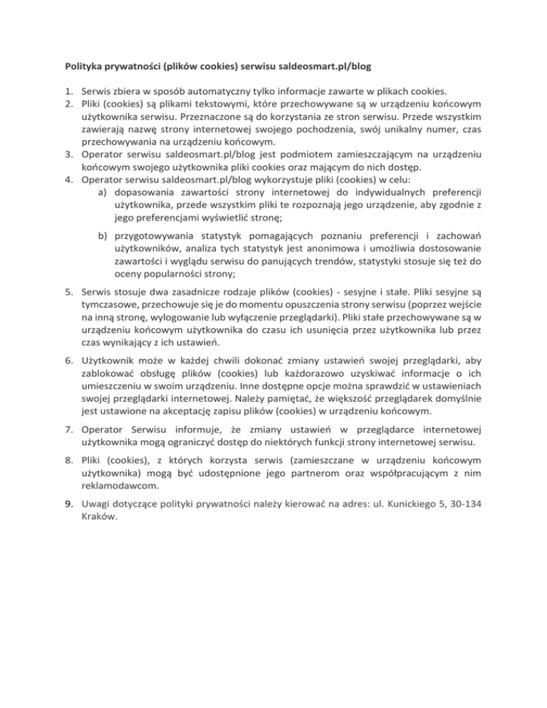 Polityka prywatności (plików cookies) serwisu saldeosmart.pl/blog 1. Serwis zbiera w sposób automatyczny tylko informacje zawarte w plikach cookies. 2. Pliki (cookies) są plikami tekstowymi, które przechowywane są w urządzeniu końcowym użytkownika serwisu. Przeznaczone są do korzystania ze stron serwisu. Przede wszystkim zawierają nazwę strony internetowej swojego pochodzenia, swój unikalny numer, czas przechowywania na urządzeniu końcowym. 3. Operator serwisu saldeosmart.pl/blog jest podmiotem zamieszczającym na urządzeniu końcowym swojego użytkownika pliki cookies oraz mającym do nich dostęp. 4. Operator serwisu saldeosmart.pl/blog wykorzystuje pliki (cookies) w celu: a) dopasowania zawartości strony internetowej do indywidualnych preferencji użytkownika, przede wszystkim pliki te rozpoznają jego urządzenie, aby zgodnie z jego preferencjami wyświetlić stronę; b) przygotowywania statystyk pomagających poznaniu preferencji i zachowań użytkowników, analiza tych statystyk jest anonimowa i umożliwia dostosowanie zawartości i wyglądu serwisu do panujących trendów, statystyki stosuje się też do oceny popularności strony; 5. Serwis stosuje dwa zasadnicze rodzaje plików (cookies) - sesyjne i stałe. Pliki sesyjne są tymczasowe, przechowuje się je do momentu opuszczenia strony serwisu (poprzez wejście na inną stronę, wylogowanie lub wyłączenie przeglądarki). Pliki stałe przechowywane są w urządzeniu końcowym użytkownika do czasu ich usunięcia przez użytkownika lub przez czas wynikający z ich ustawień. 6. Użytkownik może w każdej chwili dokonać zmiany ustawień swojej przeglądarki, aby zablokować obsługę plików (cookies) lub każdorazowo uzyskiwać informacje o ich umieszczeniu w swoim urządzeniu. Inne dostępne opcje można sprawdzić w ustawieniach swojej przeglądarki internetowej. Należy pamiętać, że większość przeglądarek domyślnie jest ustawione na akceptację zapisu plików (cookies) w urządzeniu końcowym. 7. Operator Serwisu informuje, że zmiany ustawień w przeglądarce internetowej użytkownika mogą ograniczyć dostęp do niektórych funkcji strony internetowej serwisu. 8. Pliki (cookies), z których korzysta serwis (zamieszczane w urządzeniu końcowym użytkownika) mogą być udostępnione jego partnerom oraz współpracującym z nim reklamodawcom. 9. Uwagi dotyczące polityki prywatności należy kierować na adres: ul. Kunickiego 5, 30-134 Kraków.