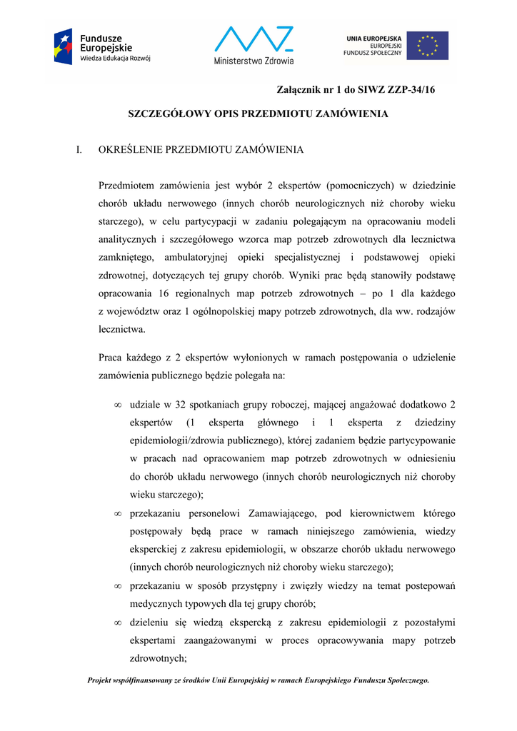 Załącznik nr 1 do SIWZ ZZP-34/16 SZCZEGÓŁOWY OPIS PRZEDMIOTU ZAMÓWIENIA I. OKREŚLENIE PRZEDMIOTU ZAMÓWIENIA Przedmiotem zamówienia jest wybór 2 ekspertów (pomocniczych) w dziedzinie chorób układu nerwowego (innych chorób neurologicznych niż choroby wieku starczego), w celu partycypacji w zadaniu polegającym na opracowaniu modeli analitycznych i szczegółowego wzorca map potrzeb zdrowotnych dla lecznictwa zamkniętego, ambulatoryjnej opieki specjalistycznej i podstawowej opieki zdrowotnej, dotyczących tej grupy chorób. Wyniki prac będą stanowiły podstawę opracowania 16 regionalnych map potrzeb zdrowotnych – po 1 dla każdego z województw oraz 1 ogólnopolskiej mapy potrzeb zdrowotnych, dla ww. rodzajów lecznictwa. Praca każdego z 2 ekspertów wyłonionych w ramach postępowania o udzielenie zamówienia publicznego będzie polegała na: • udziale w 32 spotkaniach grupy roboczej, mającej angażować dodatkowo 2 ekspertów (1 eksperta głównego i 1 eksperta z dziedziny epidemiologii/zdrowia publicznego), której zadaniem będzie partycypowanie w pracach nad opracowaniem map potrzeb zdrowotnych w odniesieniu do chorób układu nerwowego (innych chorób neurologicznych niż choroby wieku starczego); • przekazaniu personelowi Zamawiającego, pod kierownictwem którego postępowały będą prace w ramach niniejszego zamówienia, wiedzy eksperckiej z zakresu epidemiologii, w obszarze chorób układu nerwowego (innych chorób neurologicznych niż choroby wieku starczego); • przekazaniu w sposób przystępny i zwięzły wiedzy na temat postepowań medycznych typowych dla tej grupy chorób; • dzieleniu się wiedzą ekspercką z zakresu epidemiologii z pozostałymi ekspertami zaangażowanymi w proces opracowywania mapy potrzeb zdrowotnych; Projekt współfinansowany ze środków Unii Europejskiej w ramach Europejskiego Funduszu Społecznego. • aktywnym udziale w opracowaniu wzorca mapy potrzeb zdrowotnych, zgodnie z podziałem pracy ustalonym w trybie roboczym przez Zamawiającego, stosownie do kompetencji eksperta; • terminowej realizacji prac i przygotowywaniu stosownych materiałów, celem osiągnięcia stanu produktywnej i efektywnej współpracy; • weryfikacji merytorycznej opracowanego wzorca mapy potrzeb zdrowotnych, w opracowywaniu której ekspert ten brał udział. II. Informacja o projekcie Zamówienie realizowane jest w ramach projektu pn. „Mapy potrzeb zdrowotnych – Baza Analiz Systemowych i Wdrożeniowych”, współfinansowanego przez Unię Europejską ze środków Europejskiego Funduszu Społecznego w ramach Programu Operacyjnego Wiedza Edukacja Rozwój. Celem nadrzędnym projektu jest stworzenie systemu mapowania potrzeb zdrowotnych w zakresie 30 grup chorób oraz opracowania bazy analiz systemowych i wdrożeniowych w tym zakresie. System mapowania potrzeb zdrowotnych pozwoli na lepsze zarządzanie środkami publicznymi w ochronie zdrowia, umożliwi wsparcie ich dystrybucji zgodnie z aktualnymi i prognozowanymi potrzebami zdrowotnymi pacjentów. System ten będzie również wspierał podejmowanie decyzji zarządczych i kreowanie polityk w oparciu o fakty. III. ZAKRES CZASOWY I TERYTORIALNY REALIZACJI PRZEDMIOTU ZAMÓWIENIA Przedmiot zamówienia będzie realizowany w okresie od 6 kwietnia 2016 r. do 31 grudnia 2017 r. w siedzibie Zamawiającego; Spotkania grupy roboczej będą odbywały się w następujących terminach: 1. spotkanie – 6 kwietnia 2016 r.; 2. spotkanie – 13 kwietnia 2016 r.; 3. spotkanie – 11 maja 2016 r.; 4. spotkanie – 18 maja 2016 r.; 5. spotkanie – 25 maja 2016 r.; 6. spotkanie – 1 czerwca 2016 r.; Projekt współfinansowany ze środków Unii Europejskiej w ramach Europejskiego Funduszu Społecznego. 2 7. spotkanie – 8 czerwca 2016 r.; 8. spotkanie – 15 czerwca 2016 r.; 9. spotkanie – 22 czerwca 2016 r.; 10. spotkanie – 20 lipca 2016 r.; 11. spotkanie – 27 lipca 2016 r.; 12. spotkanie – 3 sierpnia 2016 r.; 13. spotkanie – 10 sierpnia 2016 r.; 14. spotkanie – 17 sierpnia 2016 r.; 15. spotkanie – 24 sierpnia 2016 r.; 16. spotkanie – 7 września 2016 r.; 17. spotkanie – 14 września 2016 r.; 18. spotkanie – 28 września 2016 r.; 19. spotkanie – 19 października 2016 r.; 20. spotkanie – 2 listopada 2016 r.; 21. spotkanie – 9 listopada 2016 r.; 22. spotkanie – 30 listopada 2016 r.; 23. spotkanie – 7 grudnia 2016 r.; 24. spotkanie – 31 maja 2017 r.; 25. spotkanie – 21 czerwca 2017 r.; 26. spotkanie – 23 sierpnia 2017 r.; 27. spotkanie – 6 września 2017 r.; 28. spotkanie – 20 września 2017 r.; 29. spotkanie – 4 października 2017 r.; 30. spotkanie – 18 października 2017 r.; 31. spotkanie – 29 listopada 2017 r.; 32. spotkanie – 13 grudnia 2017 r. Zamawiający ma prawo zmiany ww. terminów, o czym poinformuje Wykonawcę najpóźniej 72 godziny wcześniej. Zamawiający ma prawo zmienić datę spotkania również w terminie późniejszym, po dokonaniu stosowanych uzgodnień z Wykonawcami. Maksymalny czas jednego spotkania to 8 godzin zegarowych, każdy z ekspertów weźmie udział w maksymalnie 32 spotkaniach. Projekt współfinansowany ze środków Unii Europejskiej w ramach Europejskiego Funduszu Społecznego. 3 IV. Zakres przedmiotu zamówienia Na potrzeby spotkań grupy roboczej, dwóch ekspertów pomocniczych będzie aktywnie uczestniczyło w opracowaniu i przedstawieniu personelowi Zamawiającego oraz pozostałym członkom grupy roboczej określonego materiału merytorycznego. Każdy z ekspertów pomocniczych będzie działał w tym względzie pod kierunkiem eksperta głównego. Zakres zadań ekspertów pomocniczych w ramach pracy w grupie roboczej ds. chorób układu nerwowego (innych chorób neurologicznych niż choroby wieku starczego): a) będą uczestniczyli w przygotowaniu i zaprezentowaniu materiału analitycznego na temat 3 głównych (np. najbardziej istotnych, najczęstszych, najbardziej obciążających dla systemu ochrony zdrowia) problemów zdrowo