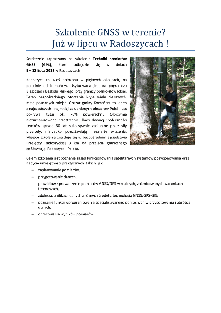 Szkolenie GNSS w terenie? Już w lipcu w Radoszycach ! Serdecznie zapraszamy na szkolenie Techniki pomiarów GNSS (GPS), które odbędzie się w dniach 9 – 12 lipca 2012 w Radoszycach ! Radoszyce to wieś położona w pięknych okolicach, na południe od Komańczy. Usytuowana jest na pograniczu Bieszczad i Beskidu Niskiego, przy granicy polsko‐słowackiej. Teren bezpośredniego otoczenia kryje wiele ciekawych, mało poznanych miejsc. Obszar gminy Komańcza to jeden z najczystszych i najmniej zaludnionych obszarów Polski. Las pokrywa tutaj ok. 70% powierzchni. Olbrzymie niezurbanizowane przestrzenie, ślady dawnej społeczności Łemków sprzed 60 lat sukcesywnie zacierane przez siły przyrody, nierzadko pozostawiają niezatarte wrażenia. Miejsce szkolenia znajduje się w bezpośrednim sąsiedztwie Przełęczy Radoszyckiej 3 km od przejścia granicznego ze Słowacją Radoszyce ‐ Palota. Celem szkolenia jest poznanie zasad funkcjonowania satelitarnych systemów pozycjonowania oraz nabycie umiejętności praktycznych takich, jak: − zaplanowanie pomiarów, − przygotowanie danych, − prawidłowe prowadzenie pomiarów GNSS/GPS w realnych, zróżnicowanych warunkach terenowych, − zdolność unifikacji danych z różnych źródeł z technologią GNSS/GPS‐GIS; − poznanie funkcji oprogramowania specjalistycznego pomocnych w przygotowaniu i obróbce danych, − opracowanie wyników pomiarów. Plan szkolenia: Dzień 1 Część teoretyczna: − podstawy funkcjonowania satelitarnych systemów pozycjonowania; − zasada działania odbiornika GPS: pomiary kodowe i fazowe, odbiorniki jedno‐ i dwuczęstotliwościowe, − segmenty GPS: kosmiczny, kontroli i użytkownika; − dokładność pomiarów i parametry ją określające: − parametry PDOP, GDOP, VDOP, TDOP, refrakcja jonosferyczna i troposferyczna, interferencja fal, sposoby uzyskiwania wysokich dokładności – pomiary różnicowe (zasada pomiaru, redukcja błędów, postprocessing); odmiany różnicowe systemów nawigacyjnych; Satelitarne systemy wspomagające – SBAS, Naziemne systemy wspomagania satelitarnego – GBAS; − sieć stacji referencyjnych ASG‐EUPOS (DGNSS oraz pomiary RTK); − GNSS – Globalne Systemy Pozycjonowania Satelitarnego: GPS, GLONASS, Galileo; − układy odniesienia wykorzystywane w pomiarach satelitarnych: − sieć punktów stałych ‐ osnowy ‐ EUREF, POLREF, przejścia między układami (transformacje), sieć permanentnych stacji referencyjnych, zasady prowadzenia pomiarów GNSS. Część praktyczna: − zapoznanie się z odbiornikiem GNSS/GPS ‐ przegląd sprzętu i jego obsługa, oprogramowanie, akcesoria; − planowanie misji pomiarowej ‐ przewidywanie optymalnego czasu i warunków pomiaru. Wieczorem zaplanowane jest ognisko. Dzień 2 − − oprogramowanie użytkowe: omówienie funkcjonalności programów pomiarowych: ArcPad 10 oraz DigiTerra Explorer 6, optymalizacja parametrów pomiarów (konfiguracja oprogramowania i odbiornika, ustawienia zwiększające dokładności pomiaru, zastosowanie poprawek SBAS, DGNSS z protokołem NTRIP oraz pomiar RTK); przygotowanie podkładów mapowych i projektu pomiarowego: wybór odpowiedniego odwzorowania/odniesienia m.in.: WGS 84, PUWG 1992, PUWG 2000, praca na warstwach oraz przygotowanie tematycznej mapy wektorowej (m.in. SHP, DXF), podkłady rastrowe ‐ mapy topograficzne i ortofotomapy (m.in. JPG, TIF), dane opisowe, tworzenie formularzy zbierania danych na potrzeby projektu, eksport danych do odbiornika. Po szkoleniu zaplanowany jest paintball – wygrywa ten kto zdobędzie bazę przeciwnika ! Dzień 3 − − pomiary terenowe ‐ praktyczne stosowanie różnych technik pomiarów: pomiary inwentaryzacyjne obiektów punktowych i liniowych, pomiary poligonowe, pomiary ciągłe i uśrednione, tyczenie linii, wspomaganie pomiarów GPS pomiarami wykonywanymi dalmierzem laserowym; opracowanie wykonanych pomiarów: podnoszenie precyzji pomiarów z wykorzystaniem danych dostępnych w Internecie z referencyjnych stacji permanentnych, elementy aktualizacji baz GIS z użyciem pomiarów GPS, obróbka pomiarów na inne potrzeby przetwarzania, generowanie raportów oraz wydruk mapy. Dzień 4 – Ćwiczenia terenowe Każdy z uczestników przejdzie cały proces przygotowania do pomiarów (import danych), wykonanie zadań w terenie, następnie eksport danych i ich opracowanie. W czasie gry terenowej uczestnik będzie miał szanse wykorzystania wiedzy zdobytej na szkoleniu. Będzie musiał wykonać m.in. takie zadania, jak: − − − − − − − − Wyszukiwanie punktu o zadanych współrzędnych – poszukiwanie skrzynki z nagrodą, Pomiar długości, Pomiar pola, Marsz na azymut, Tyczenie obiektu, Pomiar współrzędnych punktu różnymi metodami, Wykorzystanie pliku rastrowego w odbiorniku, I wiele innych…. Na zakończenie szkolenia otrzymane wyniki zostaną omówione. Informacje organizacyjne: − − − Szkolenie odbywać się będzie w godzinach 9‐17 (8 godzin/dzień); Każdy z uczestników otrzyma skrypt, płytę CD z danymi oraz zaświadczenie ukończenia szkolenia; Szkolenie zostanie przeprowadzone na odbiornikach marki Ashtech MobileMapper 10 i MobileMapper 100 oraz oprogramowaniu pomiarowym ESRI ArcPad i DigiTerra. Każdy z uczestników będzie miał zapewniony własny odbiornik oraz stanowisko komputerowe. Zakwaterowanie oraz wyżywienie − Zakwaterowanie zapewnione jest od poniedziałku wieczorem do końca szkolenia (czwartek) w gospodarstwie agroturystycznym 4pokoje (http://www.4pokoje.pl/) w pokojach 2 ‐5 osobowych; − W cenę szkolenia jest wliczone pełne wyżywienie wraz z przerwami kawowymi. Cena szkolenia − Cena szkolenia wynosi 700 zł netto1 i zawiera również: Koszt zakwaterowania oraz wyżywienia, Opłatę klimatyczną. 1 Do podanej ceny należy doliczyć 23% VAT. Szkolenia finansowane ze środków publicznych są zwolnione z VAT (po dostarczeniu odpowiedniego oświadczenia).