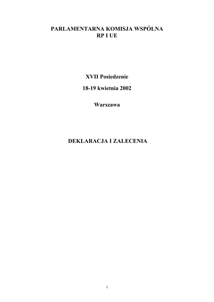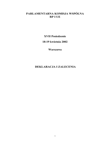 PARLAMENTARNA KOMISJA WSPÓLNA RP I UE XVII Posiedzenie 18-19 kwietnia 2002 Warszawa DEKLARACJA I ZALECENIA 1 Parlamentarna Komisja Wspólna Rzeczypospolitej Polskiej i Unii Europejskiej pod przewodnictwem deputowanego Jean-Louis Bourlanges (Parlament Europejski) i posła Józefa Oleksego (Sejm) odbyła w dniach 18-19 kwietnia 2002 roku w Warszawie swoje XVII posiedzenie. Podczas posiedzenia członkowie Parlamentarnej Komisji Wspólnej wymienili poglądy z sekretarzem Komitetu Integracji Europejskiej minister Danutą Hübner, Głównym Negocjatorem ze strony polskiej ministrem Janem Truszczyńskim, reprezentującym urzędującą prezydencję Rady Unii Europejskiej ambasadorem Królestwa Hiszpanii w Polsce Juanem Pablo de Laiglesia oraz przedstawicielką Komisji Europejskiej dyrektorem w Dyrekcji Generalnej ds. Rozszerzenia Françoise Gaudenzi. Podczas dyskusji członkowie PKW poruszyli następujące kwestie: • Sytuacja polityczna i gospodarcza w Polsce oraz stan wzajemnych stosunków RP i UE. • Ocena stanu negocjacji akcesyjnych, ocena dokumentów Komisji Europejskiej z 30 stycznia 2002 roku w sprawie ram finansowych w zakresie negocjacji akcesyjnych na lata 2004-2006 oraz “Rolnictwo i Rozszerzenie”; pomyślne przyłączenie nowych państw członkowskich do wspólnej polityki rolnej. • Debata na temat przyszłości Unii Europejskiej w świetle dyskusji w ramach Konwentu UE. Parlamentarna Komisja Wspólna wystosowała następujące zalecenia do Rady Stowarzyszenia oraz instytucji polskich i unijnych: na temat rozwoju sytuacji w Unii Europejskiej 1. Potwierdza, że rozszerzenie Unii Europejskiej jest ważnym i nieodwracalnym procesem. Z zadowoleniem wita konkluzje Rady Europejskiej z Laeken, w których państwa członkowskie wyraziły determinację zakończenia negocjacji akcesyjnych do końca 2002 roku tak, aby obywatele państw, które będą do tego czasu gotowe, mogli uczestniczyć w wyborach do Parlamentu Europejskiego w 2004 roku w charakterze członków Unii Europejskiej; 2. Z zadowoleniem odnotowuje deklarację przewodniczącego Parlamentu Europejskiego Pata Coxa, który przedstawiając priorytety swojej kadencji podczas wystąpienia z 15 stycznia 2002 roku zapowiedział zaproszenie przedstawicieli parlamentów państw kandydujących do uczestnictwa w debacie na temat rozszerzenia, która ma się odbyć jeszcze w tym roku w Parlamencie Europejskim, a także w pracach Parlamentu Europejskiego w charakterze obserwatorów po podpisaniu Traktatu Akcesyjnego; 3. Podkreśla znaczenie szybkiego zakończenia procesu ratyfikacji Traktatu z Nicei; 4. Z zadowoleniem odnotowuje uwieńczone sukcesem wprowadzenie waluty euro 1 stycznia 2002 roku; 2 na temat przyszłości Europy 5. Z zadowoleniem przyjmuje postanowienia Rady Europejskiej z Laeken dotyczące utworzenia Konwentu w sprawie przyszłości Europy oraz udziału państw kandydujących w pracach Konwentu przygotowującego kolejną Konferencję Międzyrządową, której celem będzie opracowanie przyszłego kształtu Unii Europejskiej w ramach traktaktu konstytucyjnego. PKW z zadowoleniem przyjmuje decyzję Prezydium Konwentu o udziale jednego przedstawiciela państw kandydujących w pracach Prezydium oraz o możliwości korzystania z języków państw kandydujących. PKW wyraża przekonanie, że jednym z podstawowych celów Konwentu jest wzmocnienie demokratycznej legitymacji procesu integracji europejskiej i musimy o tym pamiętać podczas dyskusji w sprawie podziału kompetencji oraz roli parlamentów narodowych; 6. PKW podkreśla znaczenie wzmocnienia zasady subsydiarności, uważając jednocześnie, że podział kompetencji na szczeblu wspólnotowym, narodowym i regionalnym nie powinien prowadzić do renacjonalizacji polityk wspólnotowych, co stanowiłoby niewątpliwie szkodę dla procesu integracji europejskiej; na temat strategii rozszerzenia i negocjacji akcesyjnych 7. Wita z zadowoleniem potwierdzenie przez Radę Europejską z Laeken stanowiska Komisji Europejskiej, wyrażonego 13 listopada 2001 roku w dokumencie strategicznym na temat rozszerzenia, zgodnie z którym przy utrzymaniu dotychczasowego tempa negocjacji akcesyjnych i reform w krajach kandydujących, do zakończenia negocjacji przed końcem 2002 roku mogłoby być gotowych dziesięć państw kandydujących. PKW popiera pogląd, iż negocjacje akcesyjne powinny być prowadzone zgodnie z kalendarzem przyjętym w „mapie drogowej” oraz z zadowoleniem wita zobowiązanie Komisji Europejskiej do przedstawienia w pierwszej połowie 2002 roku projektu wspólnych stanowisk w ostatnich obszarach negocjacyjnych. PKW potwierdza, że ostateczne decyzje dotyczące przyjęcia do Unii Europejskiej nowych państw członkowskich powinny być podjęte na podstawie gotowości państw kandydujących do przyjęcia, wdrożenia i egzekwowania pełnego acquis; 8. Wita z zadowoleniem przyjęcie przez Komisję Europejską, przygotowanego w ścisłej współpracy z polskim rządem, planu działania w zakresie wzmacniania potencjału administracyjnego, uznając go za szczególnie użyteczny instrument przygotowania polskiej administracji do funkcjonowania w UE po akcesji. 9. Z zainteresowaniem odnotowuje propozycję Komisji Europejskiej z 30 stycznia 2002 roku zawartą w dokumencie dotyczącym finansowych aspektów rozszerzenia i wyraża przekonanie, że dokument Komisji stanowi ważny krok w procesie akcesyjnym i dobrą podstawę roboczą dalszych rozmów. PKW oczekuje rozwiązań, umożliwiających Polsce uzyskanie natychmiast po akcesji statusu beneficjenta netto, zarówno w odniesieniu do kwot transferów jak i zobowiązań; 3 10. Za pozytywny uznaje fakt, że proponowane ramy finansowe zakładają przyznanie dopłat bezpośrednich dla rolników państw przystępujących do Unii Europejskiej jako integralnej części obecnej wspólnej polityki rolnej. PKW ocenia, że wprowadzenie pełnych dopłat bezpośrednich powinno być przedyskutowane celem osiągnięcia optymalnego rozwiąza
