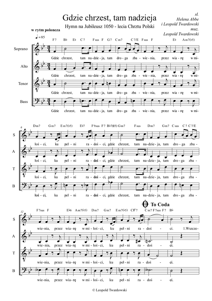 sł. Helena Abbe i Leopold Twardowski muz. Leopold Twardowski Eα A m7 ( b 5) Gdzie chrzest, tam nadzieja w rytm poloneza q = 85 α 2 %α 3 œ Soprano F7 α 2 %α 3 œ Hymn na Jubileusz 1050 - lecia Chrztu Polski Bα Eα ˙ Gdzie chrzest, Alto α 2 Υα 3 œ Gdzie Tenor > αα 32 œ œ Gdzie chrzest, Bass Gdzie 6 S A T B A T B G m7 G7 œ− œ œ œ œ œ œ œ œ œ œ œ ‰ œι œ œ ‰ œι C m7 œ œ− œ œ œ œ zba - wie - nia, œ− œ œ œ µœ dro - ga zba - tam na - dzie - ja, tam œ µœ− œ œ œ œ dro - ga zba - wie - nia, przez wia - rę w mi - tam na - dzie - ja, tam dro - ga zba - wie - nia, przez wia - rę w mi - chrzest, E m7 ( b 5) tam na - dzie - ja, tam E α7 œ œ œ œ œ œ F 9sus F 7 B α7(∀ 5) G m7 ˙ > αα œ œ ‰ œΙ µ œ œ ‰ α œ œ œ α œ Ι ˙ α αα łoś - ci, ku peł - ni łoś - ci, ku peł - ni F sus ‰ ι ‰ ι œ œ œ œ œ œ wie - nia, przez wia - rę w mi ι œ œ ‰ œ œ œ ‰ œι œ− œ D m7 œ œ ‰ œ Ι G m7 C sus C 7 C 7/E œ œœœœ œ œ œ tam na - dzie - ja, tam dro - ga zba - zba - ra - doś - ci, gdzie chrzest, tam na - dzie - ja, tam œ− œ œ œ œ dro - ga ra - doś - ci, gdzie chrzest, tam na - dzie - ja, tam dro - ga E α6 A m7 ( b 5) ν E m7 ( b 5) C ∀ 7 To Coda Bα - œ œ - ci. Œ Œ D m7 wie - nia, przez wia - rę w mi - łoś - ci, G m7 C m7 F 7sus F 7 ‰ ι ‰ ι œ œ œ ∀œ Μ˙− ku peł - ni ra - doś ˙ ci. ˙ wie - nia, przez wia - rę w mi - łoś - ci, ‰œ Ι ku peł - ni ra - doś - ci. wie - nia, przez wia - rę w mi - łoś - ci, ku peł - ni ra - doś - ci. > α ≅œ œ ‰ œ α Ι œ œ ‰ œ Ι ku œ œ ‰ œ Ι œ peł - ni ra - doś œ ˙ œ œ ‰ œΙ µ œ œ ‰ œΙ ≅ ˙ − © Leopold Twardowski zba - œ µœ œ ι œ œ ‰ œ œ œ ‰ œι œ œ ‰ œ œ œ œ ‰ œ œ ˙ F 7sus F w mi - ι œ œ œ αœ ˙ œ− œ œ œ œ œ œ œ ra - doś - ci, gdzie chrzest, tam na - dzie - ja, tam dro - ga zba ι œ œ ˙ œ− œ œ œ œ œ œ œ œ œ ra - doś - ci, gdzie chrzest, ‰ ι ‰ ι œ œ œ œ œ œ wie - nia, przez wia - rę ι œ œ w miι - łoś - ci, αα ‰ œ œ œ Υ œ œ ‰ œ % przez wia - rę œ œ ‰ œ Ι œ œ µœ œœ œ œ œ %α C 7/E F sus F dro - ga α % α œ œ ‰ œœ œ œ ‰ łoś - ci, ku peł - ni αα ‰ ι ‰ % œ œ œ œ œ łoś - ci, ku peł - ni αα Υ œ œ ‰ œΙ œ œ ‰ D m7 12 S œ F sus F tam na - dzie - ja, tam chrzest, ˙ C7 ˙ ˙ ‰ œι Œ 1.Wszcze - Gdzie chrzest, tam nadzieja 2 S D m7 ( b 5) G 7(∀ 5) α %α œ 18 œ pi - α %α œ Gm 22 S łeś G7 Cm œ œ nas, D m7 œ Sło - wo 27 S A T B % αα Eα œ− œ œ nam œ - nie œ ι œ F œ œ œ w krzew win - ny, ‰ œι œ G7 da - łeś, C7 by œ w Twe F œ− œ œ wio - dło Bα F 7/A nas œ Ży - cie F 9sus ˙ ‰ œι i F7 −− œ− œ ˙ w świe - cie Coda ˙ C m7 F 7sus doś do œ do > α ≅˙ α G α7 ˙− œ F7 - α % α Μ˙ α Υα Pa ‰ C m7 œ ˙− œ Œ Œ ∑ œ Œ Œ ∑ Œ Œ ∑ Œ Œ ∑ ci. œ αœ αœ ku œ œ - α˙− ra - doś ra α˙− œ œ do Bα peł - ni doś - - ra µ˙− - doś ˙− - - - ci. œ - α˙− - ci. œ ci. Refr. Gdzie chrzest, tam nadzieja, tam droga zbawienia przez wiarę, w miłości, ku pełni radości. 1. Wszczepiłeś nas, Panie w krzew winny, w Twe Życie i Słowo nam dałeś, by wiodło nas w świecie. 2. Wszczepiłeś nas, Panie w Twe Życie, krzew winny i w Duchu wprowadzasz w dom Ojca szczęśliwy. 3. Przez chrzest nas odziałeś w czystości Twej szatę w niej chcemy żyć wiarą w miłości Twej. Amen!