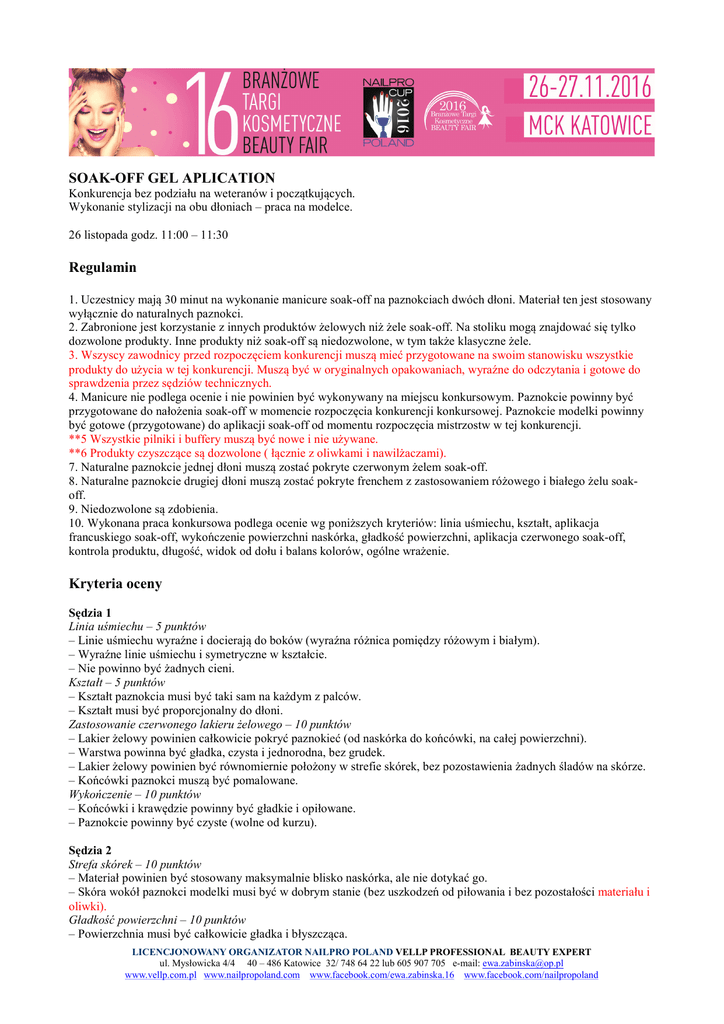 SOAK-OFF GEL APLICATION Konkurencja bez podziału na weteranów i początkujących. Wykonanie stylizacji na obu dłoniach – praca na modelce. 26 listopada godz. 11:00 – 11:30 Regulamin 1. Uczestnicy mają 30 minut na wykonanie manicure soak-off na paznokciach dwóch dłoni. Materiał ten jest stosowany wyłącznie do naturalnych paznokci. 2. Zabronione jest korzystanie z innych produktów żelowych niż żele soak-off. Na stoliku mogą znajdować się tylko dozwolone produkty. Inne produkty niż soak-off są niedozwolone, w tym także klasyczne żele. 3. Wszyscy zawodnicy przed rozpoczęciem konkurencji muszą mieć przygotowane na swoim stanowisku wszystkie produkty do użycia w tej konkurencji. Muszą być w oryginalnych opakowaniach, wyraźne do odczytania i gotowe do sprawdzenia przez sędziów technicznych. 4. Manicure nie podlega ocenie i nie powinien być wykonywany na miejscu konkursowym. Paznokcie powinny być przygotowane do nałożenia soak-off w momencie rozpoczęcia konkurencji konkursowej. Paznokcie modelki powinny być gotowe (przygotowane) do aplikacji soak-off od momentu rozpoczęcia mistrzostw w tej konkurencji. **5 Wszystkie pilniki i buffery muszą być nowe i nie używane. **6 Produkty czyszczące są dozwolone ( łącznie z oliwkami i nawilżaczami). 7. Naturalne paznokcie jednej dłoni muszą zostać pokryte czerwonym żelem soak-off. 8. Naturalne paznokcie drugiej dłoni muszą zostać pokryte frenchem z zastosowaniem różowego i białego żelu soakoff. 9. Niedozwolone są zdobienia. 10. Wykonana praca konkursowa podlega ocenie wg poniższych kryteriów: linia uśmiechu, kształt, aplikacja francuskiego soak-off, wykończenie powierzchni naskórka, gładkość powierzchni, aplikacja czerwonego soak-off, kontrola produktu, długość, widok od dołu i balans kolorów, ogólne wrażenie. Kryteria oceny Sędzia 1 Linia uśmiechu – 5 punktów – Linie uśmiechu wyraźne i docierają do boków (wyraźna różnica pomiędzy różowym i białym). – Wyraźne linie uśmiechu i symetryczne w kształcie. – Nie powinno być żadnych cieni. Kształt – 5 punktów – Kształt paznokcia musi być taki sam na każdym z palców. – Kształt musi być proporcjonalny do dłoni. Zastosowanie czerwonego lakieru żelowego – 10 punktów – Lakier żelowy powinien całkowicie pokryć paznokieć (od naskórka do końcówki, na całej powierzchni). – Warstwa powinna być gładka, czysta i jednorodna, bez grudek. – Lakier żelowy powinien być równomiernie położony w strefie skórek, bez pozostawienia żadnych śladów na skórze. – Końcówki paznokci muszą być pomalowane. Wykończenie – 10 punktów – Końcówki i krawędzie powinny być gładkie i opiłowane. – Paznokcie powinny być czyste (wolne od kurzu). Sędzia 2 Strefa skórek – 10 punktów – Materiał powinien być stosowany maksymalnie blisko naskórka, ale nie dotykać go. – Skóra wokół paznokci modelki musi być w dobrym stanie (bez uszkodzeń od piłowania i bez pozostałości materiału i oliwki). Gładkość powierzchni – 10 punktów – Powierzchnia musi być całkowicie gładka i błyszcząca. LICENCJONOWANY ORGANIZATOR NAILPRO POLAND VELLP PROFESSIONAL BEAUTY EXPERT ul. Mysłowicka 4/4 40 – 486 Katowice 32/ 748 64 22 lub 605 907 705 e-mail: [email protected] www.vellp.com.pl www.nailpropoland.com www.facebook.com/ewa.zabinska.16 www.facebook.com/nailpropoland – Na paznokciach nie powinny być zamazane lub naruszone obszary kolorów. – Nie powinno być żadnych otworów, garbów i pęcherzy – powierzchnia musi być idealnie płaska i gładka. Zastosowanie różowego i białego lakieru żelowego – 10 punktów – Biały lakier żelowy powinien obejmować czubki paznokci. – Różowy powinien zostać nałożony dokładnie w kształcie i wokół strefy skórek. Powierzchnia powinna być jednolita, gęsta i bez cieni. – Lakier powinien być nałożony jednolicie, równo i tworzyć gładką powierzchnię. Kontrola materiału – 10 punktów – Materiał powinien być nałożony tak, żeby nie zachodził na skórki i wąsy boczne. – Lakier żelowy powinien być nałożony równo – bez fal i pasów. Sędzia 3 Długość – 5 punktów – Długość jest mierzona od linii skórek aż do końca zewnętrznej krawędzi paznokcia, paznokcie na odpowiadających sobie palcach powinny być proporcjonalne. – Długość paznokci powinna być dopasowana do dłoni modelki. Widok z boku i struktura powierzchni – 10 punktów – Naniesienie lakieru żelowego na linii bocznej powinno być proste i gładkie. – Krawędzie boczne naturalnych paznokci powinny być opiłowane do pasującego kształtu. - Powierzchnia aplikacji jest gładka i idealnie wyprofilowana. - Spód paznokci jest gładki i idealnie wyprofilowany Strona wewnętrzna paznokcia – 5 punktów – Wewnętrzna strona musi być czysta, bez pozostałości lakieru żelowego. – Wewnętrzna strona paznokci obu dłoni powinna wyglądać tak samo. Ogólne wrażenie – 10 punktów – Paznokcie powinny zdobić dłonie modelki. – Praca musi być wysokiej jakości i kompletna. Skala oceny 2 dłonie 10 Bez skazy 9 Praktycznie idealny 8 Bardzo dobry 7 Dobry 6 Nieco powyżej średniej 5 Średni 4 Poniżej przeciętnej 3 Słabo 2 Bardzo słabo 1 Jest niedopuszczalnie Skala oceny 1 dłoń 5 Nienaganny 4 Bardzo dobry 3 Średni 2 Poniżej przeciętnej 1 Bardzo źle Koszt udziału: Do 16 listopada 35 euro – po 16 listopada 50 euro Nagrody :) – finansowe: 1. miejsce – 50 euro 2. miejsce – 40 euro 3. miejsce – 30 euro – medale – dyplomy – nagrody rzeczowe ufundowane przez sponsorów Każdy z uczestników otrzyma dyplom uczestnictwa podczas rejestracji. LICENCJONOWANY ORGANIZATOR NAILPRO POLAND VELLP PROFESSIONAL BEAUTY EXPERT ul. Mysłowicka 4/4 40 – 486 Katowice 32/ 748 64 22 lub 605 907 705 e-mail: [email protected] www.vellp.com.pl www.nailpropoland.com www.facebook.com/ewa.zabinska.16 www.facebook.com/nailp