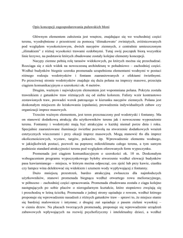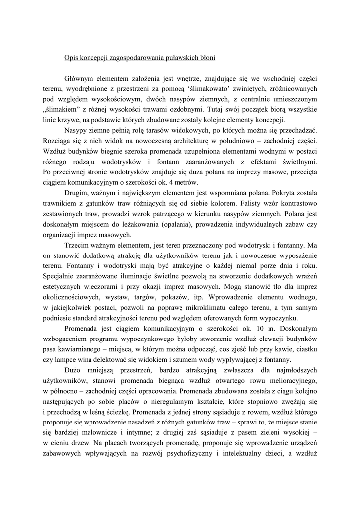 Opis koncepcji zagospodarowania puławskich błoni Głównym elementem załoŜenia jest wnętrze, znajdujące się we wschodniej części terenu, wyodrębnione z przestrzeni za pomocą ‘ślimakowato’ zwiniętych, zróŜnicowanych pod względem wysokościowym, dwóch nasypów ziemnych, z centralnie umieszczonym „ślimakiem” z róŜnej wysokości trawami ozdobnymi. Tutaj swój początek biorą wszystkie linie krzywe, na podstawie których zbudowane zostały kolejne elementy koncepcji. Nasypy ziemne pełnią rolę tarasów widokowych, po których moŜna się przechadzać. Rozciąga się z nich widok na nowoczesną architekturę w południowo – zachodniej części. WzdłuŜ budynków biegnie szeroka promenada uzupełniona elementami wodnymi w postaci róŜnego rodzaju wodotrysków i fontann zaaranŜowanych z efektami świetlnymi. Po przeciwnej stronie wodotrysków znajduje się duŜa polana na imprezy masowe, przecięta ciągiem komunikacyjnym o szerokości ok. 4 metrów. Drugim, waŜnym i największym elementem jest wspomniana polana. Pokryta została trawnikiem z gatunków traw róŜniących się od siebie kolorem. Falisty wzór kontrastowo zestawionych traw, prowadzi wzrok patrzącego w kierunku nasypów ziemnych. Polana jest doskonałym miejscem do leŜakowania (opalania), prowadzenia indywidualnych zabaw czy organizacji imprez masowych. Trzecim waŜnym elementem, jest teren przeznaczony pod wodotryski i fontanny. Ma on stanowić dodatkową atrakcję dla uŜytkowników terenu jak i nowoczesne wyposaŜenie terenu. Fontanny i wodotryski mają być atrakcyjne o kaŜdej niemal porze dnia i roku. Specjalnie zaaranŜowane iluminacje świetlne pozwolą na stworzenie dodatkowych wraŜeń estetycznych wieczorami i przy okazji imprez masowych. Mogą stanowić tło dla imprez okolicznościowych, wystaw, targów, pokazów, itp. Wprowadzenie elementu wodnego, w jakiejkolwiek postaci, pozwoli na poprawę mikroklimatu całego terenu, a tym samym podniesie standard atrakcyjności terenu pod względem oferowanych form wypoczynku. Promenada jest ciągiem komunikacyjnym o szerokości ok. 10 m. Doskonałym wzbogaceniem programu wypoczynkowego byłoby stworzenie wzdłuŜ elewacji budynków pasa kawiarnianego – miejsca, w którym moŜna odpocząć, cos zjeść lub przy kawie, ciastku czy lampce wina delektować się widokiem i szumem wody wypływającej z fontanny. DuŜo mniejszą przestrzeń, bardzo atrakcyjną zwłaszcza dla najmłodszych uŜytkowników, stanowi promenada biegnąca wzdłuŜ otwartego rowu melioracyjnego, w północno – zachodniej części opracowania. Promenada zbudowana została z ciągu kolejno następujących po sobie placów o nieregularnym kształcie, które stopniowo zwęŜają się i przechodzą w leśną ścieŜkę. Promenada z jednej strony sąsiaduje z rowem, wzdłuŜ którego proponuje się wprowadzenie nasadzeń z róŜnych gatunków traw – sprawi to, Ŝe miejsce stanie się bardziej malownicze i intymne; z drugiej zaś sąsiaduje z pasem zieleni wysokiej – w cieniu drzew. Na placach tworzących promenadę, proponuje się wprowadzenie urządzeń zabawowych wpływających na rozwój psychofizyczny i intelektualny dzieci, a wzdłuŜ ścieŜek leśnych wprowadzenie roślin zadarniających, dobrze radzących sobie z cieniem. Wspomniany wcześniej niewielki plac w centralnej części jest miejscem, w którym równieŜ moŜna umieścić urządzenia zabawowe dla młodszych dzieci. Planuje się równieŜ wprowadzenie takich urządzeń jak stoliki do gier planszowych typu szachy, itp. Elementem niezbędnym, wpływającym na funkcjonalność parku jest przemyślana i bardzo praktyczna sieć komunikacji pieszej i samochodowej, pozwalająca dotrzeć do kaŜdego miejsca w parku bez większych problemów, oczywiście z uwzględnieniem odpowiedniej ilości miejsc dla inwalidów. Ciągi komunikacji pieszej i samochodowej są wystarczająco szerokie, co zapewnia sprawne poruszanie się po parku. Dwa z nich umoŜliwiają przejazd uprawnionych samochodów, np. zaopatrzeniowych, przez cały park (od ulicy Kaniowczyków do zabudowań w południowo - zachodniej części). Wytyczne projektowe uwzględniają równieŜ wyodrębnienie miejsca na potrzeby „toalety i wybiegu dla psów”. Proponuje się przeznaczenie dla tych funkcji fragmentu terenu w północno - wschodniej części parku, mieszczącego się pomiędzy parkingiem i otwartym rowem melioracyjnym, a nasypami ziemnymi. Doskonałym rozwiązaniem byłoby umieszczenie wzdłuŜ przebiegającego tamtędy ciągu pieszego koszy i automatów z woreczkami (do sprzątania tego, co pozostawią nasi pupile), które pozwolą na zachowanie miejsca w czystości. W części północnej pomiędzy istniejącym zadrzewieniem planuje się wprowadzenie urządzeń linowych i stworzenie tzw. Parku Linowego. Miałby on składać się z róŜnego rodzaju urządzeń linowych, sportowych, przeznaczonych dla róŜnych grup wiekowych z uwzględnieniem bezpiecznych naturalnych nawierzchni. Takie urządzenia są bardzo atrakcyjne dla młodzieŜy i nie ma ich wiele na terenie miasta. Z czasem mogłyby się odbywać zawody wspinaczkowe angaŜujące całe rodziny, a nawet instytucje. Tego typu załoŜenie parkowe jakim maja być Błonia, powinno być atrakcyjne dla uŜytkowników zarówno za dnia, jak i w późnych godzinach popołudniowych i wieczornych. Ciekawa i nowoczesna kompozycja załoŜenia parkowego, uzupełniona efektowną, małą architekturą to podstawa. Tak jak zmienia się światło w ciągu dnia, tak równieŜ zmienia się nastrój poszczególnych wnętrz parkowych. Po zapadnięciu zmroku kształty i linie zaczynają się zacierać, wszystko zlewa się w jedną masę. WaŜne jest zatem, aby i po zmroku miejsce to było atrakcyjne, miało swój charakter - odmienny od tego obserwowanego w pełnym świetle, bardziej intymny i romantyczny, zbudowany za pomocą światła. Proponuje się wprowadzenie iluminacji świetlnej w miejscach najbardziej