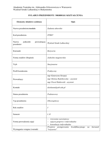 Akademia Teatralna im. Aleksandra Zelwerowicza w Warszawie Wydział Sztuki Lalkarskiej w Białymstoku SYLABUS PRZEDMIOTU /MODUŁU KSZTAŁCENIA Elementy składowe sylabusu Opis Nazwa przedmiotu/modułu Zadania aktorskie Kod przedmiotu PPR07 Nazwa jednostki przedmiot prowadzącej Wydział Sztuki Lalkarskiej Kierunek Reżyseria Forma studiów (Stopień) Jednolite magisterskie Tryb Stacjonarne Profil kształcenia Praktyczny mgr Katarzyna Siergiej Prowadzący mgr Helena Radzikowska – asystent mgr Paweł Rutkowski - asystent Kontakt [email protected] Status przedmiotu Podstawowy Typ przedmiotu Obowiązkowy Rok studiów I Semestr I, II Forma prowadzenia zajęć Wymagania wstępne (warunki ćwiczenia warsztatowe zajęcia grupowe i indywidualne konsultacje indywidualne Przejście postępowania kwalifikacyjnego "reżyseria". na kierunek Akademia Teatralna im. Aleksandra Zelwerowicza w Warszawie Wydział Sztuki Lalkarskiej w Białymstoku uczestnictwa) Semestr I Cele przedmiotu/modułu konstruowanie prostych etiud scenicznych realizacja krótkich etiud aktorskich bez tekstu (etiudy inspirowane emocją i gestem, malarstwem, muzyką, przedmiotem, etiudy zwierzęce itp.) zapoznanie z podstawowymi pojęciami, takimi jak uwaga sceniczna/koncentracja, obiekt zainteresowania, gotowość sceniczna, samorozwój twórczy, cel sceny, prawda sceniczna, gest psychologiczny praca nad monologiem wewnętrznym budowanej postaci jej procesem emocjonalnym praca nad ekspresją sceniczną praca nad powtarzalnością osiągniętego efektu scenicznego praca z partnerem kreatywna praca indywidualna i zbiorowa rozwijająca wyobraźnię umiejętność podejmowania twórczej inicjatywy teatralnej umiejętność współpracy w grupie – działania zespołowe nabycie świadomości w obrębie własnych blokad cielesnych i emocjonalnych nabycie świadomości w obrębie własnych atutów i swojego emploi Semestr II kontynuacja pracy z semestru I – dodanie krótkich zadań na tekście (ćwiczenia z pojedynczym słowem, onomatopeją, krótkim tekstem) wprowadzenie pojęć: temat, intencja, podtekst, konflikt, akceptacja budowanie etiud opartych na tekście Semestr I Etiudy z wykorzystaniem środków pozawerbalnych. Treści kształcenia Efekty kształcenia Semestr II Etiudy z użyciem krótkiego materiału tekstowego. W zakresie wiedzy (W) student: rozumie relację pomiędzy teorią techniki gry aktorskiej (opisaną przez K.Stanisławskiego, M.A.Czechowa i E. Wachtangowa) oraz jej praktycznym zastosowaniem na scenie, np. do realizacji etiudy opartej na emocji. ( RW14) W zakresie umiejętności (U) student: Akademia Teatralna im. Aleksandra Zelwerowicza w Warszawie Wydział Sztuki Lalkarskiej w Białymstoku tworzy i realizuje własne koncepcje artystyczne prowadzące do wykreowania etiudy teatralnej). (RU1) dyskutuje z osobami z zespołu, a następnie analizuje opinie i wyciąga wnioski tak, aby skutecznie dążyć do realizacji wspólnego celu, jakim jest zagranie zespołowej etiudy(RU7) samodzielnie doskonali umiejętności warsztatowe, np. poprzez powtarzanie ćwiczeń opisanych w podręcznikach lub zaproponowanych przez wykładowcę. (RU9) analizuje, poddaje krytyce oraz ocenie scenariusz lub plan etiudy, tak, aby móc w sposób twórczy je udoskonalać i pracować nad nimi wykraczając poza ustalone ramy (RU13) W zakresie kompetencji społecznych (K) student: zbiera i analizuje informacje na temat roli i okoliczności założonych. Student wykazuje się odpowiedzialnością za podjęte zadania oraz organizuje samodzielnie pracę. (RK1) wykazuje kreatywność i odwagę w wykorzystywaniu własnych emocji, intuicji i wyobraźni. Student przestrzega świadomie reguł i zasad wystąpień publicznych, za które bierze odpowiedzialność. (RK2) wykazuje umiejętność samooceny. (RK3) efektywnie komunikuje się i angażuje się w pracę zespołową. ( RK6) Forma zaliczenia przedmiotu I sem. - Egzamin II sem. - Egzamin Komisyjny egzamin praktyczny obejmujący wykonanie określonej pracy praktycznej: prezentacja sceniczna etiudy przed komisją egzaminacyjną. Sposoby weryfikacji Ustalenie oceny zaliczeniowej odbywa się na podstawie egzaminu oraz efektów osiąganych podczas pracy samodzielnej i zespołowej podczas zajęć, a także na podstawie oceny stosunku/etyki pracy. Liczba godzin zajęć dydaktycznych 120 Liczba punktów ECTS 4 pkt Język wykładowy polski Wykaz literatury podstawowej 1. Wasilij O. Toporkow: „Stanisławski na próbie” 2. Michaił Czechow: „O technice aktora” Akademia Teatralna im. Aleksandra Zelwerowicza w Warszawie Wydział Sztuki Lalkarskiej w Białymstoku Wykaz literatury uzupełniającej Uwagi 3. W. Lwowa, L. Szachmatow: Pierwsze etiudy, ćwiczenia sceniczne 4. S. Book „Podręcznik da aktorów” 1. Konstanty Stanisławski: „Praca aktora nad sobą” 2. Konstanty Stanisławski: „Praca aktora nad rolą” 3. Konstanty Stanisławski: „Moje życie w sztuce” 4. Jerzy Grotowski: „Ku teatrowi ubogiemu” 5. Omraam Mikhaël Aivanhov: „Twórczość artystyczna i twórczość duchowa” 6. K. Johnstone: „Impro:Spontaniczne kreowanie świata” Stała współpraca pedagogów z zakresu wymowy i impostacji Akademia Teatralna im. Aleksandra Zelwerowicza w Warszawie Wydział Sztuki Lalkarskiej w Białymstoku SYLABUS PRZEDMIOTU /MODUŁU KSZTAŁCENIA Elementy składowe sylabusu Opis Nazwa przedmiotu/modułu Zadania aktorskie Kod przedmiotu PPR07Ww Nazwa jednostki prowadzącej przedmiot Wydział Sztuki Lalkarskiej Kierunek Reżyseria Forma studiów (Stopień) Jednolite magisterskie Tryb Stacjonarne Profil kształcenia Praktyczny Prowadzący dr hab. Sylwia Janowicz-Dobrowolska mgr Miłosz Pietruski - asystent Kontakt [email protected] Status przedmiotu Podstawowy Wolnego wyboru Typ przedmiotu Limit osób: 2 Rok studiów II Semestr III, IV Forma prowadzenia zajęć Wymagania wstępne (warunki uczestnictwa) ćwiczenia warsztatowe zajęcia grupowe i indywidualne konsultacje indywidualne Przejście post