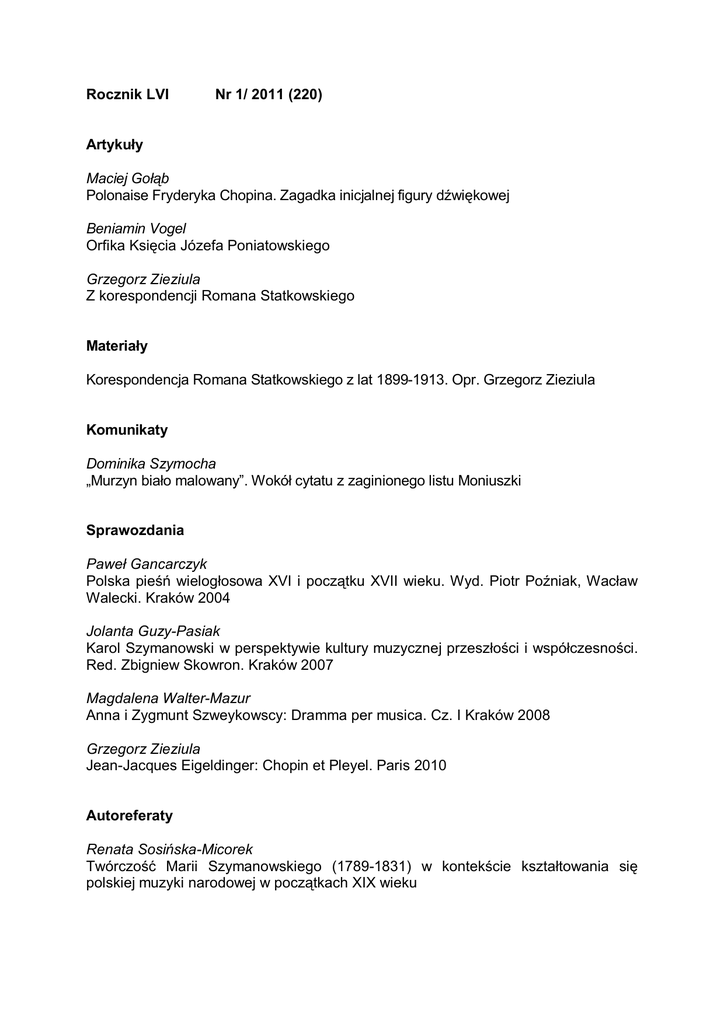 Rocznik LVI Nr 1/ 2011 (220) Artykuły Maciej Gołąb Polonaise Fryderyka Chopina. Zagadka inicjalnej figury dźwiękowej Beniamin Vogel Orfika Księcia Józefa Poniatowskiego Grzegorz Zieziula Z korespondencji Romana Statkowskiego Materiały Korespondencja Romana Statkowskiego z lat 1899-1913. Opr. Grzegorz Zieziula Komunikaty Dominika Szymocha „Murzyn biało malowany”. Wokół cytatu z zaginionego listu Moniuszki Sprawozdania Paweł Gancarczyk Polska pieśń wielogłosowa XVI i początku XVII wieku. Wyd. Piotr Poźniak, Wacław Walecki. Kraków 2004 Jolanta Guzy-Pasiak Karol Szymanowski w perspektywie kultury muzycznej przeszłości i współczesności. Red. Zbigniew Skowron. Kraków 2007 Magdalena Walter-Mazur Anna i Zygmunt Szweykowscy: Dramma per musica. Cz. I Kraków 2008 Grzegorz Zieziula Jean-Jacques Eigeldinger: Chopin et Pleyel. Paris 2010 Autoreferaty Renata Sosińska-Micorek Twórczość Marii Szymanowskiego (1789-1831) w kontekście kształtowania się polskiej muzyki narodowej w początkach XIX wieku