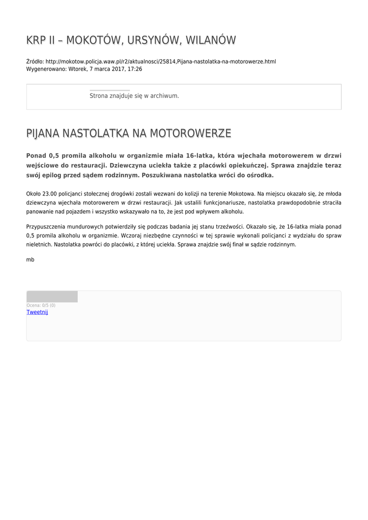 KRP II – MOKOTÓW, URSYNÓW, WILANÓW Źródło: http://mokotow.policja.waw.pl/r2/aktualnosci/25814,Pijana-nastolatka-na-motorowerze.html Wygenerowano: Wtorek, 7 marca 2017, 17:26 Strona znajduje się w archiwum. PIJANA NASTOLATKA NA MOTOROWERZE Ponad 0,5 promila alkoholu w organizmie miała 16-latka, która wjechała motorowerem w drzwi wejściowe do restauracji. Dziewczyna uciekła także z placówki opiekuńczej. Sprawa znajdzie teraz swój epilog przed sądem rodzinnym. Poszukiwana nastolatka wróci do ośrodka. Około 23.00 policjanci stołecznej drogówki zostali wezwani do kolizji na terenie Mokotowa. Na miejscu okazało się, że młoda dziewczyna wjechała motorowerem w drzwi restauracji. Jak ustalili funkcjonariusze, nastolatka prawdopodobnie straciła panowanie nad pojazdem i wszystko wskazywało na to, że jest pod wpływem alkoholu. Przypuszczenia mundurowych potwierdziły się podczas badania jej stanu trzeźwości. Okazało się, że 16-latka miała ponad 0,5 promila alkoholu w organizmie. Wczoraj niezbędne czynności w tej sprawie wykonali policjanci z wydziału do spraw nieletnich. Nastolatka powróci do placówki, z której uciekła. Sprawa znajdzie swój finał w sądzie rodzinnym. mb Ocena: 0/5 (0) Tweetnij