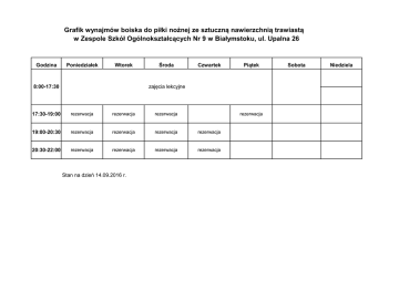 Grafik wynajmów boiska do piłki nożnej ze sztuczną nawierzchnią trawiastą w Zespole Szkół Ogólnokształcących Nr 9 w Białymstoku, ul. Upalna 26 Godzina Poniedziałek Wtorek Środa Czwartek Piątek zajęcia lekcyjne 8:00-17:30 17:30-19:00 rezerwacja rezerwacja rezerwacja 19:00-20:30 rezerwacja rezerwacja rezerwacja rezerwacja 20:30-22:00 rezerwacja rezerwacja rezerwacja rezerwacja Stan na dzień 14.09.2016 r. rezerwacja Sobota Niedziela