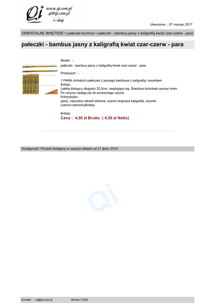 Utworzono : 07 marzec 2017 ORIENTALNE WNĘTRZE > pałeczki kuchnia > pałeczki - bambus jasny z kaligrafią kwiat czar-czerw - para pałeczki - bambus jasny z kaligrafią kwiat czar-czerw - para Model : pałeczki - bambus jasny z kaligrafią kwiat czar-czerw - para Producent : 1 PARA chińskich pałeczek z jasnego bambusa z kaligrafią i wzorkiem. Lekkie, o długości 22,5cm, zwężające się. Średnica końcówki wynosi 4mm. Po umyciu nadają się do ponownego użycia. Kolorystyka : jasny, naturalny odcień drewna, czarno brązowa kaligrafia, wzorek czarno-czerwony Cena : 4,50 zł Brutto ( 4,50 zł Netto) Dostępność: Produkt dostępny w naszym sklepie od 21 lipiec 2016 i Q kontakt : - [email protected] Strona 1/{nb}