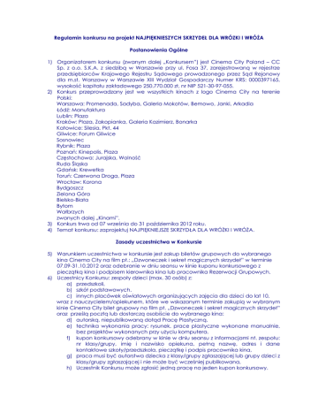 Regulamin konkursu na projekt NAJPIĘKNIESZYCH SKRZYDEŁ DLA WRÓZKI I WRÓŻA Postanowienia Ogólne 1) Organizatorem konkursu (zwanym dalej „Konkursem”) jest Cinema City Poland – CC Sp. z o.o. S.K.A. z siedzibą w Warszawie przy ul. Fosa 37, zarejestrowaną w rejestrze przedsiębiorców Krajowego Rejestru Sądowego prowadzonego przez Sąd Rejonowy dla m.st. Warszawy w Warszawie XIII Wydział Gospodarczy Numer KRS: 0000397165, wysokość kapitału zakładowego 250.770.000 zł, nr NIP 521-30-97-055. 2) Konkurs przeprowadzany jest we wszystkich kinach z logo Cinema City na terenie Polski: Warszawa: Promenada, Sadyba, Galeria Mokotów, Bemowo, Janki, Arkadia Łódź: Manufaktura Lublin: Plaza Kraków: Plaza, Zakopianka, Galeria Kazimierz, Bonarka Katowice: Silesia, Pkt. 44 Gliwice: Forum Gliwice Sosnowiec Rybnik: Plaza Poznań: Kinepolis, Plaza Częstochowa: Jurajska, Wolność Ruda Śląska Gdańsk: Krewetka Toruń: Czerwona Droga, Plaza Wrocław: Korona Bydgoszcz Zielona Góra Bielsko-Biała Bytom Wałbrzych zwanych dalej „Kinami”. 3) Konkurs trwa od 07 września do 31 października 2012 roku. 4) Temat konkursu: zaprojektuj NAJPIĘKNIEJSZE SKRZYDŁA DLA WRÓŻKI I WRÓŻA. Zasady uczestnictwa w Konkursie 5) Warunkiem uczestnictwa w konkursie jest zakup biletów grupowych do wybranego kina Cinema City na film pt.: „Dzwoneczek i sekret magicznych skrzydeł” w terminie 07.09-31.10.2012 oraz odebranie w dniu seansu w kinie kuponu konkursowego z pieczątką kina i podpisem kierownika kina lub pracownika Rezerwacji Grupowych. 6) Uczestnicy Konkursu: zespoły dzieci (max. 30 osób) z: a) przedszkoli, b) szkół podstawowych. c) innych placówek oświatowych organizujących zajęcia dla dzieci do lat 10, wraz z nauczycielem/opiekunem, które we wskazanym terminie zakupią w wybranym kinie Cinema City bilet grupowy na film pt. „Dzwoneczek i sekret magicznych skrzydeł” oraz prześlą pocztą lub dostarczą osobiście do wybranego kina: d) autorską, niepublikowaną dotąd Pracę Plastyczną, e) technika wykonania pracy: rysunek, prace plastyczne wykonane manualnie, bez projektów wykonanych przy użyciu komputera. f) kupon konkursowy odebrany w kinie w dniu seansu z informacjami nt. zespołu: nr klasy/grupy, imię i nazwisko opiekuna, pełną nazwę, adres i dane kontaktowe szkoły/przedszkola, pieczątkę i podpis pracownika kina, g) praca musi być autorstwa dziecka z klasy/grupy zgłaszającej lub grupy dzieci z klasy/grupy zgłaszającej i nie może być wcześniej publikowana, h) Uczestnik Konkursu może zgłosić jedną pracę na jeden kupon konkursowy. 7) Udział w Konkursie i podanie związanych z udziałem danych są całkowicie dobrowolne. 8) Przez przystąpienie do udziału w Konkursie Uczestnik oświadcza, że zapoznał się z niniejszym Regulaminem i akceptuje jego postanowienia. Kryteria ocen i zasady przyznawania nagród 9) Prace będą oceniane w dwóch etapach: a) Etap I lokalny – w 19 miastach zostaną zwołane dwuosobowe komisje składające się z kierownictwa lokalnych kin Cinema City, które w ciągu 7 dni od daty zakończenia konkursu wytypują trzy najlepsze prace, które zostaną przesłane do siedziby firmy Cinema City na ul. Fosa 37, Warszawa. b) Etap II ogólnopolski – ze wszystkich nadesłanych prac komisja w składzie: dwóch pracowników Cinema City, przedstawiciela Dystrybutora Forum Film oraz przedstawiciela Wydawnictwa EGMONT wyłoni zwycięzców. Nagrodzone zostaną 3 pierwsze miejsca. Wyniki zostaną ogłoszone najpóźniej 30 listopada 2012 roku. 10) Praca będzie oceniana pod względem: a) wierności tematowi pracy, czyli: projekt NAJPIĘKNIEJSZYCH SKRZYDEŁ DLA WRÓŻKI I WRÓŻA – od 0 do 5 pkt. (max. 25% oceny), b) oryginalności – od 0 do 5 pkt. (max. 25% oceny), c) stopnia trudności – od 0 do 5 pkt. (max. 25% oceny), d) jakości wykonania pracy – od 0 do 5 pkt. (max. 25% oceny). 11) Prace niespełniające warunków regulaminowych nie będą klasyfikowane przez Komisje a decyzje Komisji będą ostateczne i nieodwołalne. 12) Prace przesłane po terminie 31.10.2012 nie będą oceniane (w przypadku prac przesyłanych pocztą liczy się data stempla pocztowego). 13) Organizatorzy nie ponoszą odpowiedzialności za uszkodzenia powstałe podczas przesyłki. 14) Prace przechodzą na własność organizatora i nie będą odsyłane. 15) Nagrody w Konkursie zapewnia Wydawnictwo EGMONT: a) Miejsce I – zestaw gier planszowych o wartości 5 000 zł (tytuły gier do wyboru ze wskazanej przez Wydawnictwo EGMONT puli). b) Miejsce II i III – zestaw gier planszowych o wartości 2 500 zł (tytuły gier do wyboru ze wskazanej przez Wydawnictwo EGMONT puli). 16) Nagrody zostaną przyznane przez Organizatora w terminie 14 dni od ogłoszenia wyników Konkursu. 17) Laureaci konkursu zostaną poinformowani o przyznaniu nagród telefonicznie lub/oraz drogą mailową w terminie 7 dni od dnia przyznania nagrody. 18) Nagrody zostaną przekazane opiekunowi grupy lub dyrektorowi na rzecz szkoły/placówki oświatowej. 19) Nagrody nie mogą być wymieniane na ekwiwalent pieniężny, ani żadną inną formę gratyfikacji. Prawa autorskie i ochrona danych osobowych 20) Organizator nie ponosi odpowiedzialności za prawdziwość danych wskazanych przez Uczestnika podczas zgłoszenia. 21) Dane osobowe uczestników Konkursu przekazane Organizatorowi w czasie Konkursu będą przetwarzane w celach związanych z organizacją i realizacją Konkursu oraz w prawnie dopuszczalnych celach marketingowych związanych z działalnością gospodarczą Organizatora, przy zachowaniu zasad określonych w ustawie o ochronie danych osobowych (teks jednolity Dz. U. z 2002 r., nr 101, poz. 926). Każdemu Uczestnikowi Konkursu służy prawo dostępu do jego danych osobowych przekazanych Organizatorowi w czasie trwania Konkursu oraz ich poprawiania. 22) 23) 24) 25) 26) 27) 28) Administratorem danych osobowych jest spółka Cinema City Poland - CC Sp. z o.o. S.K.A. z siedzibą w W