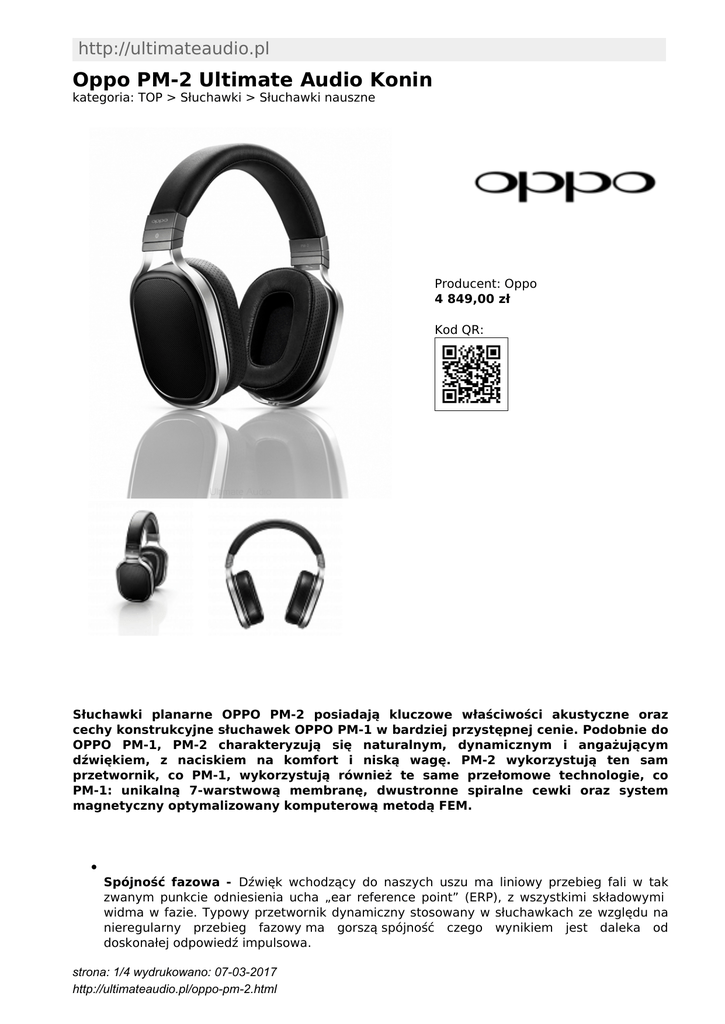 http://ultimateaudio.pl Oppo PM-2 Ultimate Audio Konin kategoria: TOP > Słuchawki > Słuchawki nauszne Producent: Oppo 4 849,00 zł Kod QR: Słuchawki planarne OPPO PM-2 posiadają kluczowe właściwości akustyczne oraz cechy konstrukcyjne słuchawek OPPO PM-1 w bardziej przystępnej cenie. Podobnie do OPPO PM-1, PM-2 charakteryzują się naturalnym, dynamicznym i angażującym dźwiękiem, z naciskiem na komfort i niską wagę. PM-2 wykorzystują ten sam przetwornik, co PM-1, wykorzystują również te same przełomowe technologie, co PM-1: unikalną 7-warstwową membranę, dwustronne spiralne cewki oraz system magnetyczny optymalizowany komputerową metodą FEM. Spójność fazowa - Dźwięk wchodzący do naszych uszu ma liniowy przebieg fali w tak zwanym punkcie odniesienia ucha „ear reference point” (ERP), z wszystkimi składowymi widma w fazie. Typowy przetwornik dynamiczny stosowany w słuchawkach ze względu na nieregularny przebieg fazowy ma gorszą spójność czego wynikiem jest daleka od doskonałej odpowiedź impulsowa. strona: 1/4 wydrukowano: 07-03-2017 http://ultimateaudio.pl/oppo-pm-2.html Czysto rezystancyjny przebieg impedancji - Przetworniki planarne OPPO mają postać płaskiego przewodnika bez elementów indukcyjnych. Eliminuje to zniekształcenia intermodulacyjne związane z indukcyjnością cechujące przetworniki dynamiczne o wysokiej impedancji. Jednorodność, spójność oraz stabilność - Wiele słuchawek planarnych posiada dużą rozbieżność pomiędzy lewym i prawym kanałem, podczas gdy poprawne odwzorowanie efektu stereo jest ściśle zależne od ścisłej zgodności pomiędzy kanałami lewym i prawym. Podczas procesu produkcji, przetworniki w OPPO PM-2 są ze sobą dokładnie parowane celem zapewnienia optymalnego odwzorowania sceny stereo Membrana - Membrana przetwornika planarnego OPPO posiada 7 cienkich warstw materiału, które dostarczają doskonałą jakość i równowagę dźwięku oraz wysoką żywotność. Konstrukcja membrany zapewnia doskonałą stabilność , nawet przy wysokim obciążeniu termicznym, czy dużych wibracjach. Dwustronne spiralne cewki - Membrana posiada po obu stronach płaskie przewodniki w kształcie spirali, a obustronna konstrukcja pozwala na umieszczenie w polu magnetycznym dwa razy większej ilości przewodników, co prowadzi do jeszcze wyższej skuteczności, lepszego tłumienia oraz większej siły napędowej. Magnesy zoptymalizowane metodą FEM - PM-2 używają napędu magnetycznego optymalizowanego komputerową metoda FEM opartego na bardzo silnych magnesach neodymowych celem zmaksymalizowania skuteczności i dokładności siły przykładanej do przetwornika. Wysoka skuteczność - Wiele słuchawek planarnych ma skuteczność sporo poniżej 100dB i wymagają bardzo mocnych wzmacniaczy do wysterowania. OPPO PM-2 posiadają skuteczność 102 dB, co pozwala na ich połączenie z urządzeniami mobilnymi oraz pokazanie pełni możliwości w połączeniu z wysokiej klasy wzmacniaczami słuchawkowymi. Jakość wykonania - Wzmocniona konstrukcja słuchawek OPPO PM-2 stworzona została z myślą o wielu latach użytkowania oraz maksymalnej powtarzalności parametrów pomiędzy poszczególnymi egzemplarzami. Słuchawki zostały przetestowane w laboratorium o bardzo wysokich standardach pod kątem wytrzymałości na czynniki zewnętrzne oraz zużycie wynikające z upływającego czasu , aby zagwarantować nadzwyczajną jakość i wytrzymałość przez cały czas użytkowania. strona: 2/4 wydrukowano: 07-03-2017 http://ultimateaudio.pl/oppo-pm-2.html Komfort - Wiele słuchawek planarnych waży ponad 500g i często uznawane są za niekomfortowe. OPPO PM-2 z wagą 385g zapewnia idealny balans pomiędzy wagą, komfortem użytkowania oraz eleganckim wzornictwem. Wysokiej jakości materiały - Pady słuchawek OPPO PM-2 zostały wykonane z najwyższej jakości naturalnego lateksu, który jest dużo lepszy oraz wytrzymalszy od jakiejkolwiek chemicznie wytworzonej pianki. Materiał ten jest hipoalergiczny, zachowuje on swą sprężystość przez o wiele dłuższy czas, oraz jest odporny na zwiększoną wilgotność i pot. Pałąk oraz pady zostały pokryte starannie dobraną syntetyczną skórą. Łatwo wymienialne elementy - Pady w OPPO PM-2 zostały zamontowane na gumowych kołeczkach, co sprawia że łatwo je zdjąć lub wyczyścić. Taka konstrukcja pozwala na bezproblemowe zastosowanie w PM-2 padów od słuchawek OPPO PM-1. Kabel można bez problemu odłączyć od słuchawek. Jest on połączony do słuchawek dwoma wtykami mono jack 2.5mm, co pozwala na prostą wymianę pomiędzy dłuższym kablem z końcówką 6.35mm do użytku domowego, a krótkim kablem z końcówką 3.5mm do używania z urządzeniami przenośnymi. Dołączone do słuchawek wysokiej klasy akcesoria - Kabel 6.35mm wykonany został w technologii OFC oraz powleczony czarną otuliną. Pokrowiec wykonany z wysokiej jakości jeansu (selvedge) zapewni odpowiednią ochronę w transporcie. OPPO w wyjątkowy sposób integruje wiele innowacji i własnych metod opracowanych w ciągu lat wraz z najnowszymi osiągnięciami w dziedzinie materiałów oraz technik produkcyjnych. W rezultacie tych badań koncentruje się na wyeliminowaniu problemów dotykających wiele słuchawek planarnych, takich jak niska czułość, wysoka waga czy niestabilność membrany, te wszystkie wady poprawiono w nowej technologii opracowanej przez OPPO. PM-2 używają napędu magnetycznego optymalizowanego metoda FEM opartego na bardzo silnych magnesach neodymowych. Duża owalna i płaska membrana jest umieszczona w równomiernym i symetrycznym polu magnetycznym. Membrana jest zrobiona ze spiralnie ułożonego płaskiego przewodnika powleczonego dwustronnie bardzo cienką folią polimerową. System magnetyczny oraz układ przewodnika są zoptymalizowane dla osiągnięcia maksymalnej siły napędowej (czułości) i zgodności przyłożonej siły do powierzchni promieniującej. Dwustronna memb