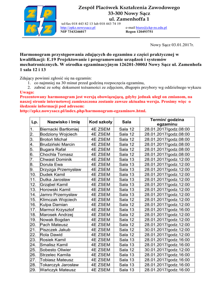 Zespół Placówek Kształcenia Zawodowego 33-300 Nowy Sącz ul. Zamenhoffa 1 tel/fax 018 443 82 13 lub 018 443 74 19 http://zpkz.nowysacz.pl NIP 7343246017 e-mail [email protected] Regon 120493751 Nowy Sącz 03.01.2017r. Harmonogram przystępowania zdających do egzaminu z części praktycznej w kwalifikacji: E.19 Projektowanie i programowanie urządzeń i systemów mechatronicznych. W ośrodku egzaminacyjnym 126201-3000J Nowy Sącz ul. Zamenhofa 1 sala 12 i 13 Zdający powinni zgłosić się na egzamin: 1. co najmniej na 30 minut przed godziną rozpoczęcia egzaminu, 2. zabrać ze sobą: dokument tożsamości ze zdjęciem, długopis przybory wg oddzielnego wykazu Uwaga: Prezentowany harmonogram jest wersją obowiązującą, gdyby jednak uległ on zmianom, na naszej stronie internetowej zamieszczona zostanie zawsze aktualna wersja. Prosimy więc o śledzenie informacji pod adresem: http://zpkz.nowysacz.pl/index.php/harmonogram-egzaminow.html. Lp. 1. 2. 3. 4. 5. 6. 7. 8. 9. 10. 11. 12. 13. 14. 15. 16. 17. 18. 19. 20. 21. 22. 23. 24. 25. 26. 27. 28. 29. Nazwisko i Imię Biernacki Bartłomiej Bodziony Wojciech Brotoń Michał Brudziński Marcin Bugara Rafał Chochla Tomasz Chwast Dominik Dorula Ewa Drzyzga Przemysław Dudek Kamil Dutka Jarosław Grząbel Kamil Horowski Kamil Jamro Przemysław Klimczak Wojciech Kulpa Damian Marmol Krzysztof Marosek Andrzej Nowak Bogdan Pach Mateusz Piszczek Jakub Rola Dawid Rosiek Kamil Smalisz Kamil Sobesto Oliwier Strzelec Kamila Tobiasz Mateusz Tokarczyk Jarosław Wańczyk Mateusz Kod szkoły Sala 4E ZSEM 4E ZSEM 4E ZSEM 4E ZSEM 4E ZSEM 4E ZSEM 4E ZSEM 4E ZSEM 4E ZSEM 4E ZSEM 4E ZSEM 4E ZSEM 4E ZSEM 4E ZSEM 4E ZSEM 4E ZSEM 4E ZSEM 4E ZSEM 4E ZSEM 4E ZSEM 4E ZSEM 4E ZSEM 4E ZSEM 4E ZSEM 4E ZSEM 4E ZSEM 4E ZSEM 4E ZSEM 4E ZSEM Sala 12 Sala 12 Sala 12 Sala 12 Sala 12 Sala 12 Sala 13 Sala 13 Sala 13 Sala 13 Sala 13 Sala 13 Sala 13 Sala 13 Sala 12 Sala 12 Sala 13 Sala 12 Sala 12 Sala 12 Sala 12 Sala 12 Sala 13 Sala 13 Sala 12 Sala 13 Sala 13 Sala 13 Sala 13 Termin/ godzina egzaminu 28.01.2017/godz.08:00 28.01.2017/godz.08:00 28.01.2017/godz.08:00 28.01.2017/godz.08:00 28.01.2017/godz.08:00 28.01.2017/godz.08:00 28.01.2017/godz.12:00 28.01.2017/godz.12:00 28.01.2017/godz.12:00 28.01.2017/godz.12:00 28.01.2017/godz.12:00 28.01.2017/godz.12:00 28.01.2017/godz.12:00 28.01.2017/godz.12:00 28.01.2017/godz.12:00 28.01.2017/godz.12:00 28.01.2017/godz.16:00 28.01.2017/godz.12:00 28.01.2017/godz.12:00 28.01.2017/godz.12:00 30.01.2017/godz.12:00 28.01.2017/godz.12:00 28.01.2017/godz.16:00 28.01.2017/godz.16:00 30.01.2017/godz.12:00 28.01.2017/godz.16:00 28.01.2017/godz.16:00 28.01.2017/godz.16:00 28.01.2017/godz.16:00