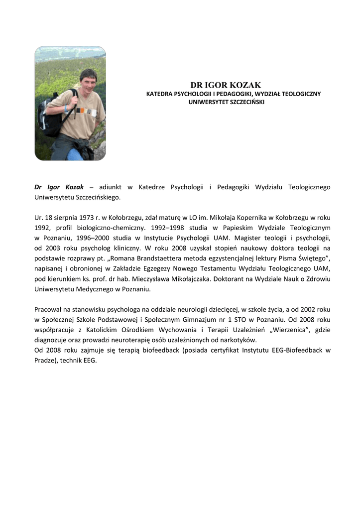 DR IGOR KOZAK KATEDRA PSYCHOLOGII I PEDAGOGIKI, WYDZIAŁ TEOLOGICZNY UNIWERSYTET SZCZECIŃSKI Dr Igor Kozak – adiunkt w Katedrze Psychologii i Pedagogiki Wydziału Teologicznego Uniwersytetu Szczecińskiego. Ur. 18 sierpnia 1973 r. w Kołobrzegu, zdał maturę w LO im. Mikołaja Kopernika w Kołobrzegu w roku 1992, profil biologiczno-chemiczny. 1992–1998 studia w Papieskim Wydziale Teologicznym w Poznaniu, 1996–2000 studia w Instytucie Psychologii UAM. Magister teologii i psychologii, od 2003 roku psycholog kliniczny. W roku 2008 uzyskał stopień naukowy doktora teologii na podstawie rozprawy pt. „Romana Brandstaettera metoda egzystencjalnej lektury Pisma Świętego”, napisanej i obronionej w Zakładzie Egzegezy Nowego Testamentu Wydziału Teologicznego UAM, pod kierunkiem ks. prof. dr hab. Mieczysława Mikołajczaka. Doktorant na Wydziale Nauk o Zdrowiu Uniwersytetu Medycznego w Poznaniu. Pracował na stanowisku psychologa na oddziale neurologii dziecięcej, w szkole życia, a od 2002 roku w Społecznej Szkole Podstawowej i Społecznym Gimnazjum nr 1 STO w Poznaniu. Od 2008 roku współpracuje z Katolickim Ośrodkiem Wychowania i Terapii Uzależnień „Wierzenica”, gdzie diagnozuje oraz prowadzi neuroterapię osób uzależnionych od narkotyków. Od 2008 roku zajmuje się terapią biofeedback (posiada certyfikat Instytutu EEG-Biofeedback w Pradze), technik EEG.