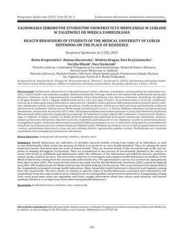 Rozprawy Społeczne 2015, Tom IX, Nr 2 Zachowania zdrowotne studentów uniwersytetu... ZACHOWANIA ZDROWOTNE STUDENTÓW UNIWERSYTETU MEDYCZNEGO W LUBLINIE W ZALEŻNOŚCI OD MIEJSCA ZAMIESZKANIA HEALTH BEHAVIOURS OF STUDENTS OF THE MEDICAL UNIVERSITY OF LUBLIN DEPENDING ON THE PLACE OF RESIDENCE Rozprawy Społeczne, nr 2 (IX), 2015 Beata Kropornicka1, Bożena Baczewska1, Wioleta Dragan, Ewa Krzyżanowska1, Cecylia Olszak1, Ewa Szymczuk2 Katedra Interny z Zakładem Pielęgniarstwa Internistycznego, Wydział Nauk o Zdrowiu, Uniwersytet Medyczny w Lublinie 2 Katedra Zdrowia, Wydział Nauk o Zdrowiu i Nauk Społecznych, Państwowa Szkoła Wyższa im. Papieża Jana Pawła II w Białej Podlaskiej 1 Kropornicka B., Baczewska B., Dragan W., Krzyżanowska E., Olszak C., Szymczuk E. (2015), Zachowania zdrowotne studentów Uniwersytetu Medycznego w Lublinie w zależności od miejsca zamieszkania. Rozprawy Społeczne, 2 (IX), s. 58-64. Streszczenie: Zachowania zdrowotne to wskaźniki postaw wobec zdrowia, wynikające z przyjętych przez jednostkę wartości, a także każde intencjonalnie podjęte działanie jednostki, którego celem jest utrwalenie lub podnoszenie potencjału zdrowia. Zaliczane są do najważniejszych czynników, które determinują stan zdrowia człowieka. Kształtują się głównie w drugiej dekadzie życia i ulegają modelowaniu przez cały czas jego trwania. Są przekazywane w procesie socjalizacji, tworzą się w toku społecznych interakcji w dzieciństwie i młodości pod wpływem informacji przekazywanych przez rodziców, opiekunów, szkołę, środki masowego przekazu, służby medyczne. Celem pracy było poznanie i porównanie zachowań zdrowotnych studentów Uniwersytetu Medycznego pochodzących ze wsi i z miasta. Badania ankietowe przeprowadzono anonimowo, od kwietnia do czerwca 2013 roku. Narzędziem badawczym wykorzystanym w pracy był Inwentarz Zachowań Zdrowotnych (IZZ) autorstwa Zygfryda Juczyńskiego. W badaniach wzięło udział 200 studentów z Uniwersytetu Medycznego w Lublinie. Z badań wynika, że blisko połowa badanych prezentowała przeciętne zachowania zdrowotne. Korzystniejsze zachowania zdrowotne charakteryzowały studentów pochodzących ze wsi. Najlepsze wyniki w odniesieniu do poszczególnych typów zachowań zdrowotnych uzyskali badani pochodzący ze wsi w obszarach związanych z prawidłowymi nawykami żywieniowymi oraz zachowaniami pro ilaktycznymi. Młodzież pochodząca ze wsi częściej spożywała warzywa i owoce, poszukiwała informacji o tym, jak inni unikają chorób i ograniczała palenie tytoniu. Pochodzenie jest istotnym czynnikiem determinującym zachowania zdrowotne. Słowa kluczowe: zachowania zdrowotne, studenci, miasto, wieś Summary: Health behaviours are indicators of attitudes towards health, arising from values of an individual, as well as any intentionally taken action the purpose of which is to preserve or raise health potential. They are among the most important factors that determine the state of human health. They are formed mainly in the second decade of life and are prone to shaping throughout its duration. They are transmitted in the process of socialization, formed in the course of social interaction in childhood and adolescence under the in luence of the information provided by parents, guardians, school, media, medical services. The aim of the study was to investigate and compare health behaviours of students of the Medical University coming from the countryside and from the city. The questionnaire survey was carried out anonymously from April to June 2013. The research tool used in the work was the Health Behaviour Inventory (IZZ) created by Zygfryd Juczyński. 200 students from the Medical University of Lublin took part in the survey. The research shows that almost half of the respondents presented average health behaviours. More favourable health behaviours characterized students coming from the countryside. The best results in relation to speci ic types of health behaviours examined were obtained by the respondents from the countryside in areas related to correct eating habits and preventive behaviours. Young people coming from rural areas more often ate vegetables and fruits, sought information about how others avoid diseases and limited smoking. Ethnicity is an important factor determining health behaviours. Keywords: health behaviours, students, city, countryside Adres do korespondencji: Beata Kropornicka, Katedra Interny z Zakładem Pielęgniarstwa Internistycznego, Uniwersytet Medyczny w Lublinie, ul. Jaczewskiego 8, 20-950 Lublin, e-mail: [email protected], tel. 817187318 - 58 - Rozprawy Społeczne 2015, Tom IX, Nr 2 Zachowania zdrowotne studentów uniwersytetu... Wstęp uzależnień (Baran, Stocka 2008). Studenci poszukujący doznań wybierają te zachowania, które nie są akceptowane społecznie: palenie papierosów, nadużywanie alkoholu, czy sięganie po inne substancje psychoaktywne (Łaszek 2011, Makarowski i in. 2008). Szczególny niepokój mogą budzić niekorzystne zachowania zdrowotne tych osób, które z uwagi na charakter wykonywanego w przyszłości zawodu, sami powinni stanowić wzorce pozytywnych zachowań zdrowotnych, np. palenie tytoniu wśród studentów medycyny, wydziałów nauk o zdrowiu (Choi Won 2003). Do pozostałych uwarunkowań zachowań zdrowotnych należą również takie czynniki jak: niski poziom wiedzy o zdrowiu młodzieży studiującej, niski status ekonomiczny, brak umiejętności efektywnego radzenia sobie z nadmiarem obowiązków i zajęć, negatywne wzorce w środowisku rodzinnym (alkoholizm, palenie tytoniu, częste zmiany partnerów seksualnych przez rodziców) oraz narastająca potrzeba samodzielności wynikająca z faktu przybliżania się do dorosłości (Abramczyk i in. 2002). Niezwykle istotna może być też w przypadku części studiującej młodzieży zmiana miejsca zamieszkania. Stąd też celem niniejszej pracy było poznanie i porównanie zachowań zdrowotny