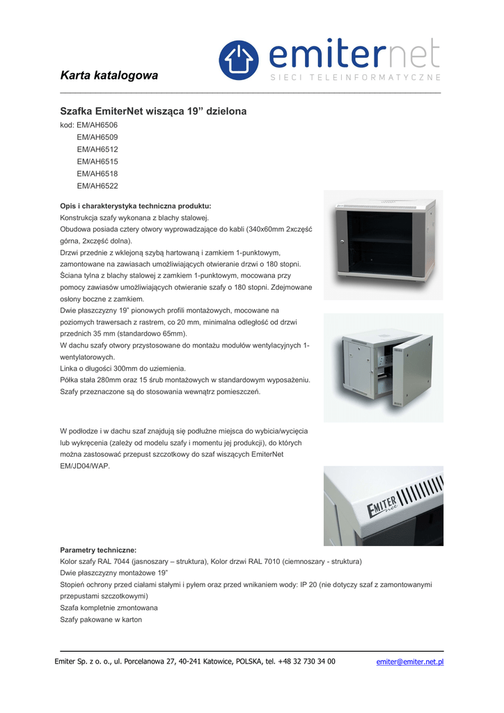 Karta katalogowa ___________________________________________________________________________ Szafka EmiterNet wisząca 19” dzielona kod: EM/AH6506 EM/AH6509 EM/AH6512 EM/AH6515 EM/AH6518 EM/AH6522 Opis i charakterystyka techniczna produktu: Konstrukcja szafy wykonana z blachy stalowej. Obudowa posiada cztery otwory wyprowadzające do kabli (340x60mm 2xczęść górna, 2xczęść dolna). Drzwi przednie z wklejoną szybą hartowaną i zamkiem 1-punktowym, zamontowane na zawiasach umożliwiających otwieranie drzwi o 180 stopni. Ściana tylna z blachy stalowej z zamkiem 1-punktowym, mocowana przy pomocy zawiasów umożliwiających otwieranie szafy o 180 stopni. Zdejmowane osłony boczne z zamkiem. Dwie płaszczyzny 19” pionowych profili montażowych, mocowane na poziomych trawersach z rastrem, co 20 mm, minimalna odległość od drzwi przednich 35 mm (standardowo 65mm). W dachu szafy otwory przystosowane do montażu modułów wentylacyjnych 1wentylatorowych. Linka o długości 300mm do uziemienia. Półka stała 280mm oraz 15 śrub montażowych w standardowym wyposażeniu. Szafy przeznaczone są do stosowania wewnątrz pomieszczeń. W podłodze i w dachu szaf znajdują się podłużne miejsca do wybicia/wycięcia lub wykręcenia (zależy od modelu szafy i momentu jej produkcji), do których można zastosować przepust szczotkowy do szaf wiszących EmiterNet EM/JD04/WAP. Parametry techniczne: Kolor szafy RAL 7044 (jasnoszary – struktura), Kolor drzwi RAL 7010 (ciemnoszary - struktura) Dwie płaszczyzny montażowe 19” Stopień ochrony przed ciałami stałymi i pyłem oraz przed wnikaniem wody: IP 20 (nie dotyczy szaf z zamontowanymi przepustami szczotkowymi) Szafa kompletnie zmontowana Szafy pakowane w karton Emiter Sp. z o. o., ul. Porcelanowa 27, 40-241 Katowice, POLSKA, tel. +48 32 730 34 00 [email protected] Karta katalogowa ___________________________________________________________________________ Produkty kompatybilne: półka stała 19", 1U, o gł. 250 mm., mocowana z przodu RAL 7044 szary, kod: EM/JE06-250 półka stała 19", 1U, o gł. 350 mm., mocowana z przodu RAL 7044 szary, kod: EM/JE06-350 półka do szaf wiszących EmiterNet o gł. 450 i 550 mm, wym. 500X280 mm (szer. X wys.), kod: EM/SH-J018W-280 półka ruchoma 19”, 1U, pod klawiaturę, o gł. 270/295 mm., RAL 7044 szary, kod: EM/JE10 Przepust szczotkowy do szaf wiszących EmiterNet, kod: EM/JD04/WAP Zamek z kluczem do szaf EmiterNet do drzwi bocznych, kod: EM/JC-01 Listwa zasilająca EmiterNet 19" 9 gn.z bolcem, wtyk uni-schuko,kabel 2m, kontrolka LED, kod: EM/LZ19.09F.2S.L Listwa zasilająca EmiterNet 19" 9 gn. z bolcem, wtyk uni-schuko, kabel 2 m, wyłącznik, kod: EM/LZ19.09F.2S.W Oznaczenia: kod nośność szerokość głębokość wysokość U wysokość EM/AH6506 EM/AH6509 EM/AH6512 EM/AH6515 EM/AH6518 EM/AH6522 50 kg 50 kg 50 kg 50 kg 50 kg 50 kg 600 600 600 600 600 600 550 550 550 550 550 550 6 9 12 15 18 22 370 500 635 770 964 1083 masa [kg] 21 25 32 35 38 41 Uwaga: wymiary podane są w milimetrach! Dołożyliśmy wszelkich starań, aby przedstawione informacje były rzetelne i kompletne. Jednak nie ponosimy odpowiedzialności za dokładność i kompletność danych oraz w szczególności nie możemy zagwarantować, że niniejsza specyfikacja nie zawiera błędów lub pomyłek. Informacje zawarte w niniejszej specyfikacji mogą zostać zmienione w każdej chwili bez powiadomienia. Emiter Sp. z o. o., ul. Porcelanowa 27, 40-241 Katowice, POLSKA, tel. +48 32 730 34 00 [email protected]