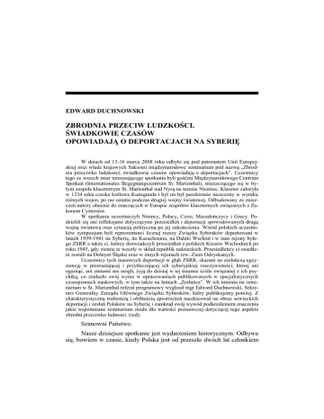 EDWARD DUCHNOWSKI ZBRODNIA PRZECIW LUDZKOŚCI. ŚWIADKOWIE CZASÓW OPOWIADAJĄ O DEPORTACJACH NA SYBERIĘ W dniach od 13-16 marca 2008 roku odbyło się pod patronatem Unii Europejskiej oraz władz krajowych Saksonii międzynarodowe seminarium pod nazwą „Zbrodnia przeciwko ludzkości, świadkowie czasów opowiadają o deportacjach”. Uczestnicy tego ze wszech miar interesującego spotkania byli gośćmi Międzynarodowego Centrum Spotkań (Internationales Begegnungszentrum St. Marienthal), mieszczącego się w byłym zespole klasztornym St. Marienthal nad Nysą na terenie Niemiec. Klasztor założyła w 1234 roku czeska królowa Kunegunda i był on był parokrotnie niszczony w wyniku różnych wojen, po raz ostatni podczas drugiej wojny światowej. Odbudowany ze zniszczeń należy obecnie do znaczących w Europie zespołów klasztornych związanych z Zakonem Cystersów. W spotkaniu uczestniczyli Niemcy, Polacy, Czesi, Macedończycy i Grecy. Podzielili się oni refleksjami dotyczącymi przesiedleń i deportacji spowodowanych drugą wojną światową oraz sytuacją polityczną po jej zakończeniu. Wśród polskich uczestników sympozjum byli reprezentanci licznej rzeszy Związku Sybiraków deportowani w latach 1939-1941 na Syberię, do Kazachstanu, na Daleki Wschód i w inne rejony byłego ZSRR a także ci, którzy doświadczyli przesiedleń z polskich Kresów Wschodnich po roku 1945, gdy ziemie te weszły w skład republik radzieckich. Przesiedleńcy ci osiedleni zostali na Dolnym Śląsku oraz w innych rejonach tzw. Ziem Odzyskanych. Uczestnicy tych masowych deportacji w głąb ZSRR, skazani na zesłańczą egzystencję w przerastającej i przytłaczającej ich syberyjskiej rzeczywistości, której ani ogarnąć, ani zmienić nie mogli, żyją do dzisiaj w tej traumie ściśle związanej z ich psychiką, co znalazło swój wyraz w opracowaniach publikowanych w specjalistycznych czasopismach naukowych, w tym także na łamach „Zesłańca”. W ich imieniu na seminarium w St. Marienthal referat programowy wygłosił mgr Edward Duchnowski, Sekretarz Generalny Zarządu Głównego Związku Sybiraków, który publikujemy poniżej. Z charakterystyczną trafnością i obfitością spostrzeżeń naszkicował on obraz sowieckich deportacji i zesłań Polaków na Syberię i zamknął swój wywód podkreśleniem znaczenia jakie wspomniane seminarium miało dla wartości poznawczej dotyczącej tego aspektu zbrodni przeciwko ludności. (red). Szanowni Państwo. Nasze dzisiejsze spotkanie jest wydarzeniem historycznym. Odbywa się, bowiem w czasie, kiedy Polska jest od przeszło dwóch lat członkiem 72 EDWARD DUCHNOWSKI wielkiej rodziny europejskiej – Unii Europejskiej. Ta organizacja skupiająca blisko pół miliarda mieszkańców Europy jest dowodem, że przezwyciężone zostały podziały wywołane II wojną światową i podziałem kontynentu na dwa przeciwstawne obozy. Dzisiaj, we wspólnej Europie budujemy wspólną przyszłość. Jednakże nie zapominamy o przeszłości! Związek Sybiraków od początku swego powstania wyznawał dewizę; „Pamięć Zmarłym – Żyjącym Pojednanie”. Odnosząc się do tematu naszego spotkania, chciałbym podkreślić, że to właśnie my, polscy Sybiracy jesteśmy pierwszymi ofiarami przymusowych przesiedleń i deportacji, i to nam przynależeć powinno określenie ofiar „zbrodni przeciw ludzkości” w okresie II wojny światowej. A wracając do głównego nurtu naszego spotkania, to pozwólcie państwo, że jako bezpośredni świadek czasów pogardy i cierpienia, podzielę się kilkoma osobistymi refleksami: Po pierwsze. Po zajęciu 17 września 1939 roku ponad połowy Rzeczypospolitej– Stalin i jego służby specjalne powróciły do carskich metod rozprawiania się ze swoimi przeciwnikami. Terror policyjny wzmocniono deportacjami i przesiedleniami, a także narzucaniem Polakom sowieckich wzorów administracyjno-gospodarczych, obcych polskiej kulturze i polskiemu duchowi narodowemu. Na Syberię trafiła przede wszystkim ludność przymusowo przesiedlona z ziem polskich w toku operacji deportacyjnych przeprowadzonych w lutym, kwietniu i czerwcu 1940 roku oraz w maju i czerwcu 1941 roku. W lutym i kwietniu 1940 roku deportacja objęła przede wszystkim polskich osadników wojskowych i cywilnych kolonistów oraz służbę leśną, rodzin urzędników państwowych, urzędników i działaczy samorządowych, kupców i przedstawicieli innych grup. Na Syberii znalazło się ponad 500 tysięcy Polaków. Osiedlono ich głównie w obwodach Omskim, Nowosybirskim, Kazachskim, w Kraju Krasnojarskim i Kraju Ałtajskim. Znaczna część deportowanych znalazła się na Syberii Wschodniej, głównie w okolicach Irkucka. Po latach Związek Sybiraków z tej „nieludzkiej ziemi” – przeniósł prochy „Nieznanego Sybiraka” do Sanktuarium „Grobu Nieznanego Sybiraka” w Białymstoku. W czerwcu 1940 roku władze radzieckie deportowały wojennych uchodźców z zachodnich i centralnych terenów Polski, którzy znaleźli się na Kresach we wrześniu 1939 roku. Deportowano wówczas ponad 220 tysięcy osób. Większość wśród nich stanowili Żydzi, natomiast Polaków było niespełna 100 tysięcy. Najwięcej osiedlono ich w obwodzie Nowosybirskim. Do dnia dzisiejszego stanowią oni i ich potomkowie w Nowosybirsku liczącą się grupę narodowościową, kultywującą tradycje polskie i żydowskie. W wyniku deportacji przeprowadzonych w maju i czerwcu 1941 roku na zesłaniu znalazło się ponad 300 tysięcy mieszkańców obszarów zaanektowanych przez b. ZSRR w latach 1939 – 1940, w tym także kolejna grupa obywateli polskich. Wedle dyrektyw NKWD wszyscy deportowani zostali wraz z rodzinami uznani za element wrogi lub Zbrodnia przeciw ludzkości. Świadkowie czasów opowiadają... 73 niepewny i niepożądany na terenach zajętych przez Armię Czerwoną. „Elementy wrogie” umieszczano w łagrach a pozostałych deportowano w celu reedukacji na „Nieludzką Zie