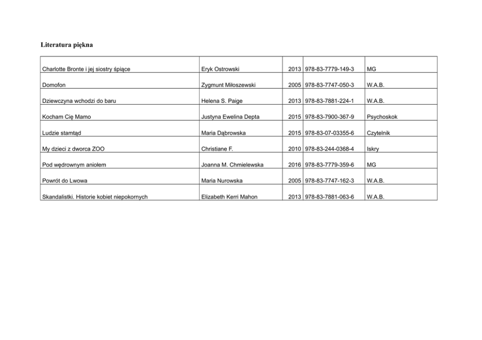 Literatura piękna Charlotte Bronte i jej siostry śpiące Eryk Ostrowski 2013 978-83-7779-149-3 MG Domofon Zygmunt Miłoszewski 2005 978-83-7747-050-3 W.A.B. Dziewczyna wchodzi do baru Helena S. Paige 2013 978-83-7881-224-1 W.A.B. Kocham Cię Mamo Justyna Ewelina Depta 2015 978-83-7900-367-9 Psychoskok Ludzie stamtąd Maria Dąbrowska 2015 978-83-07-03355-6 Czytelnik My dzieci z dworca ZOO Christiane F. 2010 978-83-244-0368-4 Iskry Pod wędrownym aniołem Joanna M. Chmielewska 2016 978-83-7779-359-6 MG Powrót do Lwowa Maria Nurowska 2005 978-83-7747-162-3 W.A.B. Skandalistki. Historie kobiet niepokornych Elizabeth Kerri Mahon 2013 978-83-7881-063-6 W.A.B.