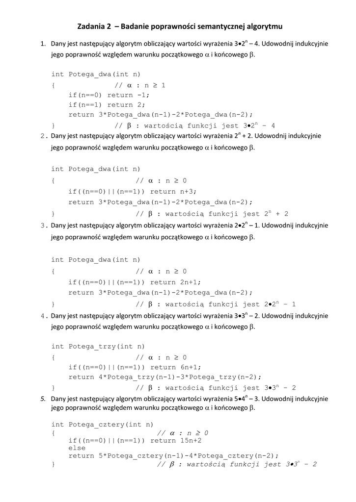 2. Dany jest następujący algorytm obliczający wartości wyrażenia 2n + 2. Udowodnij indukcyjnie