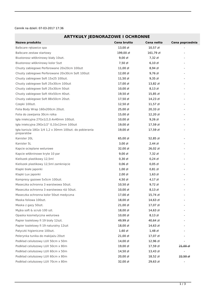 Cennik na dzień: 07-03-2017 17:36 ARTYKUŁY JEDNORAZOWE I OCHRONNE Nazwa produktu Balbcare rękawice spa Balbcare zestaw startowy Biustonosz włókninowy biały 10szt. Biustonosz włókninowy kolor 5szt Cena brutto Cena netto Cena poprzednia 13,00 zł 10,57 zł - 199,00 zł 161,79 zł - 9,00 zł 7,32 zł - 7,50 zł 6,10 zł - Chusty zabiegowe Perforowane 20x20cm 100szt 11,00 zł 8,94 zł - Chusty zabiegowe Perforowane 20x30cm Soft 100szt 12,00 zł 9,76 zł - Chusty zabiegowe Soft 15x25 100szt. 11,50 zł 9,35 zł - Chusty zabiegowe Soft 25x30cm 100szt 17,00 zł 13,82 zł - Chusty zabiegowe Soft 25x30cm 50szt 10,00 zł 8,13 zł - Chusty zabiegowe Soft 44x50cm 40szt. 19,50 zł 15,85 zł - Chusty zabiegowe Soft 88x50cm 20szt. 17,50 zł 14,23 zł - Czepki 100szt. 12,50 zł 11,57 zł - Folia Body Wrap 160x200cm 20szt. 25,00 zł 20,33 zł - Folia do zawijania 30cm rolka 15,00 zł 12,20 zł - Igła iniekcyjna 27Gx1/2,0.4x40mm 100szt. 10,00 zł 9,26 zł - Igła iniekcyjna 29Gx1/2" 0,33x12mm 100szt 19,00 zł 17,59 zł - Igła kaniula 18Gx 1/4 1,2 x 30mm 100szt. do pobierania preparatów 19,00 zł 17,59 zł - Kanister 20L 65,00 zł 52,85 zł - Kanister 5L 3,00 zł 2,44 zł - 32,00 zł 26,02 zł - Kapcie włókninowe kryte 10 par 9,00 zł 7,32 zł - Kieliszek plastikowy 12,5ml 0,30 zł 0,24 zł - Kieliszek plastikowy 12,5ml zamknięcie 0,06 zł 0,05 zł - Klapki białe japonki 1,00 zł 0,81 zł - Klapki Lux japonki 2,00 zł 1,63 zł - Kapcie ocieplane welurowe Kompresy gazowe 5x5cm 100szt. 4,50 zł 4,17 zł - Maseczka ochronna 3 warstwowa 50szt. 10,50 zł 9,72 zł - Maseczka ochronna 3 warstwowa róż 50szt. 10,00 zł 8,13 zł - Maseczka ochronna kolor 50szt medyczna 17,00 zł 15,74 zł - Maska foliowa 100szt. 18,00 zł 14,63 zł - Maska z gazy 50szt. 21,00 zł 17,07 zł - Myjka soft & scrub 100 szt. 18,00 zł 14,63 zł - Opaska kosmetyczna welurowa 10,00 zł 8,13 zł - Papier toaletowy fi 19 biały 12szt. 49,99 zł 40,64 zł - Papier toaletowy fi 19 naturalny 12szt 18,00 zł 14,63 zł - Patyczki higieniczne 100szt. 1,60 zł 1,48 zł - Pelerynka tunika do makijażu 20szt 21,00 zł 17,07 zł - Podkład celulozowy LUX 50cm x 50m 14,00 zł 12,96 zł - Podkład celulozowy LUX 50cm x 80m 19,00 zł 17,59 zł 21,00 zł Podkład celulozowy LUX 60cm x 50m 14,50 zł 13,43 zł - Podkład celulozowy LUX 60cm x 80m 20,00 zł 18,52 zł 22,50 zł Podkład celulozowy LUX 70cm x 80m 32,00 zł 29,63 zł - 1/3 Podkład fizelinowy EKO 50cm x 50m 26,00 zł 21,14 zł - Podkład fizelinowy EKO 60cm x 50m 30,00 zł 24,39 zł - Podkład fizelinowy EKO 70cm x 50m 37,50 zł 30,49 zł - Podkład laminowany 50cm x 50m rolka 37,00 zł 30,08 zł - Podkład laminowany 60cm x 50m rolka 44,00 zł 35,77 zł - Podkład papierowy 1 warstwowy 50cm x 80m 17,00 zł 13,82 zł - Podkład papierowy 1 warstwowy 60cm x 80m 18,00 zł 14,63 zł - Podkład podfoliowany Midi-Med rolka 51cm 30,00 zł 27,78 zł - Podkład podfoliowany weber 51cm x 40szt. MedixPro Weber&weber 30,00 zł 27,78 zł - Podkład włókninowy kwiatek 50cm x 50m 29,00 zł 23,58 zł - Podkład włókninowy kwiatek 60cm x 50m 35,00 zł 28,46 zł - Podkład włókninowy kwiatek 70cm x 50m 40,00 zł 32,52 zł - Pojemniczek plastik zakręcany 12 szt 3cm 12,00 zł 9,76 zł - Pokrowiec na fotel kosmetyczny welurowy 69,00 zł 56,10 zł - Pokrowiec na taboret + oparcie welurowy 25,00 zł 20,33 zł - Pokrowiec na taboret welurowy 13,00 zł 10,57 zł - Prześcieradło laminowane 80x200cm 5szt. 22,00 zł 17,89 zł - Prześcieradło na fotel z gumką 1szt. 4,00 zł 3,25 zł - Prześcieradło włókninowe 80x200cm 5 szt. 10,00 zł 8,13 zł - Płatki kosmetyczne okrągłe 250g ok.620szt. 15,50 zł 14,35 zł - Płatki kosmetyczne okrągłe 80szt. 3,00 zł 2,78 zł - Ręcznik Airland Mini 40x50cm 100szt. 26,00 zł 21,14 zł - Ręcznik Airland Wawe Midi 40x70cm 100szt 37,00 zł 30,08 zł - Ręcznik Cotton Maxi 50x70cm 100szt. 37,00 zł 30,08 zł - Ręcznik Flower maxi 25x42cm/170m(404szt) 55,00 zł 44,72 zł - Ręcznik Len airland mini 40x50cm 100szt. 26,00 zł 21,14 zł - Ręcznik Wave Mini 40x50cm 50szt. 13,00 zł 10,57 zł - Ręcznik włókninowy RóżMidi 40x70cm100szt różowy 33,90 zł 27,56 zł - Ręcznik ZZ biały składany 4000szt 59,00 zł 47,97 zł - Ręcznik ZZ naturalny składany 4000szt. 38,00 zł 30,89 zł - Rękawice ocieplane welurowe 29,00 zł 23,58 zł - 2,50 zł 2,03 zł - Rękawiczki nitryl bezpudrowe L 100szt. Medi Care 16,00 zł 14,81 zł - Rękawiczki nitryl bezpudrowe M 100szt. MediCare 16,00 zł 14,81 zł - Rękawiczki nitryl bezpudrowe S 100szt. MediCare 16,00 zł 14,81 zł - Rękawiczki nitryl bezpudrowe XS 100szt. Medi Care 16,00 zł 14,81 zł - Rękawiczki nitryl bezpudrowe XS 150szt. 22,00 zł 20,37 zł - Rękawiczki nitryl Czarne M 100szt. bezpudrowe EasyCare 19,90 zł 18,43 zł - Rękawiczki nitryl Czarne S 100szt. bezpudrowe EasyCare 19,90 zł 18,43 zł - Rękawiczki nitryl Czarne S Black Panter 100szt 19,90 zł 18,43 zł - Rękawiczki nitryl LAUREL L 200szt. bezpudrowe 44,00 zł 40,74 zł - Rękawiczki nitryl Pink Rose L 100szt. alantolina,kolagen,silikon 27,00 zł 25,00 zł - Rękawiczki nitryl Pink Rose M 100szt. alantolina,kolagen,silikon 27,00 zł 25,00 zł - Rękawiczki nitryl Pink Rose S 100szt. alantolina,kolagen,silikon 27,00 zł 25,00 zł - Rękawiczki nitryl Pink Rose XS 100szt. alantolina,kolagen,silikon 27,00 zł 25,00 zł - Rękawiczki nitryl różowe Doman S 100szt. 16,00 zł 14,81 zł - Rękawiczki foliowe 100szt. 2/3 Rękawiczki nitryl różowe S 100szt. bezpudrowe EasyCare 19,90 zł 18,43 zł - Rękawiczki nitryl różowe XS 100szt. bezpudrowe EasyCare 19,90 zł 18,43 zł - Rękawiczki nitryl VIOLET PF M 100szt. bezpudrowe 16,00 zł 14,81 zł - Rękawiczki nitryl VIOLET PF S 100szt. bezpudrowe 16,00 zł 14,81 zł - Rękawiczki nitrylowe różowe M 100szt. bezpudrowe EasyCare 19,90 zł 18,43 zł - Rogal na zagłówek do fotela 50szt. 17,50 zł 14,23 zł - Separator do pedicure 1 para 0,35 zł 0,28 zł - Separator do pedicure LUX 1 para 1,20 