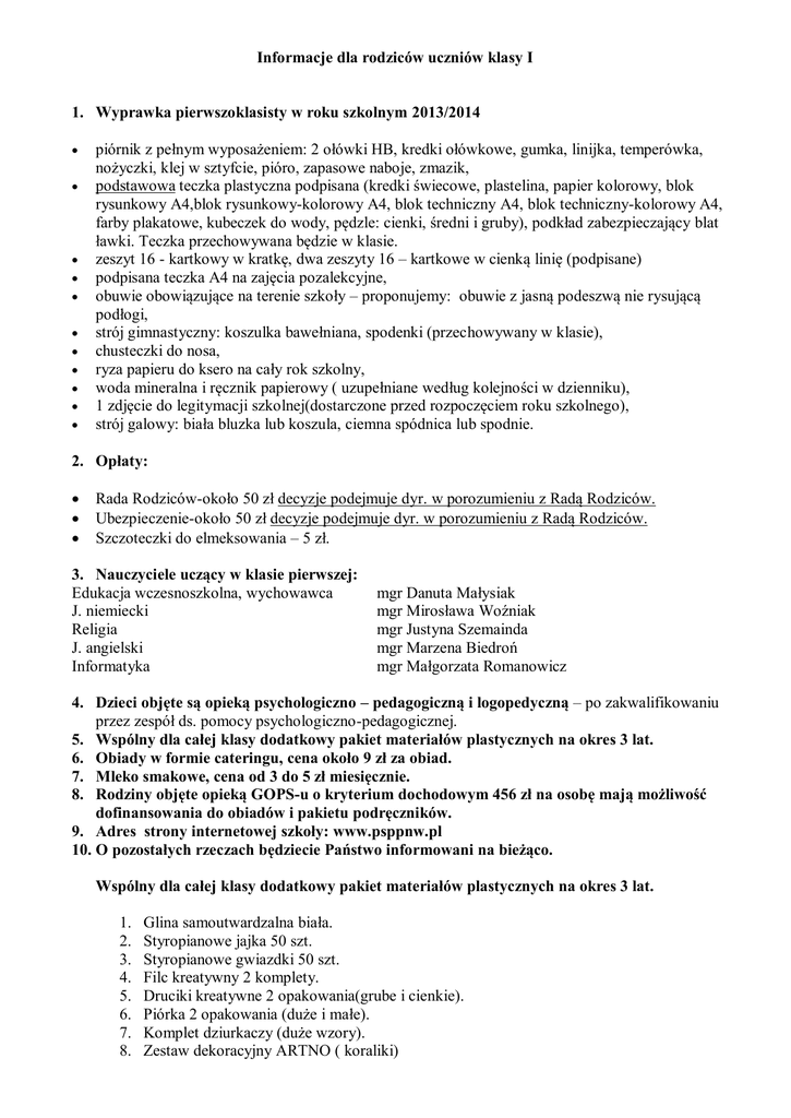 Informacje dla rodziców uczniów klasy I 1. Wyprawka pierwszoklasisty w roku szkolnym 2013/2014 piórnik z pełnym wyposażeniem: 2 ołówki HB, kredki ołówkowe, gumka, linijka, temperówka, nożyczki, klej w sztyfcie, pióro, zapasowe naboje, zmazik, podstawowa teczka plastyczna podpisana (kredki świecowe, plastelina, papier kolorowy, blok rysunkowy A4,blok rysunkowy-kolorowy A4, blok techniczny A4, blok techniczny-kolorowy A4, farby plakatowe, kubeczek do wody, pędzle: cienki, średni i gruby), podkład zabezpieczający blat ławki. Teczka przechowywana będzie w klasie. zeszyt 16 - kartkowy w kratkę, dwa zeszyty 16 – kartkowe w cienką linię (podpisane) podpisana teczka A4 na zajęcia pozalekcyjne, obuwie obowiązujące na terenie szkoły – proponujemy: obuwie z jasną podeszwą nie rysującą podłogi, strój gimnastyczny: koszulka bawełniana, spodenki (przechowywany w klasie), chusteczki do nosa, ryza papieru do ksero na cały rok szkolny, woda mineralna i ręcznik papierowy ( uzupełniane według kolejności w dzienniku), 1 zdjęcie do legitymacji szkolnej(dostarczone przed rozpoczęciem roku szkolnego), strój galowy: biała bluzka lub koszula, ciemna spódnica lub spodnie. 2. Opłaty: Rada Rodziców-około 50 zł decyzje podejmuje dyr. w porozumieniu z Radą Rodziców. Ubezpieczenie-około 50 zł decyzje podejmuje dyr. w porozumieniu z Radą Rodziców. Szczoteczki do elmeksowania – 5 zł. 3. Nauczyciele uczący w klasie pierwszej: Edukacja wczesnoszkolna, wychowawca J. niemiecki Religia J. angielski Informatyka mgr Danuta Małysiak mgr Mirosława Woźniak mgr Justyna Szemainda mgr Marzena Biedroń mgr Małgorzata Romanowicz 4. Dzieci objęte są opieką psychologiczno – pedagogiczną i logopedyczną – po zakwalifikowaniu przez zespół ds. pomocy psychologiczno-pedagogicznej. 5. Wspólny dla całej klasy dodatkowy pakiet materiałów plastycznych na okres 3 lat. 6. Obiady w formie cateringu, cena około 9 zł za obiad. 7. Mleko smakowe, cena od 3 do 5 zł miesięcznie. 8. Rodziny objęte opieką GOPS-u o kryterium dochodowym 456 zł na osobę mają możliwość dofinansowania do obiadów i pakietu podręczników. 9. Adres strony internetowej szkoły: www.psppnw.pl 10. O pozostałych rzeczach będziecie Państwo informowani na bieżąco. Wspólny dla całej klasy dodatkowy pakiet materiałów plastycznych na okres 3 lat. 1. 2. 3. 4. 5. 6. 7. 8. Glina samoutwardzalna biała. Styropianowe jajka 50 szt. Styropianowe gwiazdki 50 szt. Filc kreatywny 2 komplety. Druciki kreatywne 2 opakowania(grube i cienkie). Piórka 2 opakowania (duże i małe). Komplet dziurkaczy (duże wzory). Zestaw dekoracyjny ARTNO ( koraliki) 9. Fartuszki na zajęcia. 10. Play Foam (duża paka) 11. Brystol mix A2 (2komplety) 12. Kartony 4 pory roku. 13. Flizelina 3 opakowania. 14. Tektura falista B4. 15. Krepina flaga. 16. Paski do przeplatania. 17. Farba zdrapka 4 szt. 18. Farby do szkła. 19. Stemple alfabet. 20. Pompony 2 opakowania 9po 96 szt.). 21. Pojemnik na wykazane materiały.