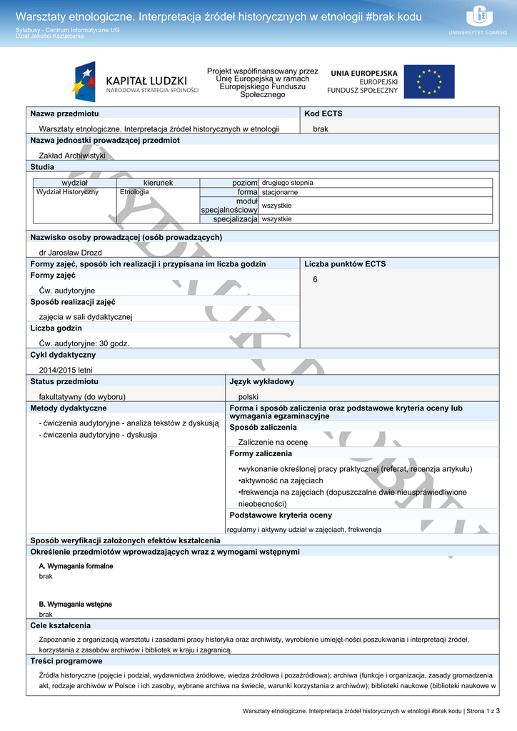 Warsztaty etnologiczne. Interpretacja źródeł historycznych w etnologii #brak kodu Sylabusy - Centrum Informatyczne UG Dział Jakości Kształcenia Projekt współfinansowany przez Unię Europejską w ramach Europejskiego Funduszu Społecznego Nazwa przedmiotu Kod ECTS Warsztaty etnologiczne. Interpretacja źródeł historycznych w etnologii Nazwa jednostki prowadzącej przedmiot brak W Zakład Archiwistyki Studia wydział Wydział Historyczny kierunek Etnologia Y poziom forma moduł specjalnościowy specjalizacja drugiego stopnia stacjonarne wszystkie wszystkie D Nazwisko osoby prowadzącej (osób prowadzących) Ćw. audytoryjne Sposób realizacji zajęć zajęcia w sali dydaktycznej Liczba godzin fakultatywny (do wyboru) Metody dydaktyczne polski Forma i sposób zaliczenia oraz podstawowe kryteria oceny lub wymagania egzaminacyjne Sposób zaliczenia Zaliczenie na ocenę Formy zaliczenia Ó - ćwiczenia audytoryjne - analiza tekstów z dyskusją - ćwiczenia audytoryjne - dyskusja Język wykładowy PR 2014/2015 letni Status przedmiotu 6 K Ćw. audytoryjne: 30 godz. Cykl dydaktyczny Liczba punktów ECTS RU dr Jarosław Drozd Formy zajęć, sposób ich realizacji i przypisana im liczba godzin Formy zajęć BN •wykonanie określonej pracy praktycznej (referat, recenzja artykułu) •aktywność na zajęciach •frekwencja na zajęciach (dopuszczalne dwie nieusprawiedliwione nieobecności) Podstawowe kryteria oceny regularny i aktywny udział w zajęciach, frekwencja A. Wymagania formalne brak Y Sposób weryfikacji założonych efektów kształcenia Określenie przedmiotów wprowadzających wraz z wymogami wstępnymi B. Wymagania wstępne brak Cele kształcenia Zapoznanie z organizacją warsztatu i zasadami pracy historyka oraz archiwisty, wyrobienie umiejętności poszukiwania i interpretacji źródeł, korzystania z zasobów archiwów i bibliotek w kraju i zagranicą. Treści programowe Źródła historyczne (pojęcie i podział, wydawnictwa źródłowe, wiedza źródłowa i pozaźródłowa); archiwa (funkcje i organizacja, zasady gromadzenia akt, rodzaje archiwów w Polsce i ich zasoby, wybrane archiwa na świecie, warunki korzystania z archiwów); biblioteki naukowe (biblioteki naukowe w Warsztaty etnologiczne. Interpretacja źródeł historycznych w etnologii #brak kodu | Strona 1 z 3 Warsztaty etnologiczne. Interpretacja źródeł historycznych w etnologii #brak kodu Sylabusy - Centrum Informatyczne UG Dział Jakości Kształcenia Polsce i na świecie, korzystanie z zasobów bibliotek, bazy danych, wypożyczalnie międzybiblioteczne); profilaktyka zbiorów archiwalnych. Wykaz literatury K_W01 Ma pogłębioną wiedzę o specyfice przedmiotowej i metodologicznej etnologii i antropologii kulturowej, którą jest w stanie rozwijać i twórczo stosować w działalności profesjonalnej K_W03 Ma uporządkowaną, pogłębioną wiedzę, obejmującą terminologię, teorię i metodologię z zakresu etnologii i antropologii kulturowej K_W08 Zna podstawowe metody badawcze i narzędzia warsztatu etnologa K_W09 Zna i rozumie zaawansowane metody analizy, interpretacji, wartościowania i problematyzowania wytworów kulturowych powstałych w różnych kręgach kulturowych Umiejętności W Y D RU K H2A_W01 Ma pogłębioną wiedzę o specyfice przedmiotowej i metodologicznej nauk humanistycznych, którą jest w stanie rozwijać i twórczo stosować w działalności profesjonalnej H2_W03 Ma uporządkowaną, pogłębioną wiedzę, obejmującą terminologię, teorię i metodologię z zakresu dziedzin nauki i dyscyplin naukowych, właściwych dla studiowanego kierunku studiów H2A_W07 Zna i rozumie zaawansowane metody analizy, interpretacji, wartościowania i problematyzowania różnych wytworów kultury właściwe dla tradycji, teorii lub szkół badawczych w zakresie dziedzin nauki i dyscyplin naukowych, właściwych dla studiowanego kierunku studiów. H2A_U02 Posiada pogłębione umiejętności badawcze, obejmujące analizę prac innych autorów, syntezę różnych idei i poglądów, dobór metod i konstruowanie narzędzi badawczych, opracowanie i prezentację wyników, pozwalające na oryginalne rozwiązywanie złożonych problemów w zakresie dziedzin nauki i dyscyplin naukowych, właściwych dla studiowanego kierunku studiów H2A_U04 Posiada umiejętność integrowania wiedzy z różnych dyscyplin w zakresie nauk humanistycznych oraz jej zastosowania w nietypowych sytuacjach profesjonalnych H2A_U05 Potrafi przeprowadzić krytyczną analizę i interpretację różnych rodzajów wytworów kultury właściwych dla studiowanej dyscypliny w zakresie nauk humanistycznych stosując oryginalne podejścia, uwzględniając nowe osiągnięcia humanistyki w celu określenia ich znaczeń, oddziaływania społecznego, miejsca w procesie historycznokulturowym H2A_U06 Posiada umiejętność merytorycznego argumentowania z wykorzystaniem własnych poglądów oraz poglądów innych autorów, formułowania wniosków oraz tworzenia syntetycznych podsumowań H2A_U07 Posiada umiejętność formułowania opinii krytycznych o wytworach kultury na podstawie wiedzy naukowej i doświadczenia oraz umiejętność prezentacji opracowań krytycznych w różnych formach H2A_U08 Potrafi porozumiewać się z wykorzystaniem różnych kanałów i technik komunikacyjnych ze Ó Wiedza PR Efekty kształcenia (obszarowe i kierunkowe) BN B. Literatura uzupełniająca Ihnatowicz I., Biernat A., Vademecum do badań nad historią XIX i XX wieku. Warszawa 2003 Metodyka pracy archiwalnej, red. S. Nawrocki, S. Sierpowski, Poznań 1995 Pańków S., Archiwa, Warszawa 1969 Ratajewski J., Biblioteki naukowe i fachowe oraz ośrodki informacji naukowotechnicznej, Katowice 1982 Topolski J., Wprowadzenie do historii, Warszawa 1998 Robótka H, Wprowadzenie do archiwistyki, Toruń 2003 Swieżawski A., Warsztat naukowy historyka. Wstęp do badań historycznych, Częstochowa 2001 Y A. Literatura wymagana do ostatecznego zaliczenia zajęć (zdania egzaminu)