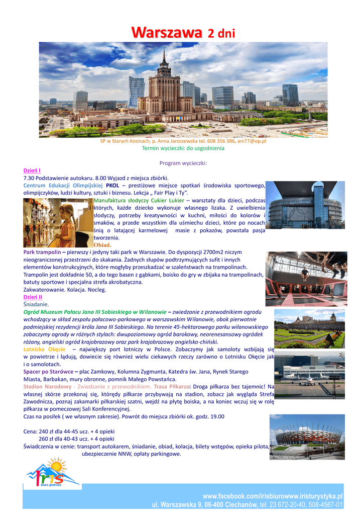 Warszawa 2 dni SP w Starych Kosinach, p. Anna Jaroszewska tel. 608 356 386, [email protected] Termin wycieczki: do uzgodnienia Program wycieczki: Dzień I 7.30 Podstawienie autokaru. 8.00 Wyjazd z miejsca zbiórki. Centrum Edukacji Olimpijskiej PKOL – prestiżowe miejsce spotkań środowiska sportowego, olimpijczyków, ludzi kultury, sztuki i biznesu. Lekcja „ Fair Play i Ty”. Manufaktura słodyczy Cukier Lukier – warsztaty dla dzieci, podczas których, każde dziecko wykonuje własnego lizaka. Z uwielbienia słodyczy, potrzeby kreatywności w kuchni, miłości do kolorów i smaków, a przede wszystkim dla uśmiechu dzieci, które po nocach śnią o latającej karmelowej masie z pokazów, powstała pasja tworzenia. Obiad. Park trampolin – pierwszy i jedyny taki park w Warszawie. Do dyspozycji 2700m2 niczym nieograniczonej przestrzeni do skakania. Żadnych słupów podtrzymujących sufit i innych elementów konstrukcyjnych, które mogłyby przeszkadzać w szaleństwach na trampolinach. Trampolin jest dokładnie 50, a do tego basen z gąbkami, boisko do gry w zbijaka na trampolinach, batuty sportowe i specjalna strefa akrobatyczna. Zakwaterowanie. Kolacja. Nocleg. Dzień II Śniadanie. Ogród Muzeum Pałacu Jana III Sobieskiego w Wilanowie – zwiedzanie z przewodnikiem ogrodu wchodzący w skład zespołu pałacowo-parkowego w warszawskim Wilanowie, obok pierwotnie podmiejskiej rezydencji króla Jana III Sobieskiego. Na terenie 45-hektarowego parku wilanowskiego zobaczymy ogrody w różnych stylach: dwupoziomowy ogród barokowy, neorenesansowy ogródek różany, angielski ogród krajobrazowy oraz park krajobrazowy angielsko-chiński. Lotnisko Okęcie – największy port lotniczy w Polsce. Zobaczymy jak samoloty wzbijają się w powietrze i lądują, dowiecie się również wielu ciekawych rzeczy zarówno o Lotnisku Okęcie jak i o samolotach. Spacer po Starówce – plac Zamkowy, Kolumna Zygmunta, Katedra św. Jana, Rynek Starego Miasta, Barbakan, mury obronne, pomnik Małego Powstańca. Stadion Narodowy - Zwiedzanie z przewodnikiem. Trasa Piłkarza: Droga piłkarza bez tajemnic! Na własnej skórze przekonaj się, którędy piłkarze przybywają na stadion, zobacz jak wygląda Strefa Zawodnicza, poznaj zakamarki piłkarskiej szatni, wejdź na płytę boiska, a na koniec wczuj się w rolę piłkarza w pomeczowej Sali Konferencyjnej. Czas na posiłek ( we własnym zakresie). Powrót do miejsca zbiórki ok. godz. 19.00 Cena: 240 zł dla 44-45 ucz. + 4 opieki 260 zł dla 40-43 ucz. + 4 opieki Świadczenia w cenie: transport autokarem, śniadanie, obiad, kolacja, bilety wstępów, opieka pilota, ubezpieczenie NNW, opłaty parkingowe. www.facebook.com/irisbiurowww.iristurystyka.pl ul. Warszawska 9, 06-400 Ciechanów, tel. 23 672-20-40, 508-4567-01