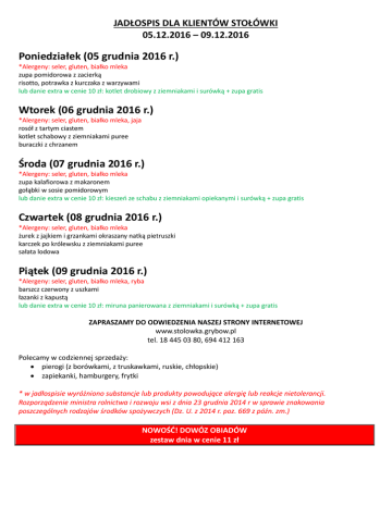 JADŁOSPIS DLA KLIENTÓW STOŁÓWKI 05.12.2016 – 09.12.2016 Poniedziałek (05 grudnia 2016 r.) *Alergeny: seler, gluten, białko mleka zupa pomidorowa z zacierką risotto, potrawka z kurczaka z warzywami lub danie extra w cenie 10 zł: kotlet drobiowy z ziemniakami i surówką + zupa gratis Wtorek (06 grudnia 2016 r.) *Alergeny: seler, gluten, białko mleka, jaja rosół z tartym ciastem kotlet schabowy z ziemniakami puree buraczki z chrzanem Środa (07 grudnia 2016 r.) *Alergeny: seler, gluten, białko mleka zupa kalafiorowa z makaronem gołąbki w sosie pomidorowym lub danie extra w cenie 10 zł: kieszeń ze schabu z ziemniakami opiekanymi i surówką + zupa gratis Czwartek (08 grudnia 2016 r.) *Alergeny: seler, gluten, białko mleka żurek z jajkiem i grzankami okraszany natką pietruszki karczek po królewsku z ziemniakami puree sałata lodowa Piątek (09 grudnia 2016 r.) *Alergeny: seler, gluten, białko mleka, ryba barszcz czerwony z uszkami łazanki z kapustą lub danie extra w cenie 10 zł: miruna panierowana z ziemniakami i surówką + zupa gratis ZAPRASZAMY DO ODWIEDZENIA NASZEJ STRONY INTERNETOWEJ www.stolowka.grybow.pl tel. 18 445 03 80, 694 412 163 Polecamy w codziennej sprzedaży: • pierogi (z borówkami, z truskawkami, ruskie, chłopskie) • zapiekanki, hamburgery, frytki * w jadłospisie wyróżniono substancje lub produkty powodujące alergię lub reakcje nietolerancji. Rozporządzenie ministra rolnictwa i rozwoju wsi z dnia 23 grudnia 2014 r w sprawie znakowania poszczególnych rodzajów środków spożywczych (Dz. U. z 2014 r. poz. 669 z późn. zm.) NOWOŚĆ! DOWÓZ OBIADÓW zestaw dnia w cenie 11 zł