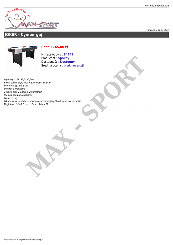 Informacje o produkcie Utworzono 07-03-2017 JOKER - Cymbergaj M AX -S PO Wymiary : 168x91,5x80,5cm Boki : 12mm płyta MDF o szerokości 14,5cm Pole gry : 151x78,5cm Punktacja manualna 2 krążki oraz 2 odbijaki w komplecie Stópki z regulacją poziomu Waga : 31kg Wbudowany wentylator powodujący płynniejszy ślizg krążka jak po lodzie Nogi Nogi : 9,5x9,5 cm z 15mm płyty MDF R Nr katalogowy : 84749 Producent : Spokey Dostępność : Dostępny Średnia ocena : brak recenzji T Cena : 745,00 zł Wygenerowano w programie www.estore.sklep.pl