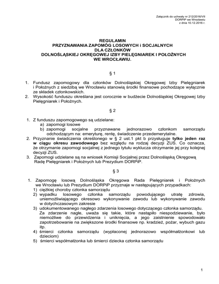 Załącznik do uchwały nr 212/2016/VII DORPiP we Wrocławiu z dnia 10.12.2016 r. REGULAMIN PRZYZNAWANIA ZAPOMÓG LOSOWYCH i SOCJALNYCH DLA CZŁONKÓW DOLNOŚLĄSKIEJ OKRĘGOWEJ IZBY PIELĘGNIAREK I POŁOŻNYCH WE WROCŁAWIU. §1 1. Fundusz zapomogowy dla członków Dolnośląskiej Okręgowej Izby Pielęgniarek i Położnych z siedzibą we Wrocławiu stanowią środki finansowe pochodzące wyłącznie ze składek członkowskich. 2. Wysokość funduszu określana jest corocznie w budżecie Dolnośląskiej Okręgowej Izby Pielęgniarek i Położnych. §2 1. Z funduszu zapomogowego są udzielane: a) zapomogi losowe b) zapomogi socjalne przyznawane jednorazowo członkom samorządu odchodzącym na: emeryturę, rentę, świadczenie przedemerytalne. 2. Przyznanie świadczenia określonego w § 2 ust.1 pkt b przysługuje tylko jeden raz w ciągu okresu zawodowego bez względu na rodzaj decyzji ZUS. Co oznacza, że otrzymanie zapomogi socjalnej z jednego tytułu wyklucza otrzymanie jej przy kolejnej decyzji ZUS. 3. Zapomogi udzielane są na wniosek Komisji Socjalnej przez Dolnośląską Okręgową Radę Pielęgniarek i Położnych lub Prezydium DORPiP. §3 1. Zapomogę losową Dolnośląska Okręgowa Rada Pielęgniarek i Położnych we Wrocławiu lub Prezydium DORPiP przyznaje w następujących przypadkach: 1) ciężkiej choroby członka samorządu 2) wypadku losowego członka samorządu powodującego utratę zdrowia, uniemożliwiającego okresowo wykonywanie zawodu lub wykonywanie zawodu w dotychczasowym zakresie 3) udokumentowanego nagłego zdarzenia losowego dotyczącego członka samorządu. Za zdarzenie nagłe, uważa się takie, które nastąpiło niespodziewanie, było niemożliwe do przewidzenia i uniknięcia, a jego zaistnienie spowodowało zapotrzebowanie na zwiększone środki finansowe np. kradzież, pożar, wybuch gazu itp. 4) śmierci członka samorządu (wypłaconej jednorazowo współmałżonkowi lub dzieciom) 5) śmierci współmałżonka lub śmierci dziecka członka samorządu 1 2 Zapomoga dla danego członka DOIPiP może być przyznana jeden raz w roku kalendarzowym. 3. W przypadku śmierci współmałżonka lub śmierci dziecka członka samorządu zapomoga może być przyznana ponownie w tym samym roku kalendarzowym. 4. Wniosek składa się w ciągu 12 miesięcy od momentu wystąpienia zdarzenia losowego. §4 1. Osobami uprawnionymi do ubiegania się o zapomogę losową są: 1) członkowie DOIPiP, którzy nieprzerwanie opłacają składki członkowskie, co najmniej przez okres dwóch lat poprzedzających złożenie wniosku, 2) członkowie DOIPiP zwolnieni z płacenia składek członkowskich tj.: - osoby bezrobotne, które są zarejestrowane w urzędzie pracy (pod warunkiem przedłożenia zaświadczenia z urzędu pracy) - osoby przebywające na urlopach macierzyńskim / tacierzyńskim, wychowawczym lub rodzicielskim (pod warunkiem przedłożenia stosownego zaświadczenia) - pobierające świadczenie rehabilitacyjne, lub pielęgnacyjne lub zasiłek z pomocy społecznej pod warunkiem przebywania na wyżej wymienionych świadczeniach przez okres nie dłuższy niż dwa lata przed złożeniem wniosku o zapomogę i regularnie opłacający składkę na rzecz DOIPiP przez co najmniej dwa lata przed uzyskaniem wyżej wymienionych świadczeń (pod warunkiem przedłożenia stosownego zaświadczenia) - osoby niepracujące , które posiadają status emeryta lub rencisty, lub pobierające świadczenie przedemerytalne – przedkładają decyzję o przyznaniu świadczenia, oraz zaświadczenie o opłacaniu składki na rzecz DOIPiP. *jeżeli świadczenie zostało przyznane przed 01 lutego 2016 r. to wnioskodawca dołącza opłacanie składek na rzecz DOIPiP do 01 stycznia 2016 r. 2. Zapomogi przyznawane są na wniosek: 1) członka samorządu, 2) pełnomocnego przedstawiciela DORPiP w zakładzie pracy członka samorządu, którego dotyczy wniosek. 3) członka rodziny w przypadkach o których mowa w §3 ust.1 pkt.4. 3. W przypadkach szczególnych, ze względu na czas i wyjątkową sytuację życiową wnioskodawcy, oraz wyjątkowych sytuacji nie ujętych w regulaminie, zapomoga może być rozpatrzona przez DORPiP lub Prezydium DORPiP. 4 Wzór wniosku stanowi załącznik nr 2 do niniejszego regulaminu, który jest do pobrania ze strony internetowej DOIPiP we Wrocławiu lub w biurze Izby. 5. Do wniosku należy dołączyć: 1) w przypadku osób bezrobotnych zaświadczenie z rejonowego urzędu pracy 2) renciści/emeryci kserokopię dokumentu potwierdzającego przyznania emerytury/ renty oraz czasu przebywania na danym świadczeniu 3) przebywający na urlopie wychowawczym, zaświadczenie z zakładu pracy potwierdzające datę rozpoczęcia i planowanego zakończenia urlopu , 4) zaświadczenie o okresie przebywania na świadczeniu rehabilitacyjnym , 2 5) zaświadczenie o płaceniu składek na rzecz Izby potwierdzone przez zakład pracy lub kserokopię dowodu wpłaty w przypadku indywidualnego opłacania składek członkowskich załącznik nr 6, 6) w przypadku osób zwolnionych z obowiązku opłacania składki członkowskiej wnioskujący dołącza dokumenty potwierdzające uprawnienie zwalniające z opłacania składek 7) kserokopie dokumentów potwierdzających zaistnienie zdarzenia losowego np. karty informacyjne leczenia szpitalnego, potwierdzenie faktu kradzieży , protokół wyceny strat , itp. 8) Aktualne dokumenty (do 6 miesięcy od daty złożenia wniosku) zaświadczenie o stanie zdrowia, karty informacyjne z leczenia szpitalnego, itp. 5. W przypadku złożenia wniosku niespełniającego wymagań, niedokładnie wypełnionego, nieczytelnego, Komisja Socjalna wezwie jednorazowo wnioskodawcę do jego uzupełnienia lub poprawienia w terminie 30 dni od daty doręczenia pisma, pod rygorem pozostawienia wniosku bez rozpatrzenia. 6. Rozpatrywane będą jedynie wnioski złożone na oryginalnym druku pobranym ze strony internetowej DOIPiP lub w biurze Izby. Wniosek należy wypełnić wg danych zawartych w do