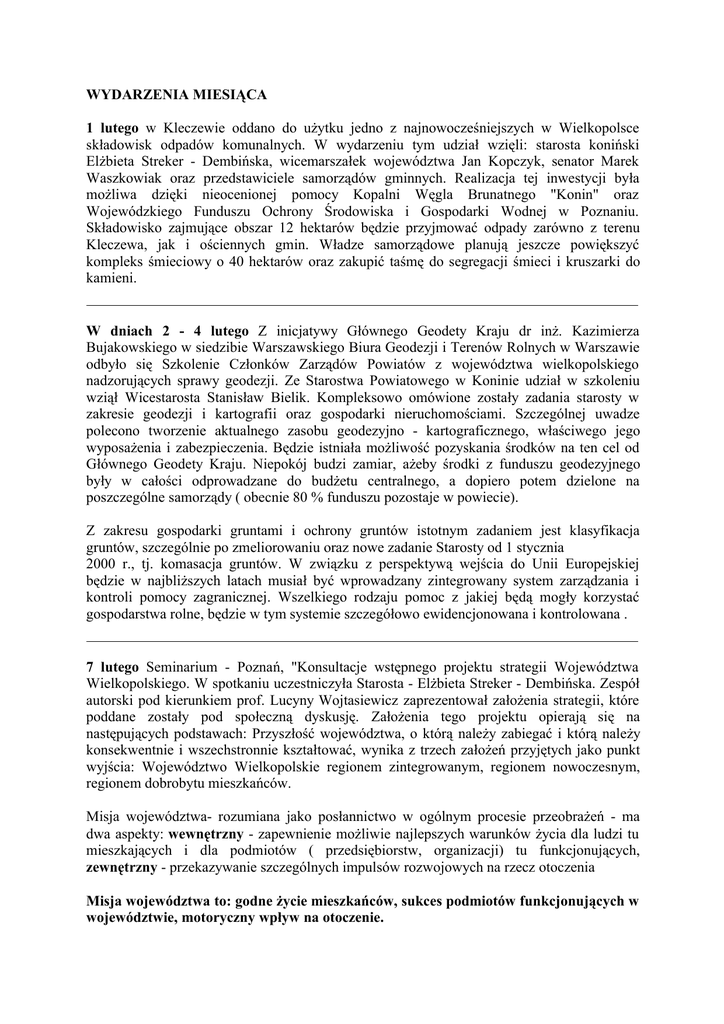 WYDARZENIA MIESIĄCA 1 lutego w Kleczewie oddano do użytku jedno z najnowocześniejszych w Wielkopolsce składowisk odpadów komunalnych. W wydarzeniu tym udział wzięli: starosta koniński Elżbieta Streker - Dembińska, wicemarszałek województwa Jan Kopczyk, senator Marek Waszkowiak oraz przedstawiciele samorządów gminnych. Realizacja tej inwestycji była możliwa dzięki nieocenionej pomocy Kopalni Węgla Brunatnego "Konin" oraz Wojewódzkiego Funduszu Ochrony Środowiska i Gospodarki Wodnej w Poznaniu. Składowisko zajmujące obszar 12 hektarów będzie przyjmować odpady zarówno z terenu Kleczewa, jak i ościennych gmin. Władze samorządowe planują jeszcze powiększyć kompleks śmieciowy o 40 hektarów oraz zakupić taśmę do segregacji śmieci i kruszarki do kamieni. W dniach 2 - 4 lutego Z inicjatywy Głównego Geodety Kraju dr inż. Kazimierza Bujakowskiego w siedzibie Warszawskiego Biura Geodezji i Terenów Rolnych w Warszawie odbyło się Szkolenie Członków Zarządów Powiatów z województwa wielkopolskiego nadzorujących sprawy geodezji. Ze Starostwa Powiatowego w Koninie udział w szkoleniu wziął Wicestarosta Stanisław Bielik. Kompleksowo omówione zostały zadania starosty w zakresie geodezji i kartografii oraz gospodarki nieruchomościami. Szczególnej uwadze polecono tworzenie aktualnego zasobu geodezyjno - kartograficznego, właściwego jego wyposażenia i zabezpieczenia. Będzie istniała możliwość pozyskania środków na ten cel od Głównego Geodety Kraju. Niepokój budzi zamiar, ażeby środki z funduszu geodezyjnego były w całości odprowadzane do budżetu centralnego, a dopiero potem dzielone na poszczególne samorządy ( obecnie 80 % funduszu pozostaje w powiecie). Z zakresu gospodarki gruntami i ochrony gruntów istotnym zadaniem jest klasyfikacja gruntów, szczególnie po zmeliorowaniu oraz nowe zadanie Starosty od 1 stycznia 2000 r., tj. komasacja gruntów. W związku z perspektywą wejścia do Unii Europejskiej będzie w najbliższych latach musiał być wprowadzany zintegrowany system zarządzania i kontroli pomocy zagranicznej. Wszelkiego rodzaju pomoc z jakiej będą mogły korzystać gospodarstwa rolne, będzie w tym systemie szczegółowo ewidencjonowana i kontrolowana . 7 lutego Seminarium - Poznań, "Konsultacje wstępnego projektu strategii Województwa Wielkopolskiego. W spotkaniu uczestniczyła Starosta - Elżbieta Streker - Dembińska. Zespół autorski pod kierunkiem prof. Lucyny Wojtasiewicz zaprezentował założenia strategii, które poddane zostały pod społeczną dyskusję. Założenia tego projektu opierają się na następujących podstawach: Przyszłość województwa, o którą należy zabiegać i którą należy konsekwentnie i wszechstronnie kształtować, wynika z trzech założeń przyjętych jako punkt wyjścia: Województwo Wielkopolskie regionem zintegrowanym, regionem nowoczesnym, regionem dobrobytu mieszkańców. Misja województwa- rozumiana jako posłannictwo w ogólnym procesie przeobrażeń - ma dwa aspekty: wewnętrzny - zapewnienie możliwie najlepszych warunków życia dla ludzi tu mieszkających i dla podmiotów ( przedsiębiorstw, organizacji) tu funkcjonujących, zewnętrzny - przekazywanie szczególnych impulsów rozwojowych na rzecz otoczenia Misja województwa to: godne życie mieszkańców, sukces podmiotów funkcjonujących w województwie, motoryczny wpływ na otoczenie. Do strategicznych - generalnych celów rozwoju zaliczono: - Zapewnienie mieszkańcom możliwie najlepszego poziomu życia, - Osiągnięcie możliwie najwyższego poziomu gospodarki, - Wzrost wewnętrznej integracji i istotna poprawa jakości przestrzeni, - Dostosowanie potencjału, struktury i organizacji województwa do wyzwań XXI w. I wymagań jednoczącej się Europy. Zaproponowano dwa zasadnicze kierunki rozwoju województwa: - Zachowanie dotychczasowych funkcji wiodących, charakterystycznych dla Wielkopolski i nadających jej znaczącą rolę w gospodarce kraju i kontaktach międzynarodowych, ale przy zdecydowanej ich modernizacji. - Tworzenie nowych ogniw rozwoju w formie przedsięwzięć innowacyjnych ( stanowiących wyznacznik postępu gospodarki ) 8 lutego w siedzibie Starostwa Powiatowego w Koninie odbyło się spotkanie, na którym 20 uczniów z byłego województwa konińskiego otrzymało stypendia ufundowane przez marszałka województwa wielkopolskiego, starostę konińskiego i burmistrza miasta i gminy Kleczew. Stypendia przyznano uczniom, którzy będąc w trudnej sytuacji materialnej ( średni dochód w rodzinie nie przekracza 350 złotych brutto ) dzięki własnym zdolnościom i pracowitości osiągnęli dobre wyniki w nauce. Stypendium ufundowane przez starostę konińskiego - Elżbietę Streker - Dembińską otrzymali: Agnieszka Jędrzejewska z LO w Kleczewie, Adrian Guliński z LO w Sompolnie, Ewa Nowicka z ZSE-U w Żychlinie. Specjalne stypendium dla Marty Piaskowskiej z LO w Kleczewie przyznał również burmistrz Marek Wesołowski. Stypendium Marszałka Województwa Wielkopolskiego, z rąk wicemarszałka Kazimierza Kościelnego, odebrało szesnaścioro uczniów szkół średnich z pozostałych powiatów regionu konińskiego, z naszego powiatu wyróżnieni zostali: Justyna Gradecka z ZSE-U w Żychlinie, Piotr Kowalczyk z LO w Sompolnie, Agnieszka Nierychła z LO w Kleczewie. Pieniądze będą wypłacane każdemu stypendyście aż do ukończenia przez niego nauki na studiach lub poprawy warunków materialnych ucznia 8 lutego w Poznaniu, z inicjatywy BMB "Promotions" odbyło się seminarium nt. "PROMOCJA GMINY - STRATEGICZNE WYZWANIE. Promocja za pieniądze pomocowe, czy; pieniądze pomocowe dzięki promocji". W wykładach i warsztatach poświęconych problematyce opracowania strategii promocji, sposobu jej finansowania oraz kryteriom doboru optymalnych narzędzi promocyjnych, wzięła udział - pracownik Wydziału Promocji, Rozwoju i Aktywizacji Zawodowej - Marta Naumiuk. Prelegenci - znani autorzy wiel