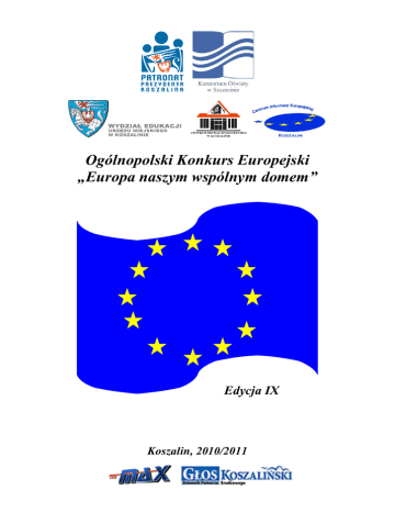Ogólnopolski Konkurs Europejski „Europa naszym wspólnym domem” Edycja IX Koszalin, 2010/2011 Regulamin Ogólnopolskiego Konkursu Europejskiego „Europa naszym wspólnym domem” pod Honorowym Patronatem Zachodniopomorskiego Kuratora Oświaty i Prezydenta Miasta Koszalina Patronat merytoryczny Regionalne Centrum Informacji Europejskiej w Koszalinie Opiekę merytoryczną nad przebiegiem Konkursu sprawuje Wydział Edukacji Urzędu Miejskiego w Koszalinie i Centrum Edukacji Nauczycieli w Koszalinie Patronat medialny Telewizja Kablowa Koszalin Glos Koszaliński Uczestnikami konkursu mogą być dzieci 5-6-letnie oraz wszyscy uczniowie klas I-III szkół podstawowych. Celem Konkursu jest: * krzewienie idei jednoczącej się Europy oraz rozwijanie w uczniach świadomości przynależności do rodziny narodów europejskich, * przybliżenie aspektów geograficznych i kulturowych Europy, * wykorzystywanie sztuki jako uniwersalnego środka porozumiewania i stworzenie możliwości prezentacji własnej twórczości dzieci, * wymiana doświadczeń metodycznych i artystycznych nauczycieli Warunkiem uczestnictwa w Konkursie jest wykonanie pracy plastycznej pod kierunkiem lub przy wsparciu rodzica, opiekuna, nauczyciela, w różnorodnych technikach. KATEGORIE PRAC: I. POLSKA W ZJEDNOCZONEJ EUROPIE – (zaprezentuj ciekawe miejsca, budowle, przyrodę itp.) praca indywidualna, technika dowolna, format A3 oprawić w białe passe partout (wg dołączonego rysunku) II. MOJA EUROPEJSKA RODZINA - praca indywidualna, technika dowolna, format A3 oprawić w białe passe partout (wg dołączonego rysunku) III. PRAWA DZIECKA W UNII EUROPEJSKIEJ– praca indywidualna, technika dowolna, format A3 oprawić w białe passe partout (wg dołączonego rysunku) Zasady uczestnictwa 1. Prace plastyczne należy wykonać w formacie A3, a następnie oprawić w białe passe partout (wg dołączonego rysunku) + 50mm FORMAT PRACY A3 + 50mm BIAŁE PASSE-PARTOUT 2. Każda praca plastyczna powinna być opatrzona kartą informacyjną zawierającą następujące dane: tytuł pracy, adres szkoły, przedszkola z kodem i telefonem, imię i nazwisko dziecka, klasa lub grupa do której uczęszcza autor, imię i nazwisko osoby wspierającej dziecko. Prace bez tych informacji nie będą oceniane. KATEGORIA PRACY TYTUŁ PRACY PIECZĄTKA SZKOŁY PRZEDSZKOLA IMIĘ I NAZWISKO DZIECKA KLASA, GRUPA IMIĘ I NAZWISKO NAUCZYCIELA RYSUNEK– DANE NA ODWROCIE PRACY UWAGA ! Prosimy o dołączenie listy uczestników Konkursu wg wzoru Lp. Imię i nazwisko Kategoria Temat pracy Klasa Szkoła uczestnika pracy Osoba wspierająca uczestnika Terminy Prace należy zakończyć i przesłać do 29 kwietnia 2011 roku na adres: Szkoła Podstawowa nr 4, ul. Podgórna 45, 75-320 Koszalin z dopiskiem Konkurs „Europa naszym wspólnym domem” (decyduje data stempla pocztowego). Nagrody Specjalnie powołana Komisja dokona oceny zgłoszonych prac. Wyniki Konkursu ogłoszone zostaną na uroczystości w dniu 20 maja 2011 roku w Szkole Podstawowej nr 4 w Koszalinie o godzinie 14.00. Uwagi końcowe Prace biorące udział w Konkursie nie będą zwracane. Laureaci Konkursu zostaną powiadomieni w terminie do 10 maja 2011 roku. Wszelkie zapytania można kierować na adres e-mail: [email protected] Serdecznie zapraszamy organizatorzy mgr Iwona Łotysz mgr Elżbieta Zwolińska