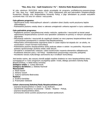 "Raz, dwa, trzy - bądź bezpieczny i Ty" – Szkolna Rada Bezpieczeństwa W roku szkolnym 2015/2016 nasza szkoła przystąpiła do programu profilaktyczno-prewencyjnego pt." Raz, dwa, trzy - bądź bezpieczny i Ty", który realizowany jest pod patronatem Świętokrzyskiego Kuratorium Oświaty oraz Wojewódzkiej Komendy Policji, a jego adresatami są przede wszystkim uczniowie klas I-III oraz ich rodzice i nauczyciele. Cele główne programu: - Ograniczenie liczby nieszczęśliwych zdarzeń z udziałem dzieci (każdy wynik pozytywny będzie zadowalający). - Podniesienie poziomu wiedzy dzieci w zakresie umiejętności unikania zagrożeń w życiu codziennym. Cele pośrednie programu: - Pogłębienie poziomu specjalistycznej wiedzy rodziców, opiekunów i nauczycieli na temat zasad zapewnienia bezpieczeństwa uczniom oraz sposobów udzielania im pomocy w różnych sytuacjach zagrożenia. - Aktywizacja rodziców i nauczycieli do wspólnych działań na rzecz poprawy bezpieczeństwa dzieci i zainicjowanie powstawania w szkołach Rad Bezpieczeństwa. - Maksymalne zminimalizowanie zagrożenia dzieci w czasie dojścia lub dojazdu do i ze szkoły, na wycieczkach i innych formach komunikacji. - Podniesienie poziomu bezpieczeństwa dzieci podczas zabaw w szkole i na podwórku. Wyuczenie postawy ograniczonego zaufania wobec osób obcych. - Utrwalenie w świadomości rodziców i dzieci konieczności noszenia elementów odblaskowych. - Przybliżenie dzieciom pracy i roli Policji - kształtowanie pozytywnego wizerunku policjanta. - Wyrabianie nawyku kulturalnego zachowania się w środkach komunikacji. Jest bardzo ważne, aby wszyscy dorośli podjęli wspólne działania na rzecz bezpieczeństwa dzieci, wymagających w ruchu drogowym szczególnej opieki i troski, dlatego powołano Szkolną Radę Bezpieczeństwa, w skład której wchodzą: Zastępca wójta: p. Łukasz Barwinek Zastępca dyrektora: p. Elżbieta Rachwał Nauczyciele: p. Edyta Szwed p. Adriana Tarach p. Justyna Golmento-Bobrowska Rodzice: p. Ewelina Kamińska p. Przemysław Giełżecki Celem utworzonej Szkolnej Rady Bezpieczeństwa jest: - poprawa bezpieczeństwa w szkole i w jej okolicach, - zacieśnienie współpracy na poziomie – Szkoła – Rodzice – Policja, - poprawa bezpieczeństwa dzieci, - promowanie wśród uczniów pozytywnych postaw społecznych.