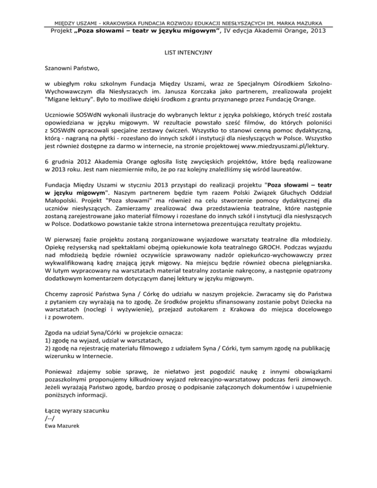 MIĘDZY USZAMI - KRAKOWSKA FUNDACJA ROZWOJU EDUKACJI NIESŁYSZĄCYCH IM. MARKA MAZURKA Projekt „Poza słowami – teatr w języku migowym”, IV edycja Akademii Orange, 2013 LIST INTENCYJNY Szanowni Państwo, w ubiegłym roku szkolnym Fundacja Między Uszami, wraz ze Specjalnym Ośrodkiem SzkolnoWychowawczym dla Niesłyszacych im. Janusza Korczaka jako partnerem, zrealizowała projekt "Migane lektury". Było to możliwe dzięki środkom z grantu przyznanego przez Fundację Orange. Uczniowie SOSWdN wykonali ilustracje do wybranych lektur z języka polskiego, których treść została opowiedziana w języku migowym. W rezultacie powstało sześć filmów, do których poloniści z SOSWdN opracowali specjalne zestawy ćwiczeń. Wszystko to stanowi cenną pomoc dydaktyczną, którą - nagraną na płytki - rozesłano do innych szkół i instytucji dla niesłyszących w Polsce. Wszystko jest również dostępne za darmo w internecie, na stronie projektowej www.miedzyuszami.pl/lektury. 6 grudnia 2012 Akademia Orange ogłosiła listę zwycięskich projektów, które będą realizowane w 2013 roku. Jest nam niezmiernie miło, że po raz kolejny znaleźliśmy się wśród laureatów. Fundacja Między Uszami w styczniu 2013 przystąpi do realizacji projektu "Poza słowami – teatr w języku migowym". Naszym partnerem będzie tym razem Polski Związek Głuchych Oddział Małopolski. Projekt "Poza słowami" ma również na celu stworzenie pomocy dydaktycznej dla uczniów niesłyszących. Zamierzamy zrealizować dwa przedstawienia teatralne, które następnie zostaną zarejestrowane jako materiał filmowy i rozesłane do innych szkół i instytucji dla niesłyszących w Polsce. Dodatkowo powstanie także strona internetowa prezentująca rezultaty projektu. W pierwszej fazie projektu zostaną zorganizowane wyjazdowe warsztaty teatralne dla młodzieży. Opiekę reżyserską nad spektaklami obejmą opiekunowie koła teatralnego GROCH. Podczas wyjazdu nad młodzieżą będzie również oczywiście sprawowany nadzór opiekuńczo-wychowawczy przez wykwalifikowaną kadrę znającą język migowy. Na miejscu będzie również obecna pielęgniarska. W lutym wypracowany na warsztatach materiał teatralny zostanie nakręcony, a następnie opatrzony dodatkowym komentarzem dotyczącym danej lektury w języku migowym. Chcemy zaprosić Państwa Syna / Córkę do udziału w naszym projekcie. Zwracamy się do Państwa z pytaniem czy wyrażają na to zgodę. Ze środków projektu sfinansowany zostanie pobyt Dziecka na warsztatach (noclegi i wyżywienie), przejazd autokarem z Krakowa do miejsca docelowego i z powrotem. Zgoda na udział Syna/Córki w projekcie oznacza: 1) zgodę na wyjazd, udział w warsztatach, 2) zgodę na rejestrację materiału filmowego z udziałem Syna / Córki, tym samym zgodę na publikację wizerunku w Internecie. Ponieważ zdajemy sobie sprawę, że niełatwo jest pogodzić naukę z innymi obowiązkami pozaszkolnymi proponujemy kilkudniowy wyjazd rekreacyjno-warsztatowy podczas ferii zimowych. Jeżeli wyrażają Państwo zgodę, bardzo proszę o podpisanie załączonych dokumentów i uzupełnienie poniższych informacji. Łączę wyrazy szacunku /--/ Ewa Mazurek