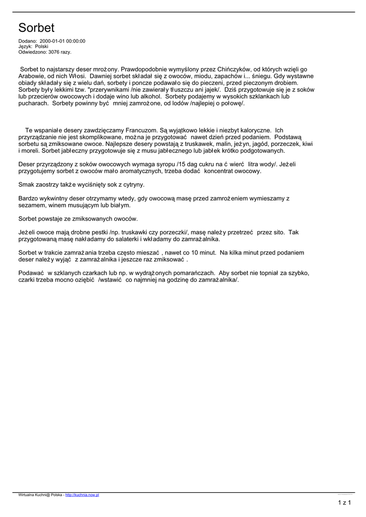 Sorbet Dodano: 2000-01-01 00:00:00 Język: Polski Odwiedzono: 3076 razy. Sorbet to najstarszy deser mrożony. Prawdopodobnie wymyślony przez Chińczyków, od których wzięli go Arabowie, od nich Włosi. Dawniej sorbet składał się z owoców, miodu, zapachów i... śniegu. Gdy wystawne obiady składały się z wielu dań, sorbety i poncze podawało się do pieczeni, przed pieczonym drobiem. Sorbety były lekkimi tzw. "przerywnikami /nie zawierały tłuszczu ani jajek/. Dziś przygotowuje się je z soków lub przecierów owocowych i dodaje wino lub alkohol. Sorbety podajemy w wysokich szklankach lub pucharach. Sorbety powinny być mniej zamrożone, od lodów /najlepiej o połowę/. Te wspaniałe desery zawdzięczamy Francuzom. Są wyjątkowo lekkie i niezbyt kaloryczne. Ich przyrządzanie nie jest skomplikowane, można je przygotować nawet dzień przed podaniem. Podstawą sorbetu są zmiksowane owoce. Najlepsze desery powstają z truskawek, malin, jeżyn, jagód, porzeczek, kiwi i moreli. Sorbet jabłeczny przygotowuje się z musu jabłecznego lub jabłek krótko podgotowanych. Deser przyrządzony z soków owocowych wymaga syropu /15 dag cukru na ćwierć litra wody/. Jeżeli przygotujemy sorbet z owoców mało aromatycznych, trzeba dodać koncentrat owocowy. Smak zaostrzy także wyciśnięty sok z cytryny. Bardzo wykwintny deser otrzymamy wtedy, gdy owocową masę przed zamrożeniem wymieszamy z sezamem, winem musującym lub białym. Sorbet powstaje ze zmiksowanych owoców. Jeżeli owoce mają drobne pestki /np. truskawki czy porzeczki/, masę należy przetrzeć przez sito. Tak przygotowaną masę nakładamy do salaterki i wkładamy do zamrażalnika. Sorbet w trakcie zamrażania trzeba często mieszać, nawet co 10 minut. Na kilka minut przed podaniem deser należy wyjąć z zamrażalnika i jeszcze raz zmiksować. Podawać w szklanych czarkach lub np. w wydrążonych pomarańczach. Aby sorbet nie topniał za szybko, czarki trzeba mocno oziębić /wstawić co najmniej na godzinę do zamrażalnika/. Wirtualna Kuchni@ Polska - http://kuchnia.now.pl przepis nr 611, plik wygenerowano 2017.03.07 17:36 1z1