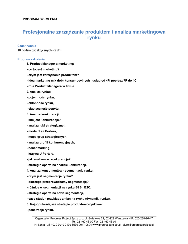 PROGRAM SZKOLENIA Profesjonalne zarządzanie produktem i analiza marketingowa rynku Czas trwania 16 godzin dydaktycznych - 2 dni Program szkolenia 1. Product Manager a marketing: - co to jest marketing? - czym jest zarządzanie produktem? - idea marketing mix dóbr konsumpcyjnych i usług od 4P, poprzez 7P do 4C, - rola Product Managera w firmie. 2. Analiza rynku: - pojemność rynku, - chłonność rynku, - elastyczność popytu. 3. Analiza konkurencji: - kim jest konkurencja? - analiza luki strategicznej, - model 5 sił Portera, - mapa grup strategicznych, - analiza profili konkurencyjnych, - benchmarking, - krzywa U Portera, - jak analizować konkurencję? - strategie oparte na analizie konkurencji. 4. Analiza konsumentów - segmentacja rynku: - czym jest segmentacja rynku? - dlaczego przeprowadzamy segmentację? - różnice w segmentacji na rynku B2B i B2C, - strategie oparte na bazie segmentacji, - case study - przykłady zmian na rynku (dynamiki rynku). 5. Najpopularniejsze strategie produktowo-rynkowe: - penetracja rynku, _________________________________________________________________________________ Organizator Progress Project Sp. z o. o. ul. Światowa 22, 02-229 Warszawa NIP: 525-238-26-47 Tel. 22 460 46 00 Fax. 22 460 46 04 Nr konta : 36 1030 0019 0109 8530 0047 0604 www.progressproject.pl [email protected] PROGRAM SZKOLENIA - rozwój rynku, - rozwój produktu, - strategia dywersyfikacji, - typowe kierunki zmian w układzie produkt-rynek 6. Produkt: - z czego składa się produkt? - kryteria podziału produktów, - pozycjonowanie produktów, - mapa percepcji produktów, - jak ważna jest satysfakcja klienta? - metody pomiaru satysfakcji klienta. 7. Postrzeganie produktów: - czym jest marka? - jak dotąd budowaliśmy markę? - jak teraz budujemy markę? 8. Analiza portfela produktów: - asortyment, jego szerokość i głębokość, - macierz BCG, - macierz ADL, - macierz GE-McKinseya. 9. Zarządzanie produktem w cyklu życia produktu - co to jest cykl życia produktu, jakie może mieć zakłócenia? - kształtowanie portfela produkcji w czasie, - wprowadzanie nowego produktu, - co jest nowym produktem, - etapy poprzedzające wprowadzanie nowego produktu, - strategie wprowadzania nowego produktu, - działania stosowane w fazie wzrostu, - działania stosowane w fazie dojrzałości (modyfikacja rynku, produktu, marketing mix), - strategie fazy schyłku. 10. Kanał marketingowy: - czym jest kanał marketingowy? - kryteria wyboru kanałów marketingowych, _________________________________________________________________________________ Organizator Progress Project Sp. z o. o. ul. Światowa 22, 02-229 Warszawa NIP: 525-238-26-47 Tel. 22 460 46 00 Fax. 22 460 46 04 Nr konta : 36 1030 0019 0109 8530 0047 0604 www.progressproject.pl [email protected] PROGRAM SZKOLENIA - intensywność dystrybucji. 11. Cena: - czynniki mające wpływ na decyzje cenowe, - strategie cenowe, - różnicowanie cen, - case study - wyznaczenie ceny produktu techniką PSM. 12. Promocja: - czym jest promocja? - narzędzia promocji, - kreacja przekazów promocyjnych, - model AIDA - AIDACS, - środki i nośniki reklamy, - dobór efektywnej reklamy. 13. Najczęstsze strategie rynkowe: - lider rynkowy, - agresywny uczestnik rynku, - spokojny uczestnik rynku. 14. Case study - prognozowanie sprzedaży: - prognozowanie naiwne, - metoda naiwna z poprawką, - metoda średniej zwykłej, - średnia ważona, - metoda naiwna z uwzględnieniem sezonowości. Harmonogram Harmonogram Rejestracja uczestników Zajęcia Przerwa Zajęcia Obiad Zajęcia Przerwa Zajęcia Dzień 1 9:45 - 10:00 10:00 - 11:00 11:00 - 11:15 11:15 - 13:00 13:00 - 13:45 13:45 - 15:00 15:00 - 15:10 15:10 - 17:00 Dzień 2 9:00 - 11:00 11:00 - 11:15 11:15 - 13:00 13:00 - 13:45 13:45 - 15:00 15:00 - 15:10 15:10 - 16:00 Koszt inwestycji W celu poznania szczegółów, zapraszamy do kontaktu. _________________________________________________________________________________ Organizator Progress Project Sp. z o. o. ul. Światowa 22, 02-229 Warszawa NIP: 525-238-26-47 Tel. 22 460 46 00 Fax. 22 460 46 04 Nr konta : 36 1030 0019 0109 8530 0047 0604 www.progressproject.pl [email protected] PROGRAM SZKOLENIA Informacje dodatkowe W przypadku zainteresowania jednym szkoleniem większej liczby osób (powyżej 3-4) z jednej firmy jesteśmy w stanie zorganizować dodatkowe terminy w dogodnej lokalizacji przy założeniu, że szkolenie będzie zaplanowane z co najmniej półtora miesięcznym wyprzedzeniem. Każdy temat możemy również przygotować według Państwa wymagań oraz potrzeb firmy w formie szkolenia dedykowanego, wyjazdu integracyjnego lub doradztwa. Zapraszamy do kontaktu, Progress Project sp. z o.o. ul. Światowa 22 02-229 Warszawa Tel. 22 460 46 00 Fax. 22 460 46 04 e-mail: [email protected] www.progressproject.pl _________________________________________________________________________________ Organizator Progress Project Sp. z o. o. ul. Światowa 22, 02-229 Warszawa NIP: 525-238-26-47 Tel. 22 460 46 00 Fax. 22 460 46 04 Nr konta : 36 1030 0019 0109 8530 0047 0604 www.progressproject.pl [email protected]