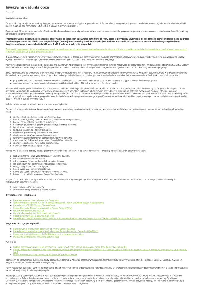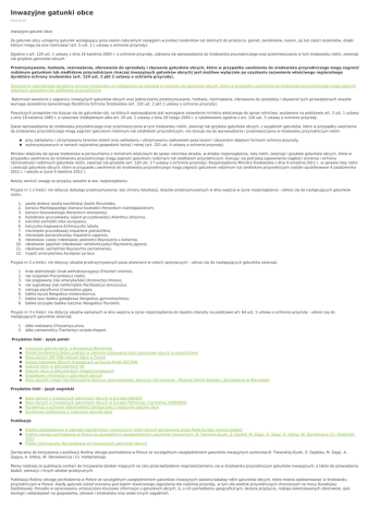 Inwazyjne gatunki obce 2013-10-29 Inwazyjne gatunki obce Za gatunek obcy uznajemy gatunek występujący poza swoim naturalnym zasięgiem w postaci osobników lub zdolnych do przeżycia: gamet, zarodników, nasion, jaj lub części osobników, dzięki którym mogą się one rozmnażać (art. 5 ust. 1 c ustawy o ochronie przyrody). Zgodnie z art. 120 ust. 1 ustawy z dnia 16 kwietnia 2004 r. o ochronie przyrody, zabrania się wprowadzania do środowiska przyrodniczego oraz przemieszczania w tym środowisku roślin, zwierząt lub grzybów gatunków obcych. Przetrzymywanie, hodowla, rozmnażanie, oferowanie do sprzedaży i zbywanie gatunków obcych, które w przypadku uwolnienia do środowiska przyrodniczego mogą zagrozić rodzimym gatunkom lub siedliskom przyrodniczym (inaczej inwazyjnych gatunków obcych) jest możliwe wyłącznie po uzyskaniu zezwolenia właściwego regionalnego dyrektora ochrony środowiska (art. 120 ust. 2 pkt 2 ustawy o ochronie przyrody). Zezwolenie regionalnego dyrektora ochrony środowiska na odstępstwa od zakazów w stosunku do gatunków obcych, które w przypadku uwolnienia do środowiska przyrodniczego mogą zagrozić rodzimym gatunkom lub siedliskom przyrodniczym Natomiast wwożenie z zagranicy inwazyjnych gatunków obcych oraz jednocześnie przetrzymywanie, hodowla, rozmnażanie, oferowanie do sprzedaży i zbywanie tych sprowadzonych okazów wymaga zezwolenia Generalnego Dyrektora Ochrony Środowiska (art. 120 ust. 2 pkt 1 ustawy o ochronie przyrody). Powyższych przepisów nie stosuje się do gatunków ryb, na których wprowadzanie jest wymagane zezwolenie ministra właściwego do spraw rolnictwa, wydawane na podstawie art. 3 ust. 1 ustawy z dnia 18 kwietnia 1985 r. o rybactwie śródlądowym albo art. 29 ust. 1 ustawy z dnia 19 lutego 2004 r. o rybołówstwie zgodnie z art. 120 ust. 3 ustawy o ochronie przyrody. Zakaz wprowadzania do środowiska przyrodniczego oraz przemieszczania w tym środowisku roślin, zwierząt lub grzybów gatunków obcych, z wyjątkiem gatunków, które w przypadku uwolnienia do środowiska przyrodniczego mogą zagrozić gatunkom rodzimym lub siedliskom przyrodniczym, nie stosuje się do wprowadzania i przemieszczania w środowisku przyrodniczym roślin: przy zakładaniu i utrzymywaniu terenów zieleni oraz zakładaniu i utrzymywaniu zadrzewień poza lasami i obszarami objętymi formami ochrony przyrody, wykorzystywanych w ramach racjonalnej gospodarki leśnej i rolnej (art. 120 ust. 4 ustawy o ochronie przyrody). Minister właściwy do spraw środowiska w porozumieniu z ministrem właściwym do spraw rolnictwa określa, w drodze rozporządzenia, listę roślin, zwierząt i grzybów gatunków obcych, które w przypadku uwolnienia do środowiska przyrodniczego mogą zagrozić gatunkom rodzimym lub siedliskom przyrodniczym, kierując się potrzebą zapewnienia ciągłości istnienia i ochrony różnorodności rodzimych gatunków roślin, zwierząt lub grzybów (art. 120 ust. 2 f ustawy o ochronie przyrody). Rozporządzenie Ministra Środowiska z dnia 9 września 2011 r. w sprawie listy roślin i zwierząt gatunków obcych, które w przypadku uwolnienia do środowiska przyrodniczego mogą zagrozić gatunkom rodzimym lub siedliskom przyrodniczym zostało opublikowane 4 października 2011 r. i weszło w życie 5 kwietnia 2012 r. Należy zwrócić uwagę na przypisy zawarte w ww. rozporządzeniu. Przypis nr 1 o treści: nie dotyczy dalszego przetrzymywania, bez zmiany lokalizacji, okazów przetrzymywanych w dniu wejścia w życie rozporządzenia - odnosi się do następujących gatunków roślin: 1. 2. 3. 4. 5. 6. 7. 8. 9. 10. 11. 12. azolla drobna (azolla karolińska) Azolla filiculoides, barszcz Mantegazziego (barszcz kaukaski) Heracleum mantegazzianum, barszcz Sosnowskiego Heracleum sosnowskyi, bożodrzew gruczołowaty (ajlant gruczołkowaty) Ailanthus altissima, kolcolist zachodni Ulex europaeus, kolczurka klapowana Echinocystis lobata, niecierpek gruczołowaty Impatiens glandulifera, niecierpek pomarańczowy Impatiens capensis, rdestowiec czeski (rdestowiec pośredni) Reynoutria x bohemia, rdestowiec japoński (rdestowiec ostrokończysty) Reynoutria japonia, rdestowiec sachaliński Reynoutria sachalinensis, trojeść amerykańska Asclepias syriaca. Przypis nr 2 o treści: nie dotyczy okazów przetrzymywanych poza akwenami w celach spożywczych - odnosi się do następujących gatunków zwierząt: 1. 2. 3. 4. 5. 6. 7. 8. krab wełnistoręki (krab wełnistoszczypcy) Eriocheir sinensis, rak luizjański Procambarus clarkii, rak pręgowany (rak amerykański) Orconectes limosus, rak sygnałowy (rak kalifornijski) Pacifastacus leniusculus, ostryga pacyficzna Crassostrea gigas, babka bycza Neogobius melanostomus, babka łysa (babka gołogłowa) Neogobius gymnotrachelus, babka szczupła (babka rzeczna) Neogobius fluviatilis. Przypis nr 3 o treści: nie dotyczy okazów wpisanych w dniu wejścia w życie rozporządzenia do rejestru starosty na podstawie art. 64 ust. 1 ustawy o ochronie przyrody - odnosi się do następujących gatunków zwierząt: 1. żółw malowany Chrysemys picta, 2. żółw czerwonolicy Trachemys scripta elegant. Przydatne linki - język polski Inwazyjne gatunki obce, a Konwencja Berneńska Wyniki konferencji Dobre praktyki w zakresie stosowania roślin gatunków obcych w ogrodnictwie Baza danych IOP PAN Gatunki Obce w Polsce Księga Gatunków Obcych Inwazyjnych w Faunie Polski IOP PAN Gatunki obce w dokumentach UE Gatunki obce w dokumentach międzynarodowych Dodatkowe informacje o gatunkach obcych Baza danych i mapy rozmieszczenia barszczu Sosnowskiego i barszczu olbrzymiego - Wyższej Szkoły Ekologii i Zarządzania w Warszawie Przydatne linki - język angielski Baza danych o inwazyjnych gatunkach obcych w Europie (DAISIE) Baza danych o inwazyjnych gatunkach obcych w Europie Północnej i Centralnej (NOBANIS) Konwencja o ochronie różnorodności biologicznej a inwazyjne gatunki obce Dyrektywa siedliskowa a inwazyjne gatun