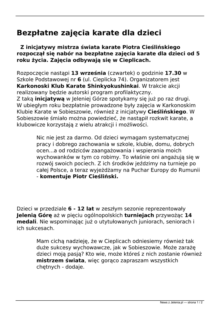 Bezpłatne zajęcia karate dla dzieci Z inicjatywy mistrza świata karate Piotra Cieślińskiego rozpoczął się nabór na bezpłatne zajęcia karate dla dzieci od 5 roku życia. Zajęcia odbywają się w Cieplicach. Rozpoczęcie nastąpi 13 września (czwartek) o godzinie 17.30 w Szkole Podstawowej nr 6 (ul. Cieplicka 74). Organizatorem jest Karkonoski Klub Karate Shinkyokushinkai. W trakcie akcji realizowany będzie autorski program profilaktyczny. Z taką inicjatywą w Jeleniej Górze spotykamy się już po raz drugi. W ubiegłym roku bezpłatnie prowadzone były zajęcia w Karkonoskim Klubie Karate w Sobieszowie, również z inicjatywy Cieślińskiego. W Sobieszowie śmiało można powiedzieć, że nastąpił rozkwit karate, a klubowicze korzystają z wielu atrakcji i możliwości. Nic nie jest za darmo. Od dzieci wymagam systematycznej pracy i dobrego zachowania w szkole, klubie, domu, dobrych ocen...a od rodziców zaangażowania i wspierania moich wychowanków w tym co robimy. To właśnie oni angażują się w rozwój swoich pociech. Z ich środków jeździmy na turnieje po całej Polsce, a teraz wyjeżdżamy na Puchar Europy do Rumunii - komentuje Piotr Cieśliński. Dzieci w przedziale 6 - 12 lat w zeszłym sezonie reprezentowały Jelenią Górę aż w pięciu ogólnopolskich turniejach przywożąc 14 medali. Nie wspominając już o utytułowanych juniorach, seniorach i ich sukcesach. Mam cichą nadzieję, że w Cieplicach odniesiemy również tak duże sukcesy wychowawcze, jak w Sobieszowie. Może zarażę dzieci moją pasją? Kto wie, może któreś z nich zostanie również mistrzem świata, więc gorąco zapraszam wszystkich chętnych - dodaje. News z Jelenia.pl — strona 1 / 2 W kadrze klubu znajdziemy specjalistów w zakresie psychologii i pedagogiki, którzy koordynują realizacje klubowych programów integracyjnych i profilaktycznych dla dzieci i ich rodzin. Więcej informacji na: www.karatejeleniagora.pl Link do oryginalnej publikacji: http://jelenia.pl/Bezplatne_zajecia_karate_dla_dzieci_n1082.html Wygenerowano: 07/03/2017 17:09:07 © Jelenia.pl News z Jelenia.pl — strona 2 / 2 Powered by TCPDF (www.tcpdf.org)
