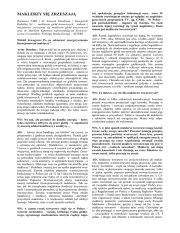 MAKLERZY SIĘ ZRZESZAJĄ Rozmowa CIRE z dr Arturem Dembnym z Energetyki Kaliskiej SA – maklerem giełd towarowych, jednym z inicjatorów zrzeszenia się maklerów giełd towarowych oraz dr Markiem Kuteniem reprezentującym Stowarzyszenie Uczestników Wolnego Rynku Energii – SUWRE. Witold Szwagrun: Po co sektorowi energetycznemu licencjonowani maklerzy? Artur Dembny: Odpowiedź na to pytanie jest złożona i składa się co najmniej z dwóch części. Po pierwsze, wymagają tego przepisy prawne. Istnieje przecież Ustawa o giełdach towarowych, która – podobnie jak ma to miejsce w wielu krajach o rozwiniętej gospodarce rynkowej – wprowadza instytucję giełdy towarowej, na której w sposób zorganizowany obraca się tzw. towarami giełdowymi. Nie wszystko może być towarem giełdowym - ustawa to ściśle precyzuje, ale będąca akurat przedmiotem naszego zainteresowania energia elektryczna niewątpliwie nim jest. Do przeprowadzania transakcji na giełdzie towarowej potrzebni są oczywiście odpowiednio umocowani ludzie, którzy posiadanym certyfikatem gwarantują zachowanie odpowiedniego standardu przeprowadzania transakcji. Według polskich regulacji są nimi maklerzy giełd towarowych. I właśnie wspomniana gwarancja zachowania standardów handlu, wynikająca z wiedzy, potwierdzonej zdaniem trudnego egzaminu, jest drugą częścią mojej odpowiedzi. Posiadanie licencji, to świadectwo przynależności do swego rodzaju elity, nie tylko zawodowej, ale także intelektualnej. WS: No tak, ale przecież do handlu energią – który tylko częściowo odbywa się przez giełdę – w zupełności wystarczą zdolni handlowcy i analitycy... AD: ... którzy teraz handlują „na telefon” na czymś, co przypomina z grubsza rynek pozagiełdowy. Rynek giełdowy zaś, ciągle jeszcze jest w fazie rozwojowej i skupia znacznie mniej obrotu. Ale pewnie kiedyś nastąpi zmiana i sytuacja się odwróci. Dodatkowo, w momencie gdy Ustawa o giełdach towarowych zacznie już w pełni obowiązywać, maklerzy staną się naprawdę niezbędni. Zresztą nie wydziwiajmy – w wielu dziedzinach naszego życia są potrzebne wykwalifikowane kadry: w sądach sądzą sędziowie – a nie amatorzy, w szpitalach leczą lekarze – a nie znachorzy. Dlaczego więc na giełdzie nie mieliby grać maklerzy? Podobnie zresztą jest na rynku papierów wartościowych. Zawód maklera papierów wartościowych funkcjonuje w Polsce już od 12 lat i nikt nie kwestionuje sensu jego istnienia oraz faktu, że w celu uczestnictwa w Giełdzie Papierów Wartościowych domy maklerskie muszą zatrudniać licencjonowanych maklerów. Tak samo, jak do zarządzania majątkiem funduszy inwestycyjnych i emerytalnych potrzebni są licencjonowani doradcy inwestycyjni. Zresztą wspomniani przez Pana zdolni handlowcy i analitycy stanowią naturalny „narybek” przyszłych maklerów i w większości zdołali już zdobyć licencje. Mówimy więc o tych samych osobach. WS: A zatem rynek towarowy staje się w Polsce – wzorem zachodnim – częścią wielkiego rynku giełdowego, ogromnego mechanizmu, którym rządzą: kapi- tał, spekulacja, przepływ informacji oraz... stres. W wydaniu rozwiniętym można go oglądać na angielskojęzycznych programach TV, np. CNBC. W Polsce jak powiedzieliśmy - dopiero się rozwija. Na razie znacznie lepiej rozwinął się rynek kapitałowy. Dużo mamy już maklerów towarowych? AD: Rynek kapitałowy rozwinął się lepiej, bo wystartował w 1991 roku. Obecnie jest więc o kilka „epok” dalej niż towarowy, do uporządkowania którego szykowano się od kilku lat. Doświadczenia i regulacje rynku kapitałowego posłużyły do zbudowania zrębów rynku towarowego. Grono maklerów giełd towarowych stanowi obecnie grupa nieco ponad 50 osób. Co ciekawe, prawie wszyscy pochodzą z sektora energetycznego. To znaczy, że ta branża najpoważniej i najsprawniej podeszła do wypełnienia wymogów przepisów giełdowych. Nie można natomiast tego powiedzieć o sektorze rolniczym, którzy jest przecież znacznie „obszerniejszy” i bardziej doświadczony w wolnym handlu. Tymczasem nie ma ani maklerów, ani chociażby jednej giełdy, która spełniałaby wymogi ustawy. Okazało się więc, że - jak na razie - maklerów towarowych można utożsamiać jedynie z rynkiem energetycznym, a ściśle – rynkiem energii elektrycznej WS: To dobrze, czy źle dla maklerów towarowych? AD: Rodzi to kilka ciekawych konsekwencji. Jesteśmy przede wszystkim pionierami tego zawodu. Pracując w czasie budowy i rozwoju zorganizowanego rynku towarowego, zdajemy sobie sprawę, że od naszej postawy i zaangażowania będzie zależeć ukształtowanie zasad jego uprawiania w przyszłości. Także w stosunku do maklerów z sektorów innych niż energetyczne. Mamy więc odpowiedzialne zadanie do wykonania. WS: A w jaki sposób maklerzy towarowi mogą kształtować cechy swego zawodu? Przecież istnieją przepisy prawne które powinny wystarczyć. Poza tym, prawie wszyscy są zatrudnieni w spółkach energetycznych, a więc pracują na rzecz wypełnienia strategii swoich pracodawców. Zawód maklera towarowego nie jest w Polsce tzw. „wolnym zawodem”. Maklerzy nie mają swoich kancelarii i nie działają na rzecz klientów zewnętrznych, tylko pracują na etacie. AD: Maklerzy towarowi (w przeciwieństwie do maklerów papierów wartościowych) mogą pracować jako maklerzy niezależni – czyli na własny rachunek. A kształtować ramy wykonywania swojego zawodu możemy tylko w jeden sposób: poprzez powołanie stowarzyszenia zawodowego (nie mylić ze związkiem zawodowym !). Celem takiego stowarzyszenia nie jest oczywiście li tylko samo zrzeszenie się, ale przede wszystkim zagregowanie sił i wspólne działanie. A jest się czym zająć! Dobry zwyczaj rynków giełdowych mówi, że maklerzy współdziałają z Regulatorami (w Polsce z Komisją Papierów Wartościowych i Giełd) przy budowaniu i rozwijaniu narzędzi oraz organiz