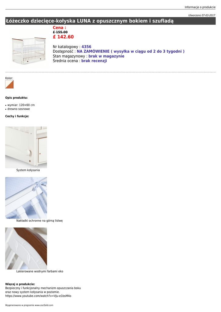 Informacje o produkcie Utworzono 07-03-2017 Łóżeczko dziecięce-kołyska LUNA z opuszcznym bokiem i szufladą Cena : £ 155.00 £ 142.60 Nr katalogowy : 4356 Dostępność : NA ZAMÓWIENIE ( wysyłka w ciągu od 2 do 3 tygodni ) Stan magazynowy : brak w magazynie Średnia ocena : brak recenzji Kolor: Opis produktu: ● ● wymiar: 120×60 cm drewno sosnowe Cechy i funkcje: System kołysania Nakładki ochronne na górną listwę Lakierowane wodnymi farbami eko Więcej o produkcie: Bezpieczny i funkcjonalny mechanizm opuszczania boku oraz nowy system kołysania w poziomie. https://www.youtube.com/watch?v=VJu-e1bsM4o Wygenerowano w programie www.oscGold.com Dostępne opcje Łóżeczko dziecięce-kołyska LUNA z opuszcznym bokiem i szufladą » OPCJA: Bez materaca, Materac z włosiem końskim (+£ 47.00), Materac lateksowy (+£ 44.00), Materac podwójny kokos (+£ 37.00), Materac pojedyńczy kokos (+£ 30.00), Materac pianka (+£ 19.00), Materac do łóżeczek turystycznych (+£ 24.00).