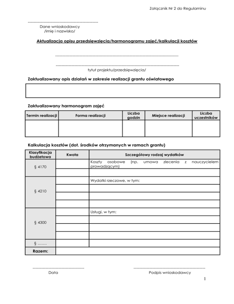 Załącznik Nr 2 do Regulaminu ------------------------------------------------Dane wnioskodawcy /imię i nazwisko/ Aktualizacja opisu przedsięwzięcia/harmonogramu zajęć/kalkulacji kosztów --------------------------------------------------------------------------------------------------------------------------------------------------------------------------tytuł projektu/przedsięwzięcia/ Zaktualizowany opis działań w zakresie realizacji grantu oświatowego Zaktualizowany harmonogram zajęć Termin realizacji Forma realizacji Liczba godzin Miejsce realizacji Liczba uczestników Kalkulacja kosztów (dot. środków otrzymanych w ramach grantu) Klasyfikacja budżetowa Kwota Szczegółowy rodzaj wydatków Koszty osobowe prowadzącym) § 4170 (np. umowa zlecenia z nauczycielem Wydatki rzeczowe, w tym: § 4210 Usługi, w tym: § 4300 § ……. Razem: -----------------------------------Data -------------------------------------------------Podpis wnioskodawcy 1